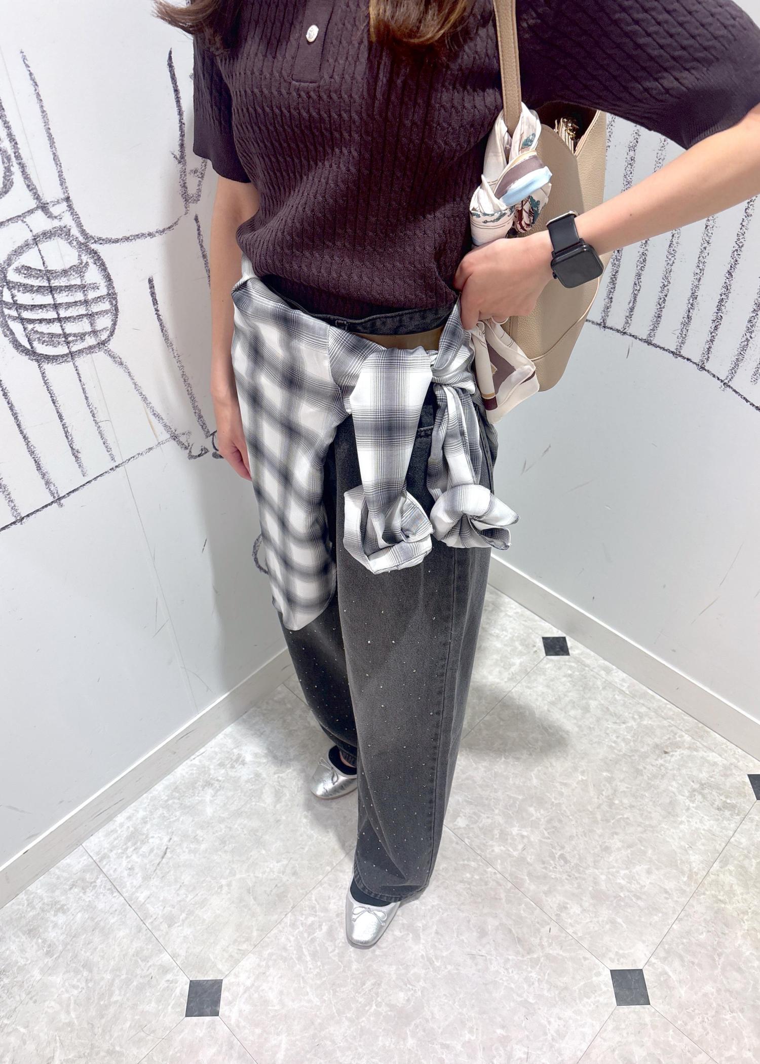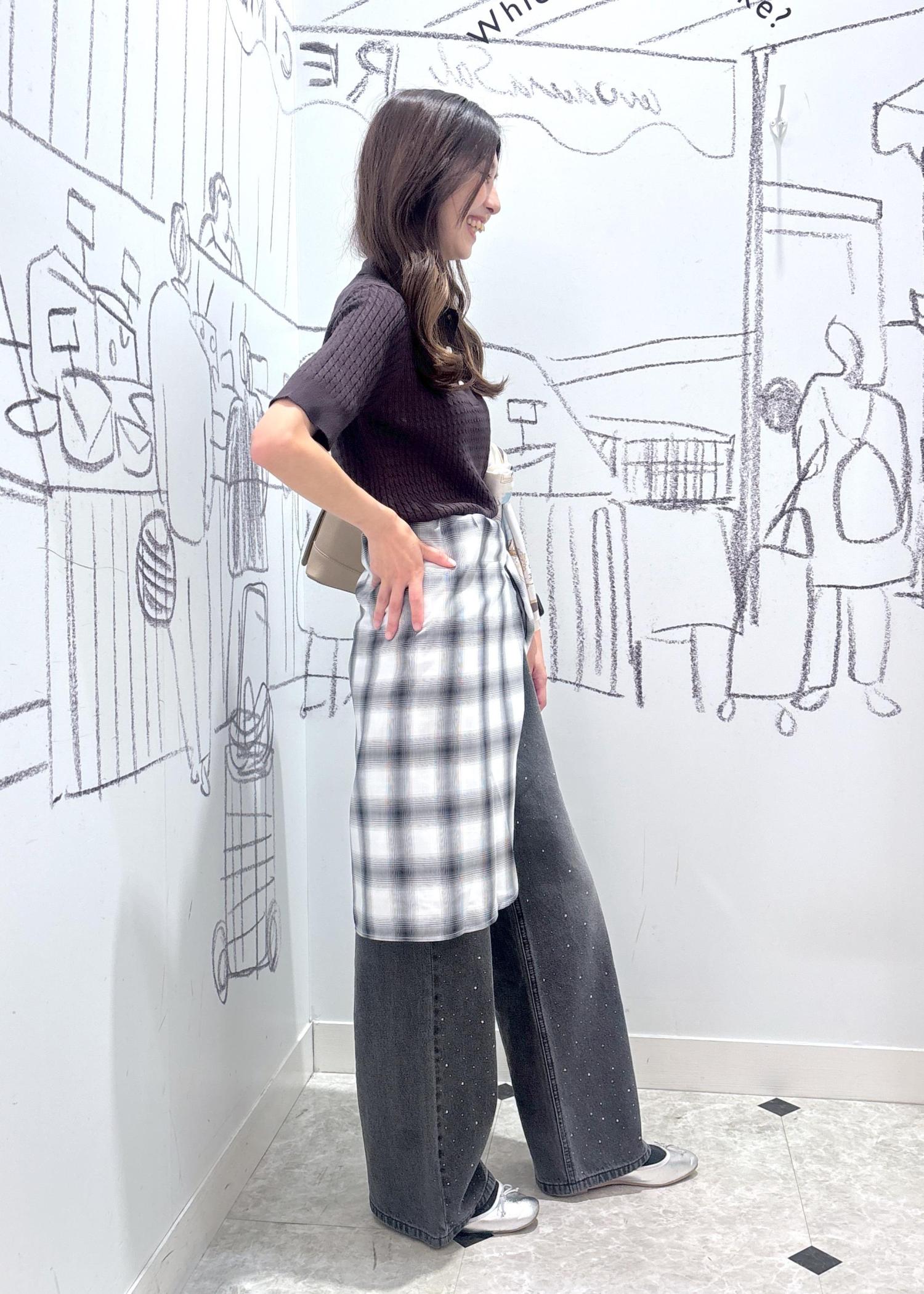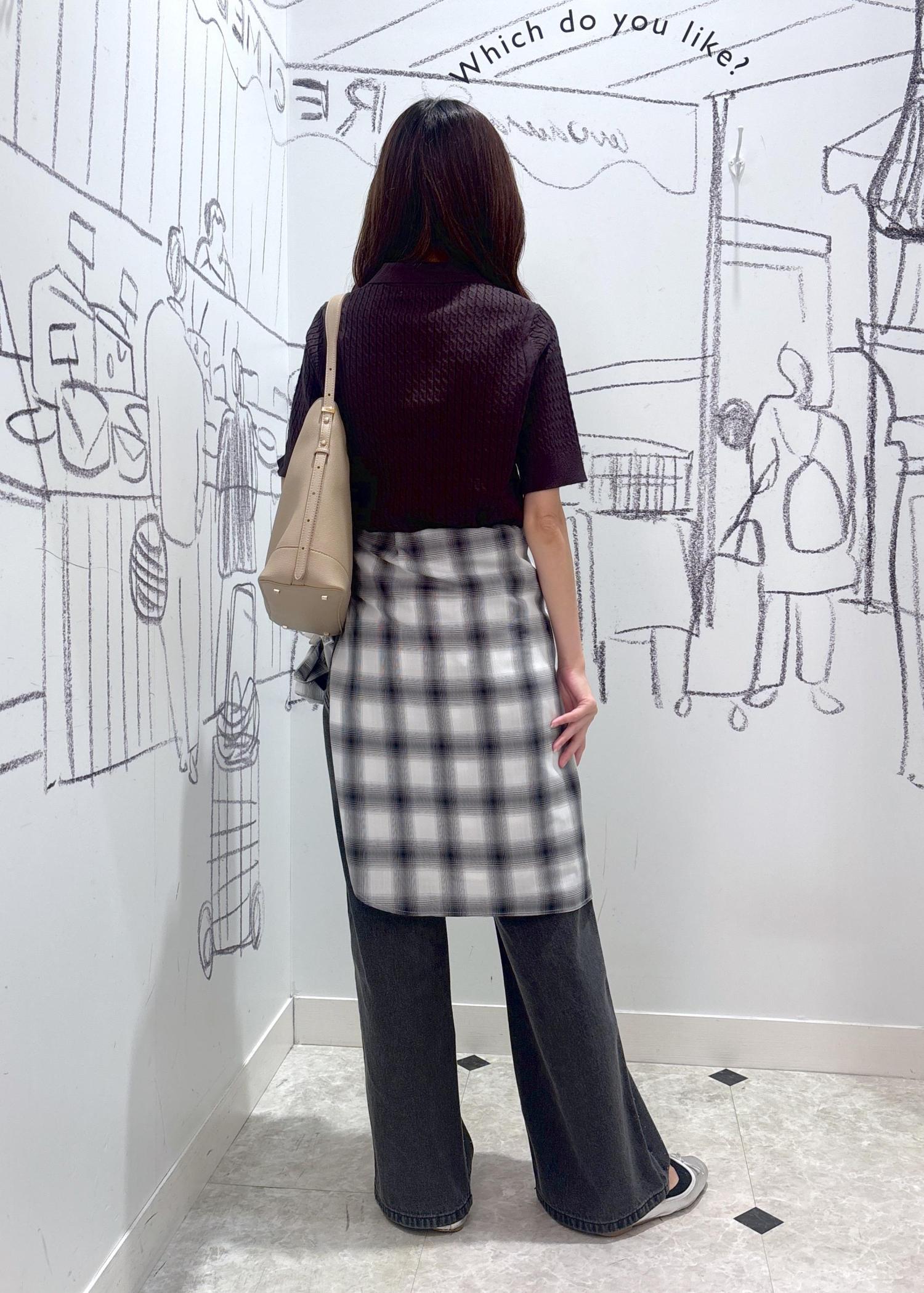 シンプルなので、チェックシャツを腰巻きにしてコーディネートのワンポイントになるようにしました。