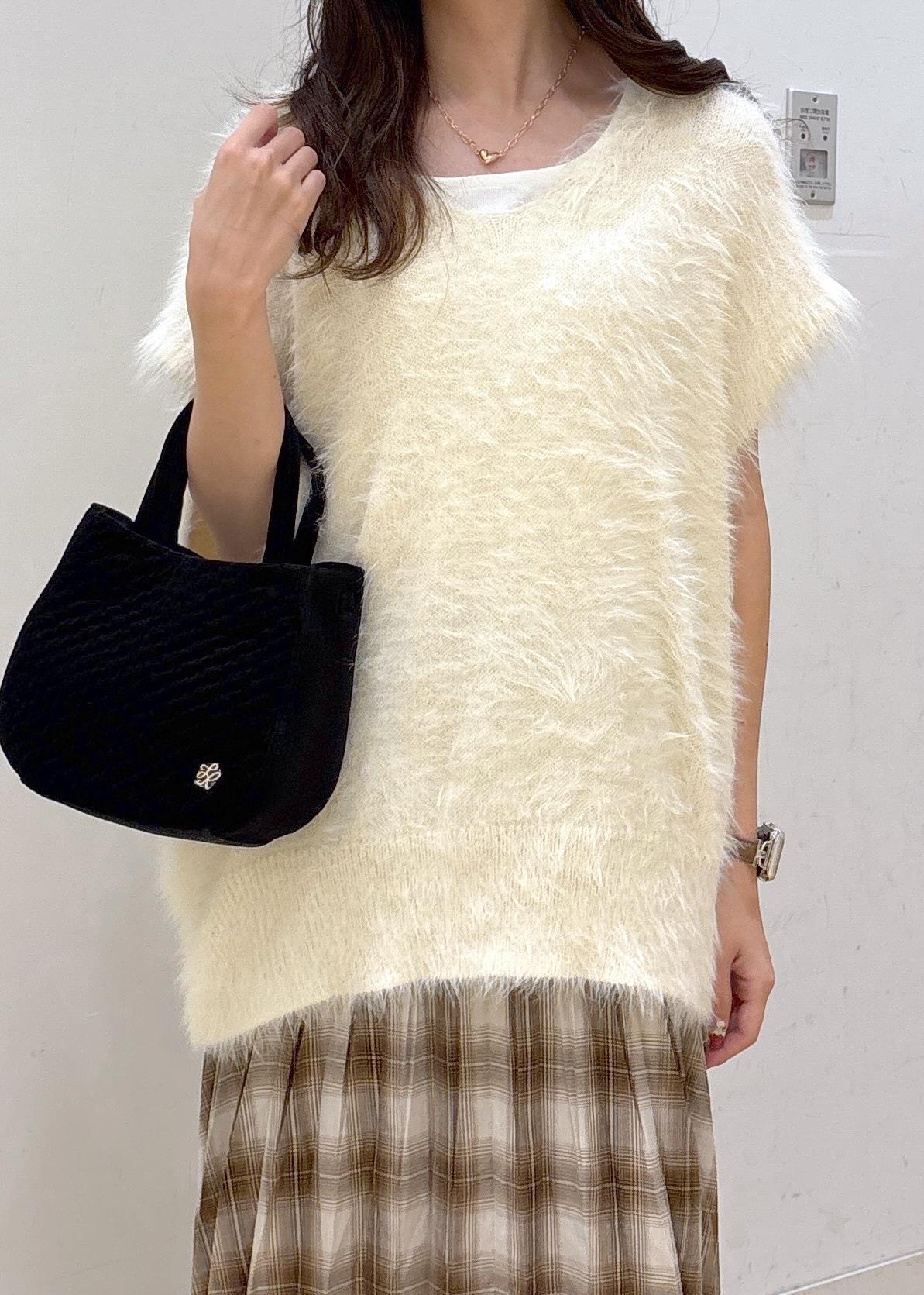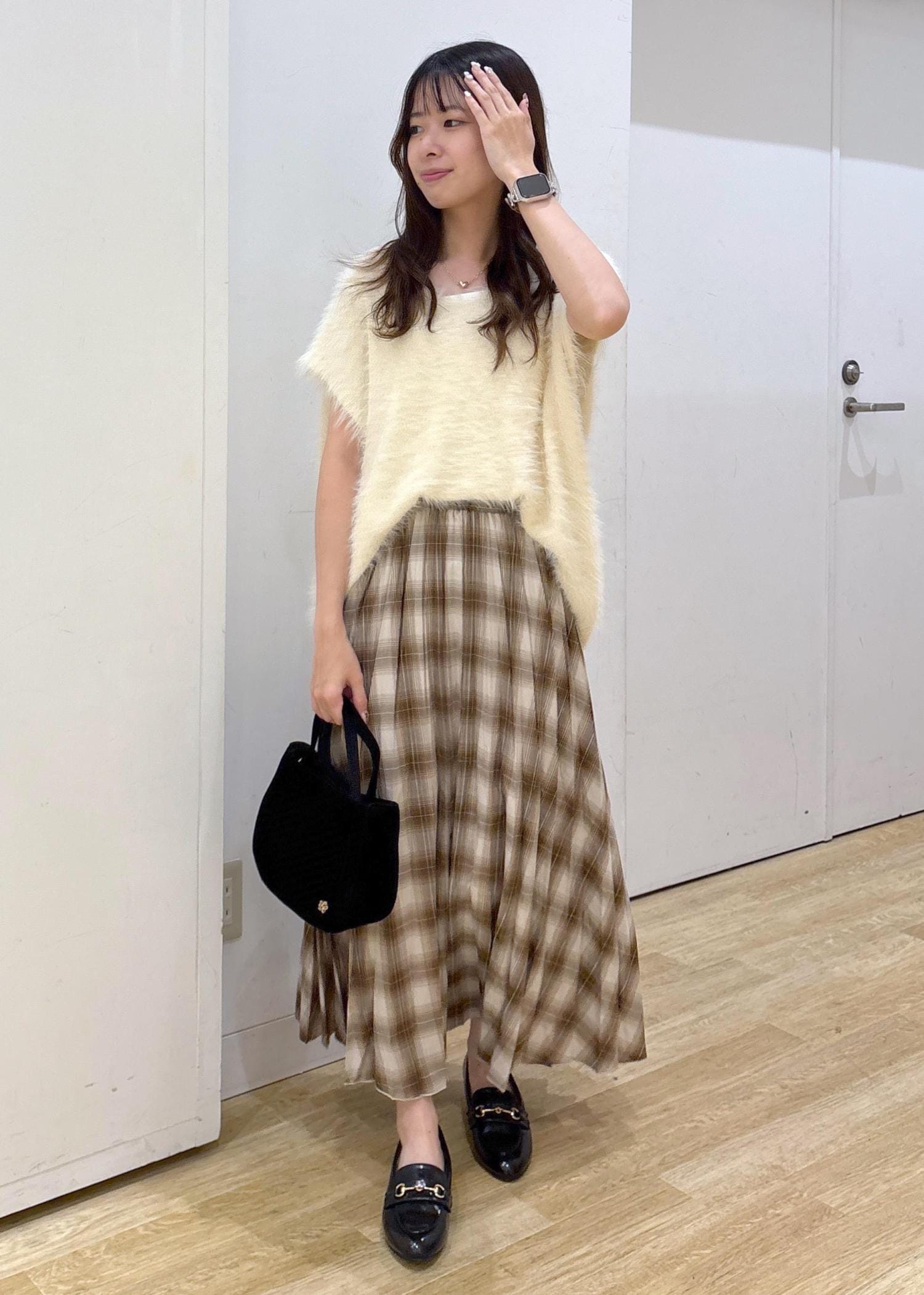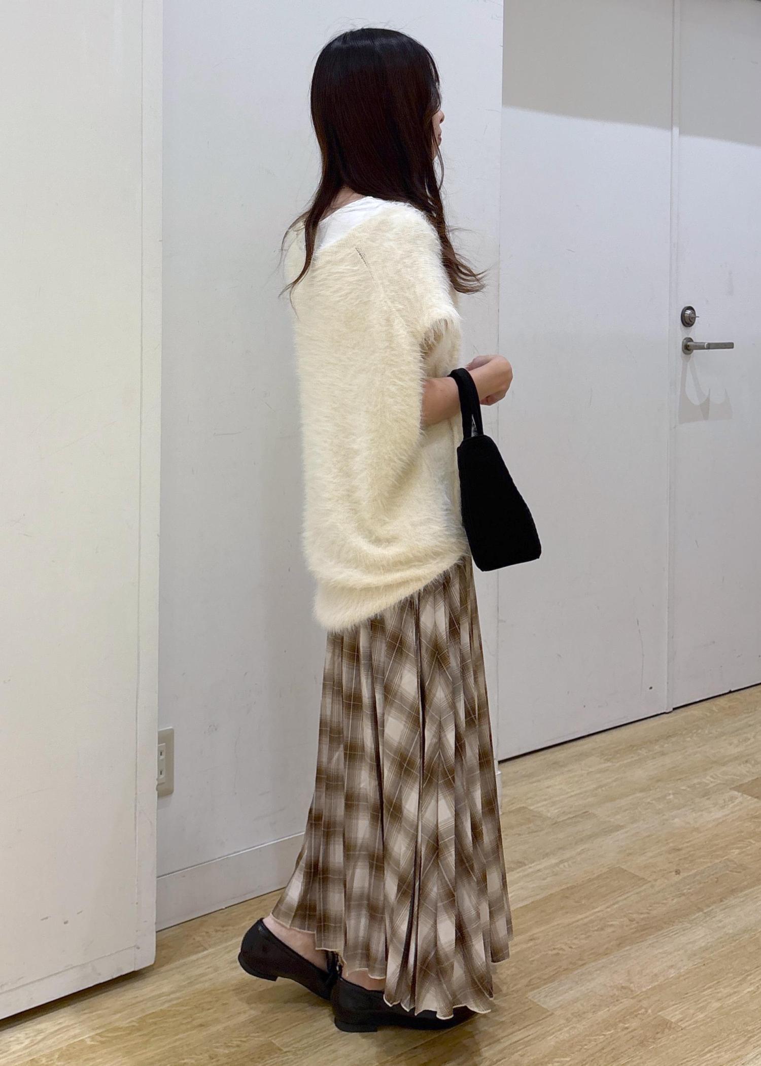 毛足のあるゆったりしたニットベストに、チェック柄のスカートを合わせて秋らしいコーディネートにしました!