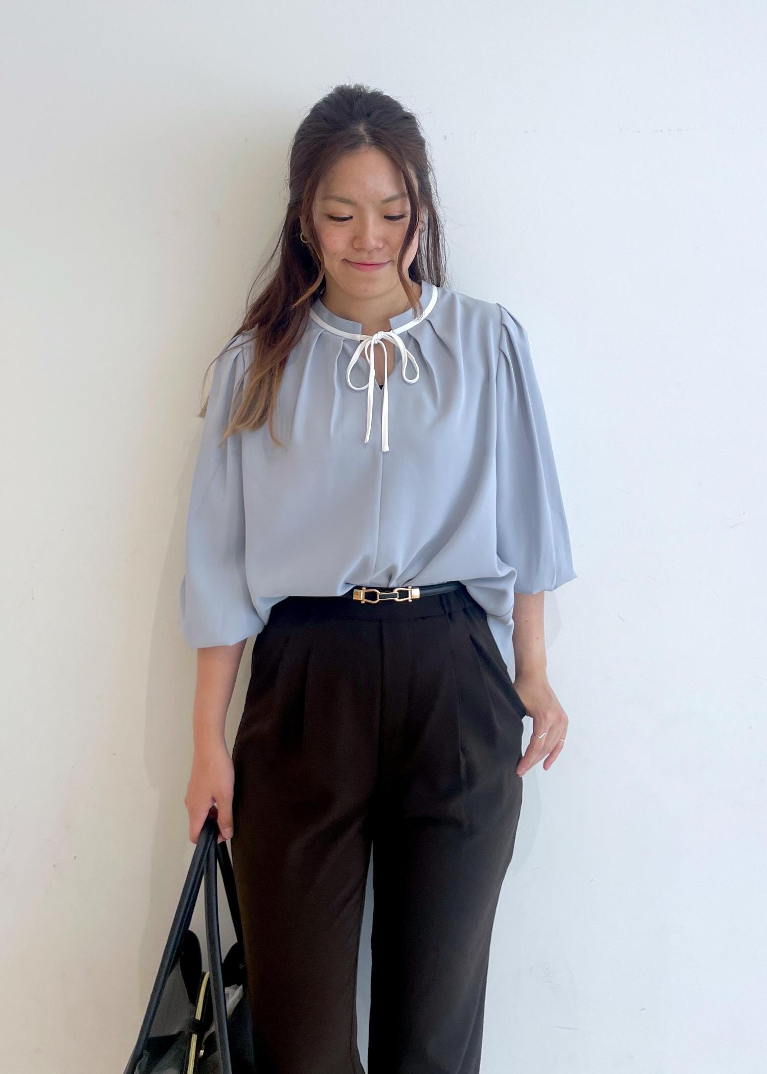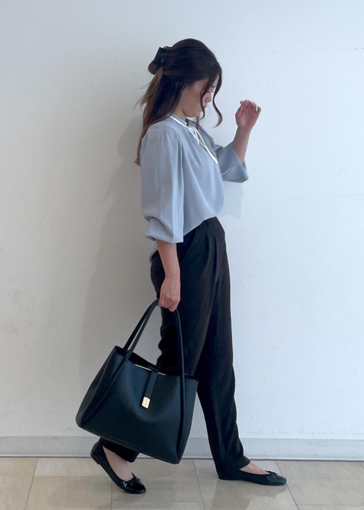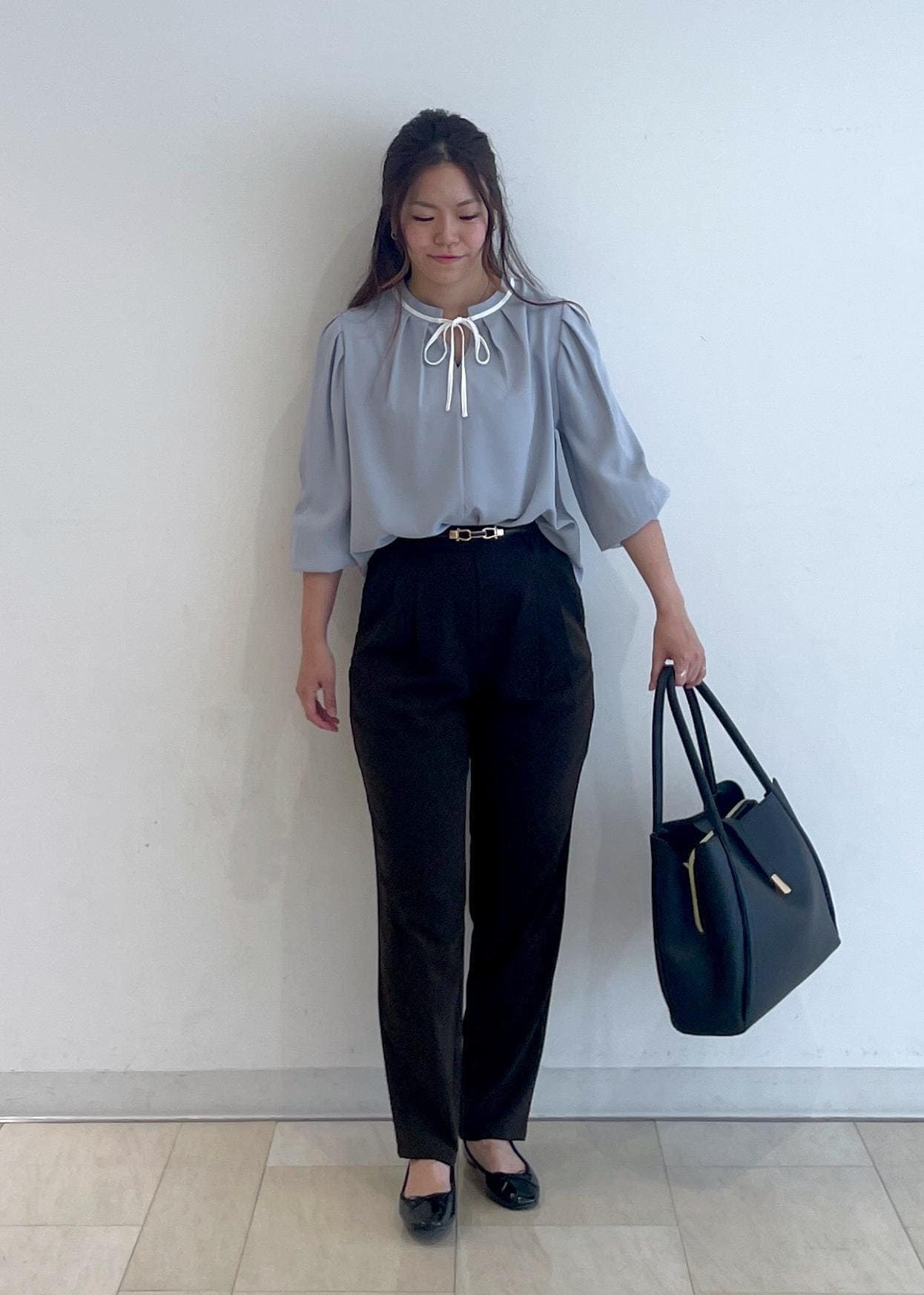 シンプルなコーデですが、首元の細めのリボンが甘すぎないポイントなるのでアクセサリー付けなくても華やかです◎