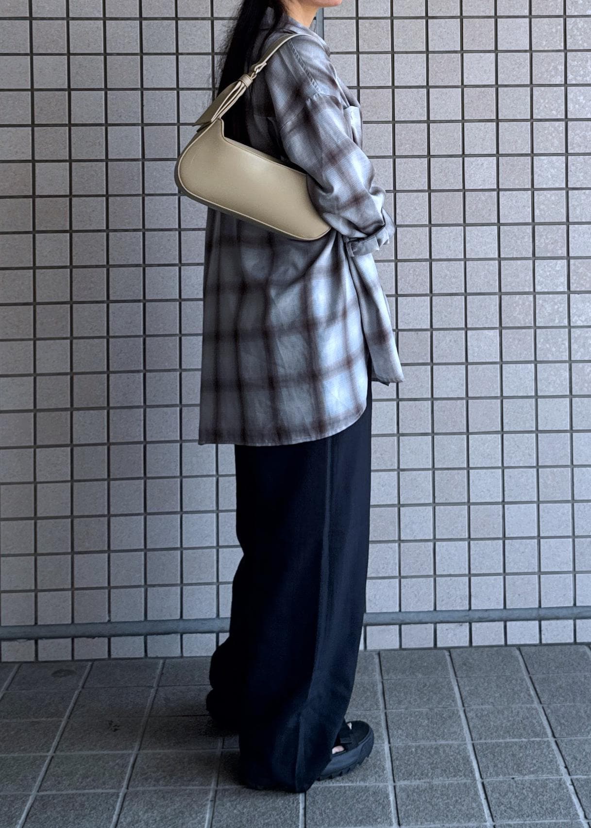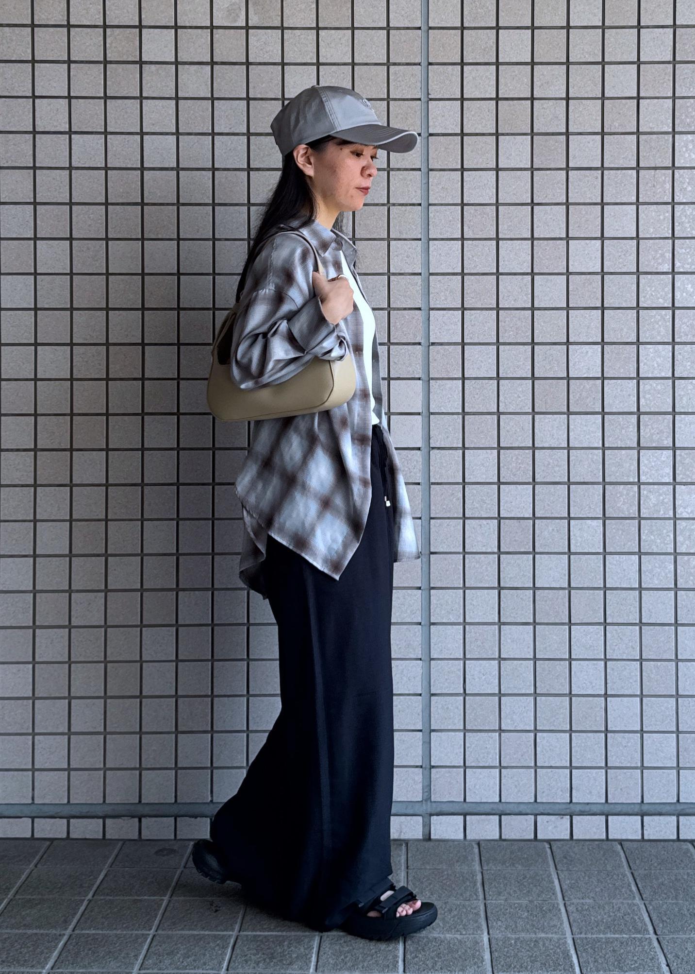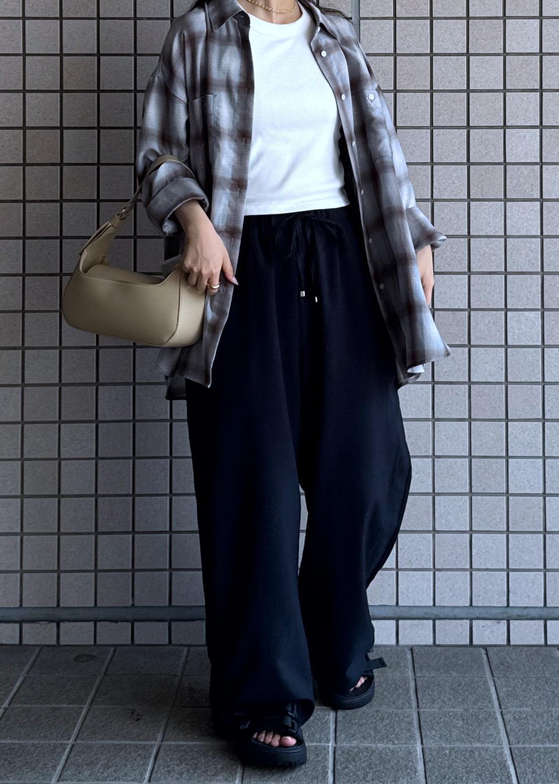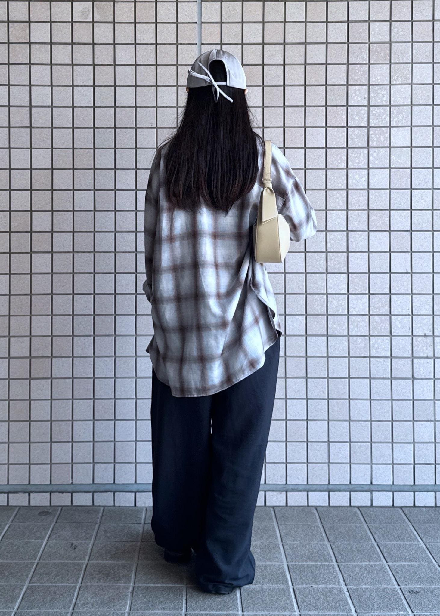 白のタンクトップにブルーのチェックシャツを羽織り、定番の夏のカジュアルコーデにしました!