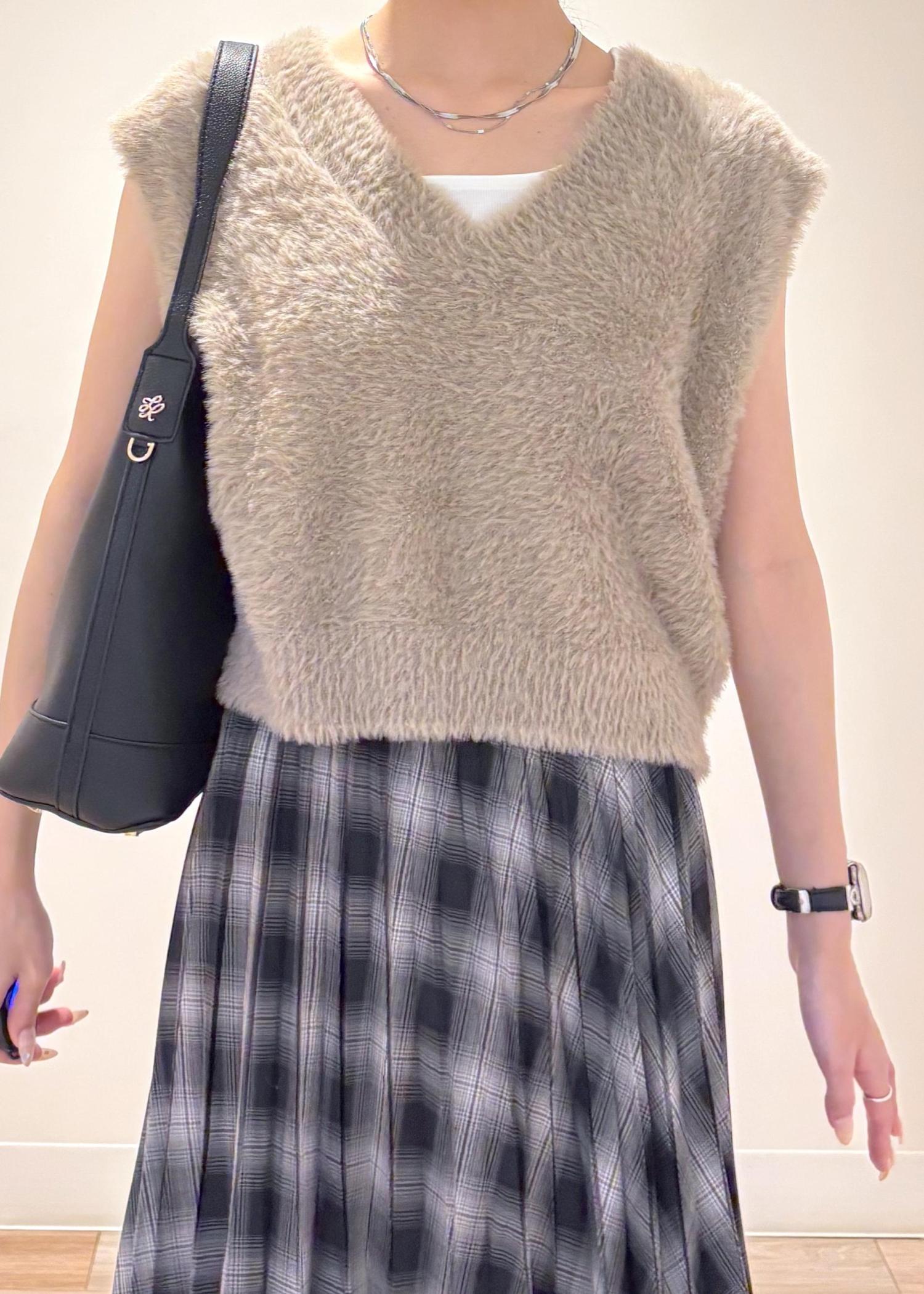 ベージュ×ブラックチェックの組み合わせでトレンド感のある秋コーデに♪