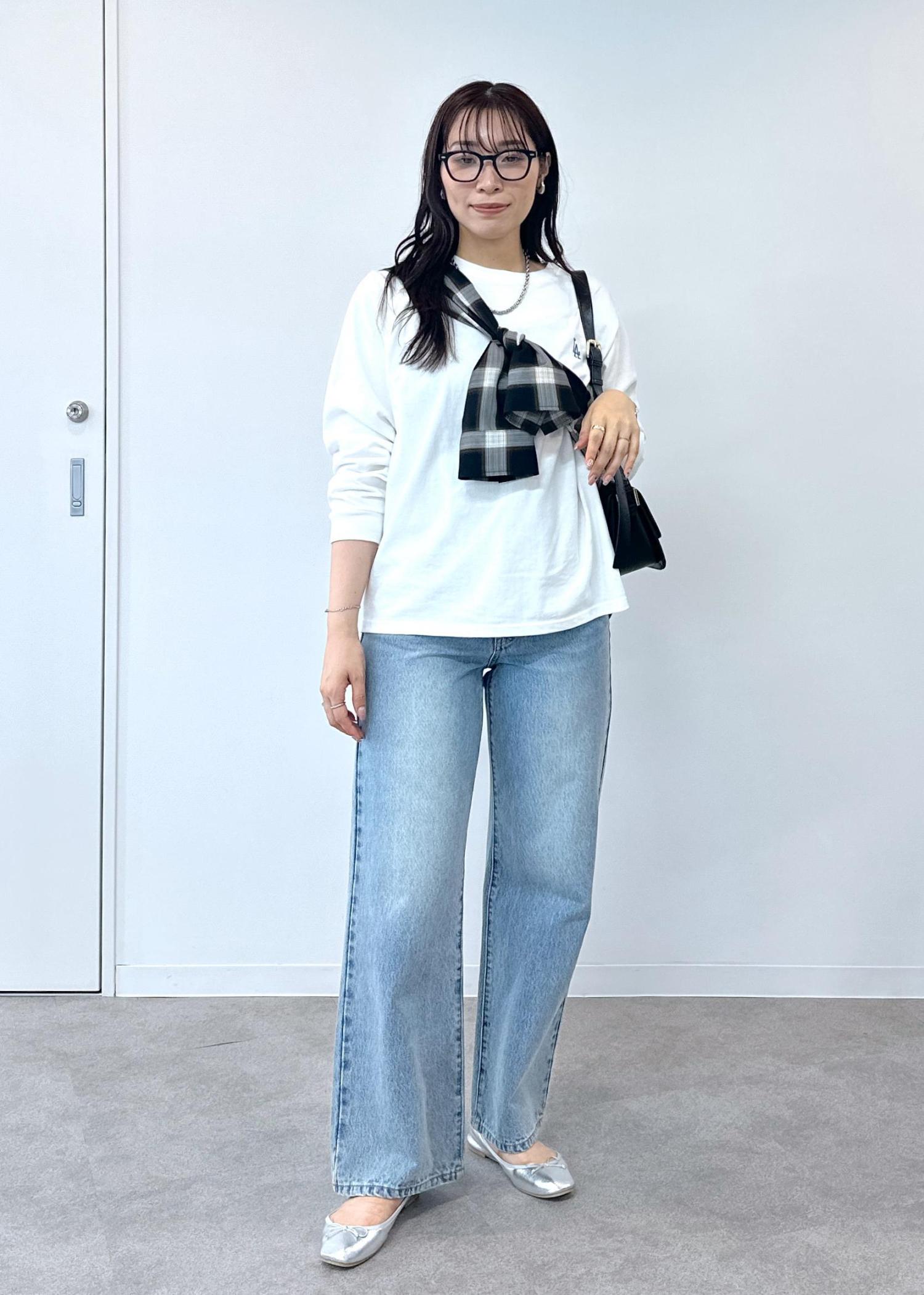 足元はシルバーのバレエシューズで女性らしい印象にしました。