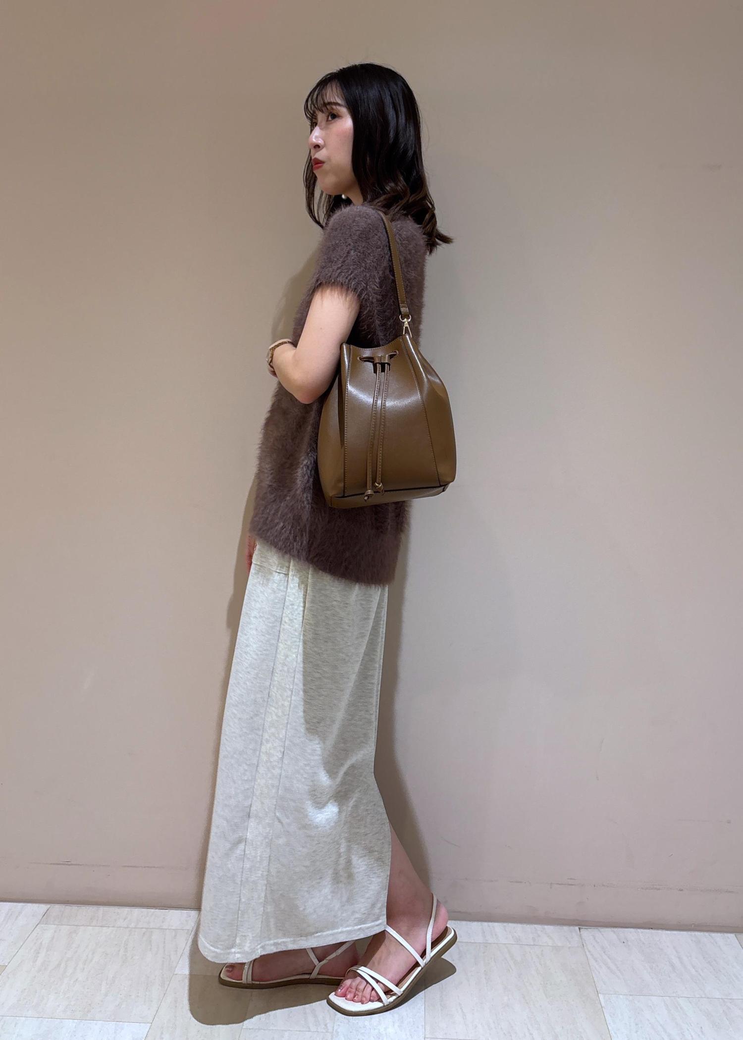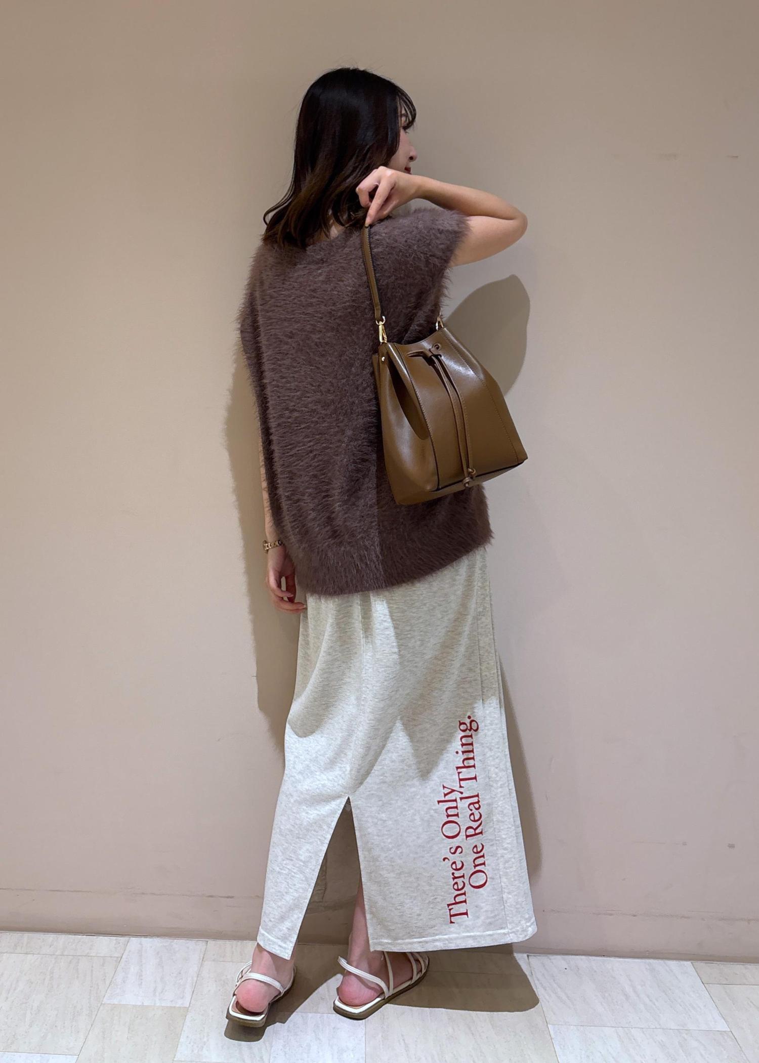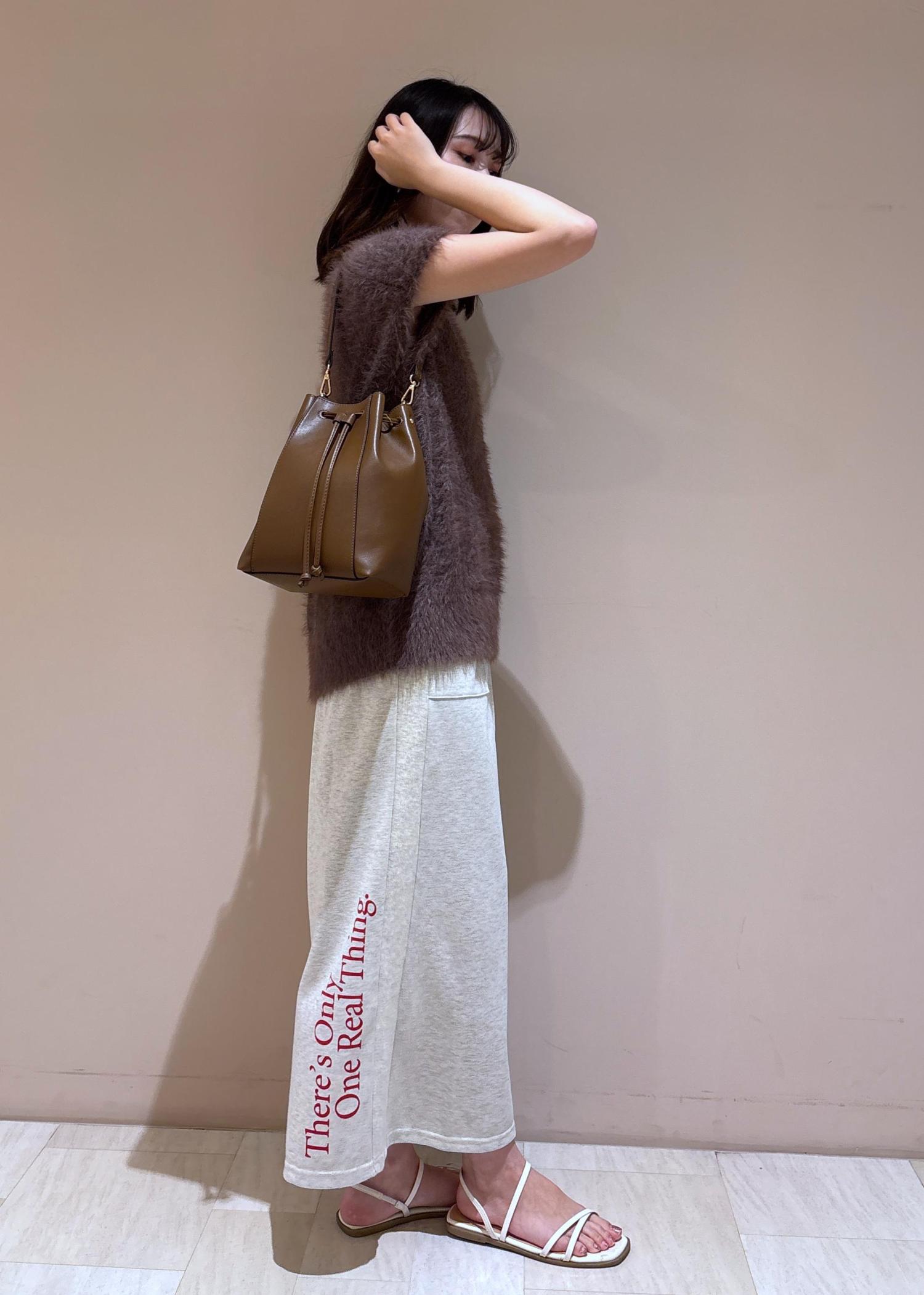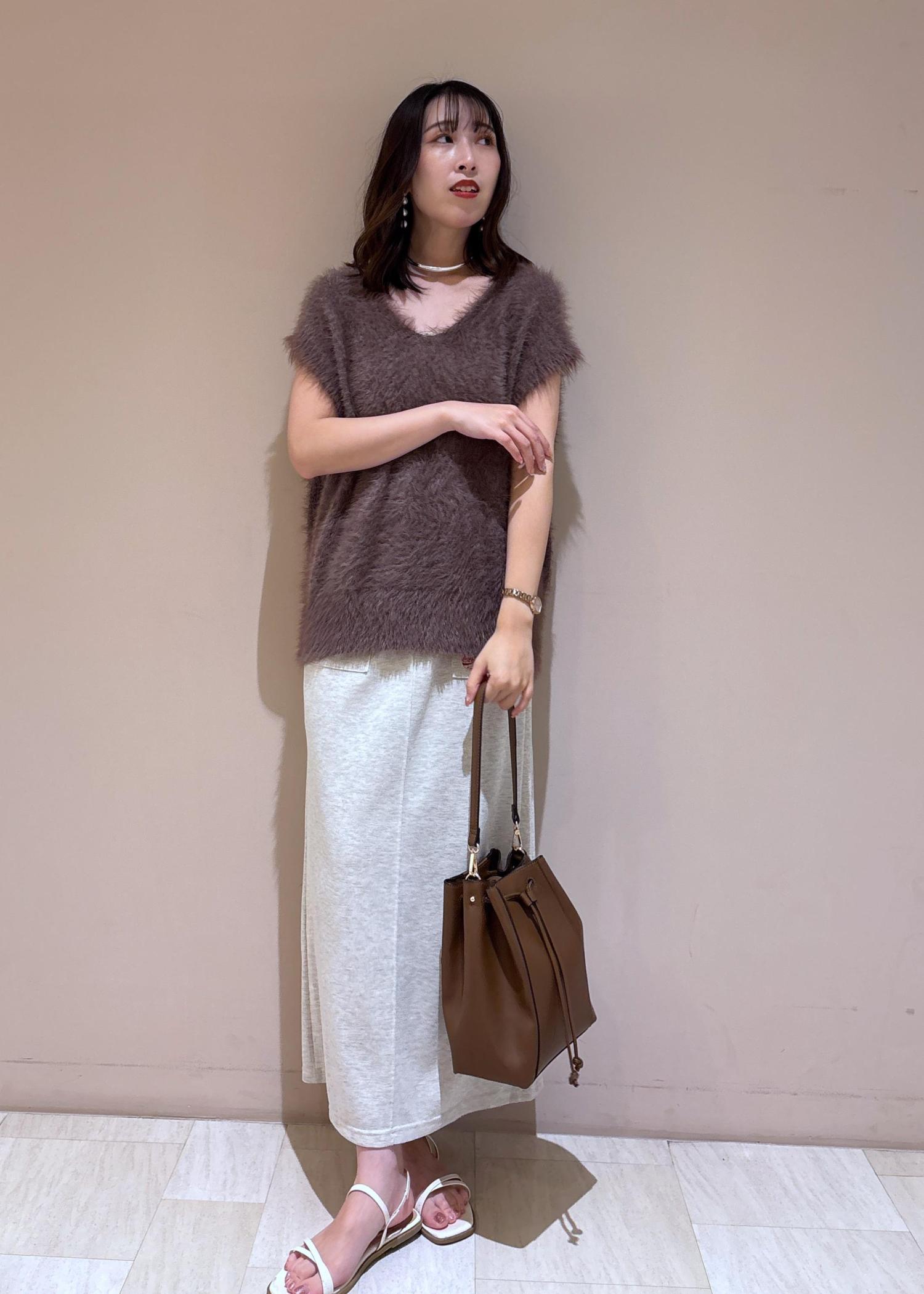 ふわふわっとしたフェザーニットベストを使った大人女子コーデ。