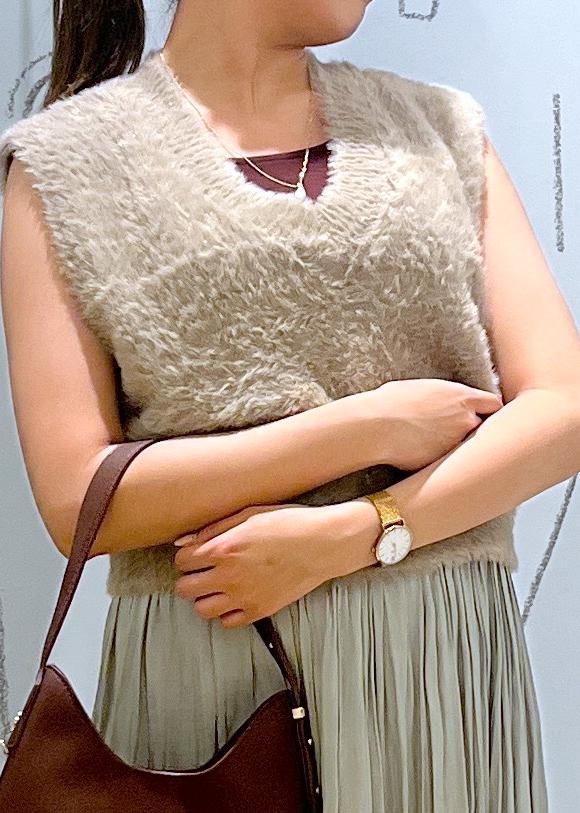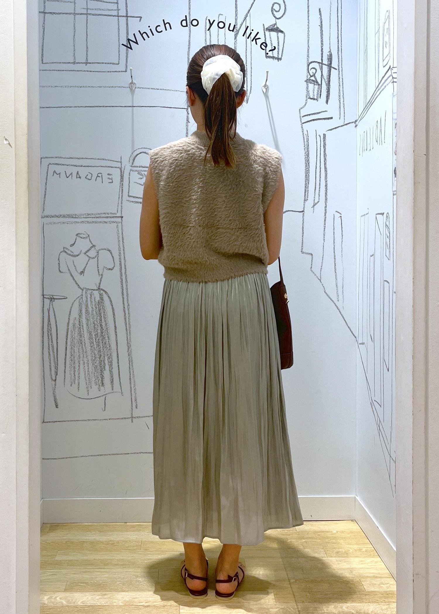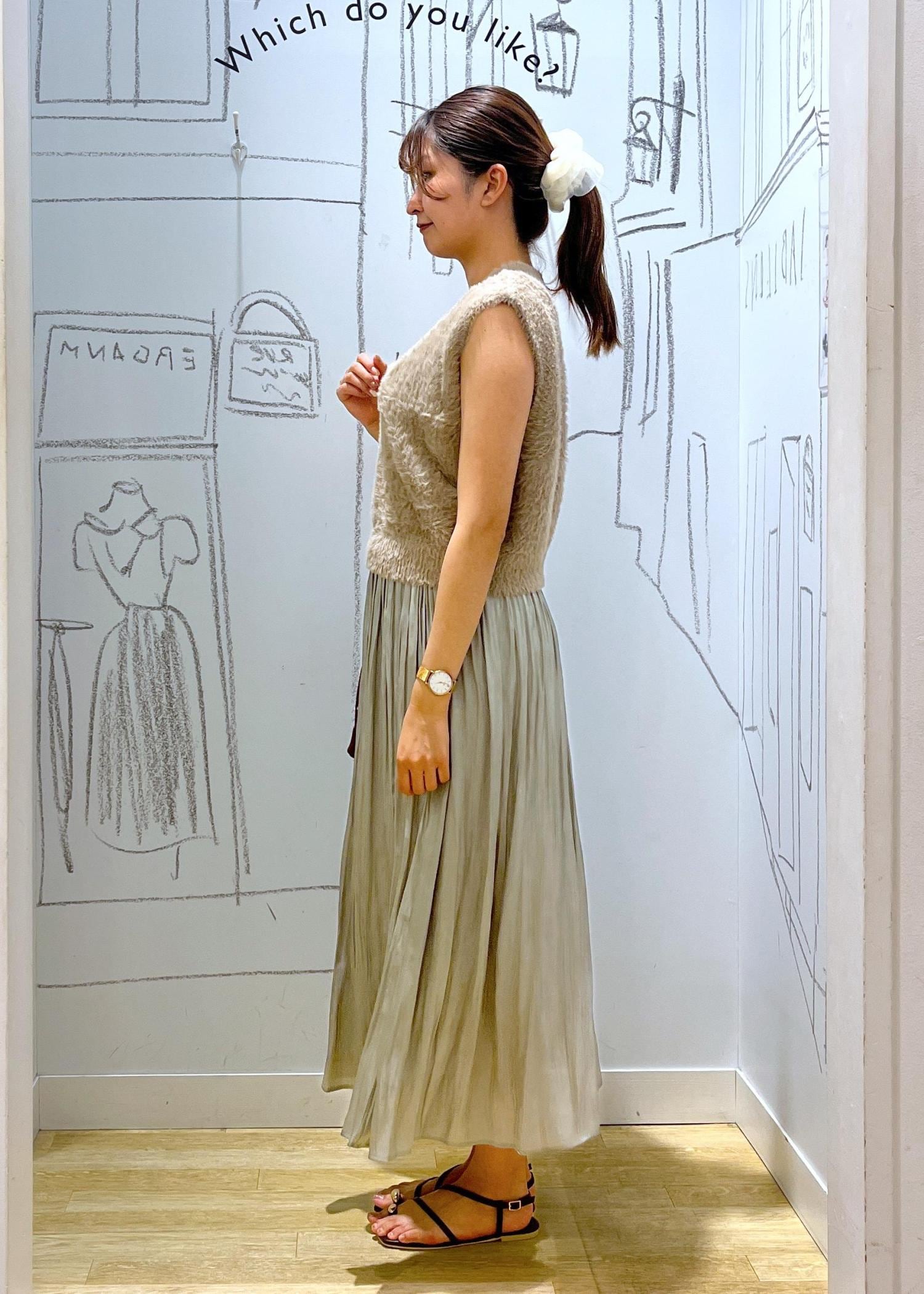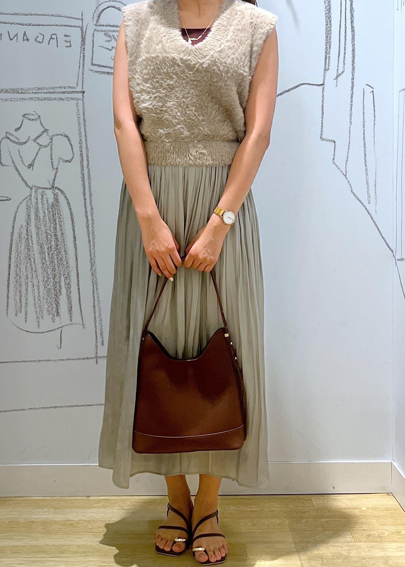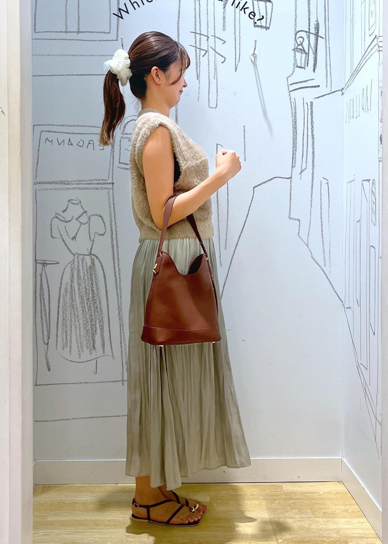 ニットベスト×スカートで着回ししやすく動きやすい女性らしさを感じるコーデに合わせてみました。バックとサンダルは落ち着きのあるブラウンを組み合わせてみました。