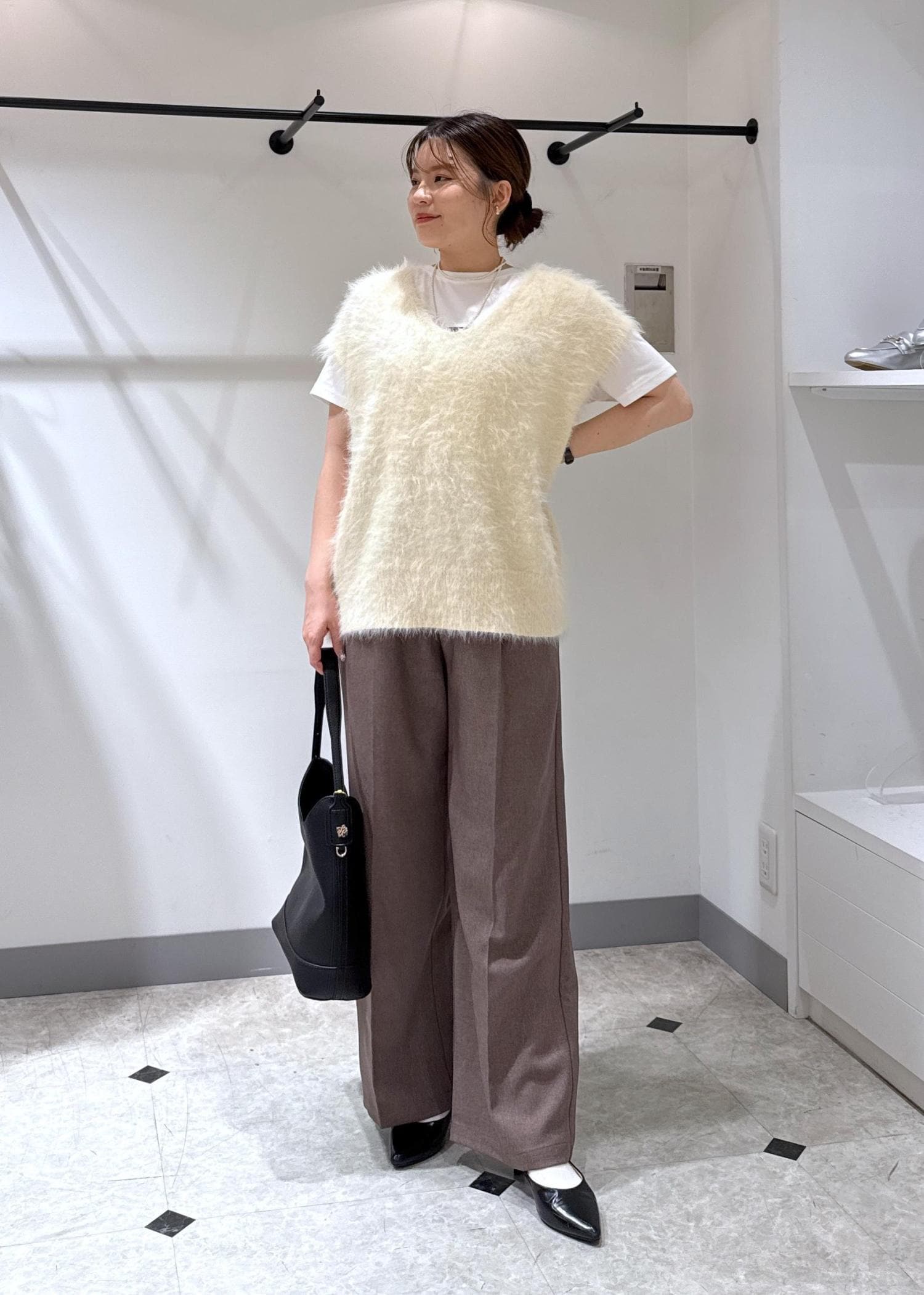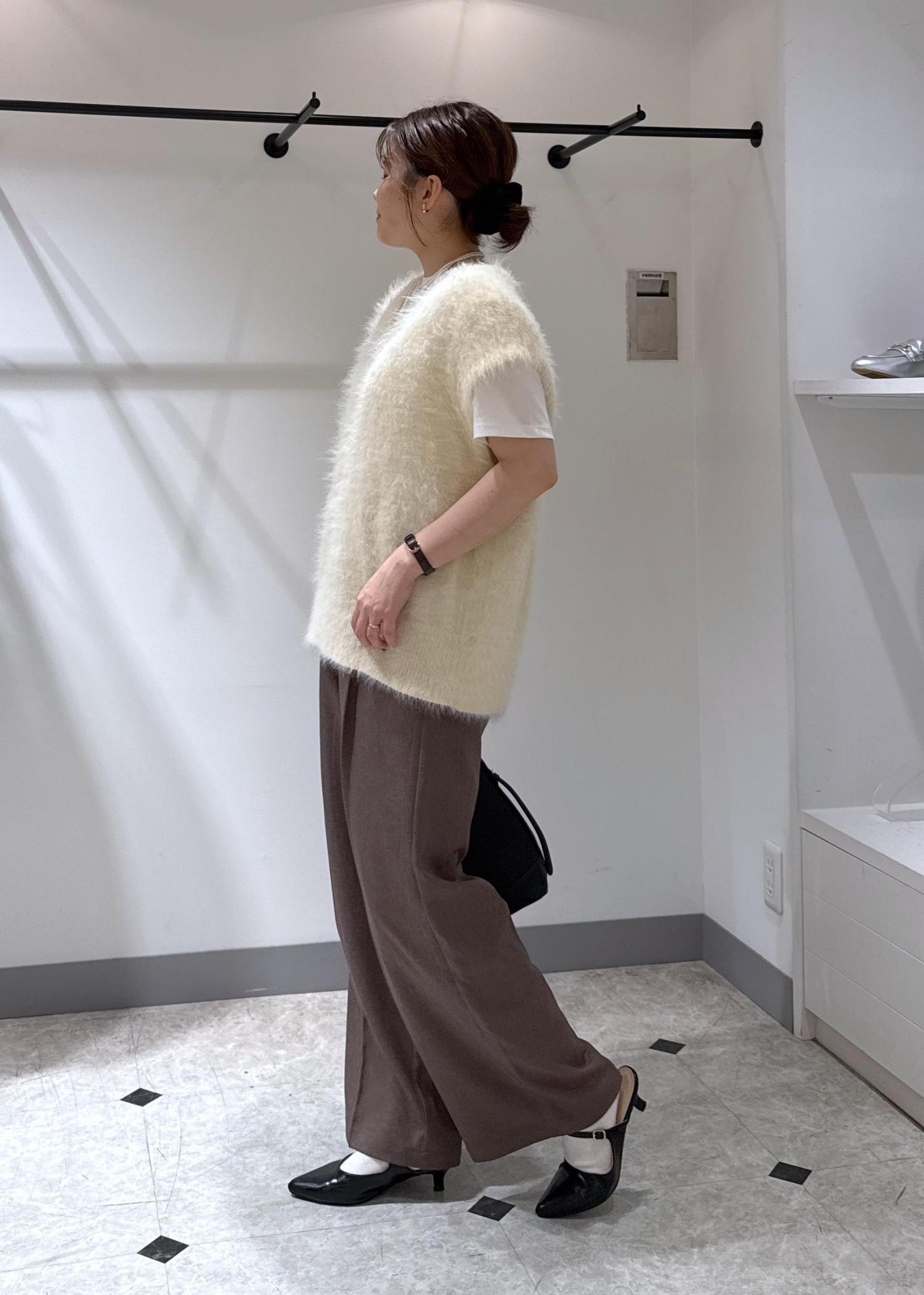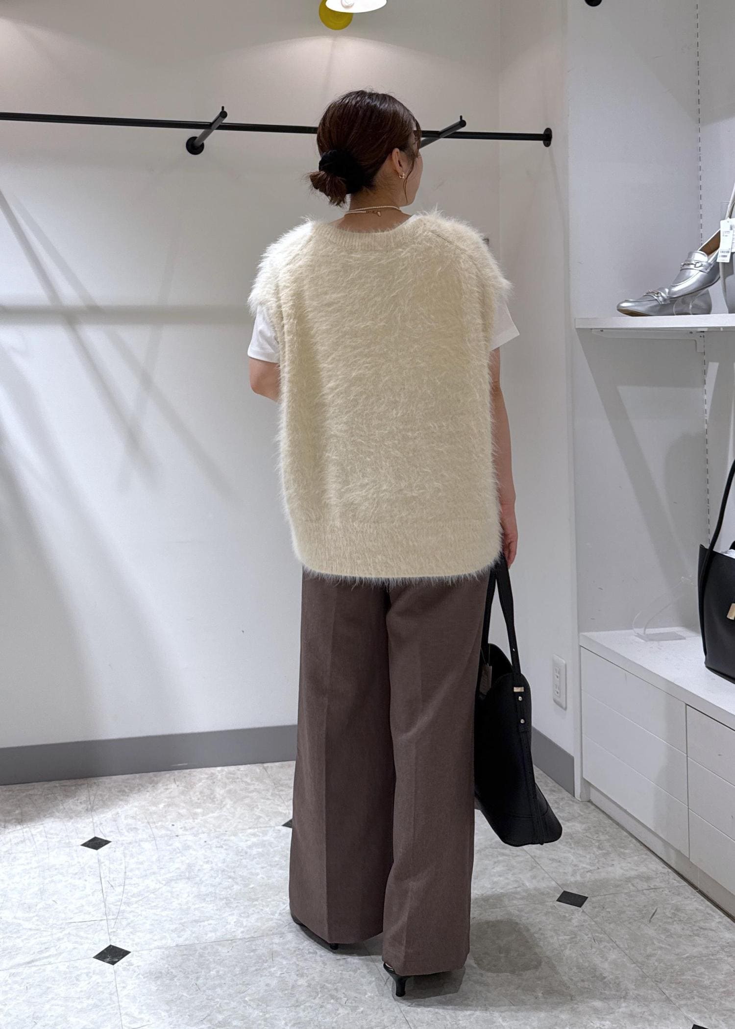 トレンドフェザーニットベストのきれいめパンツコーデ