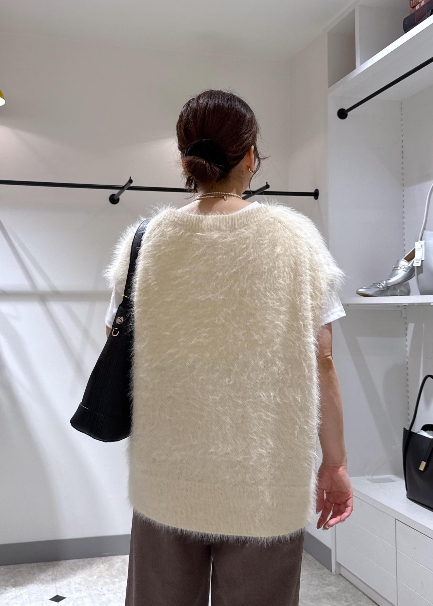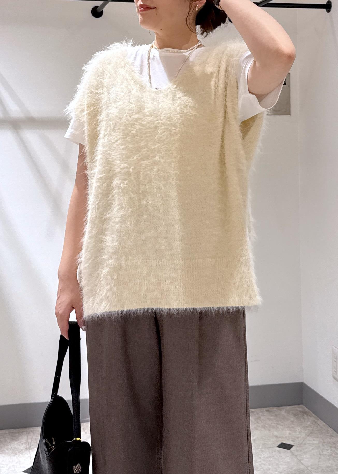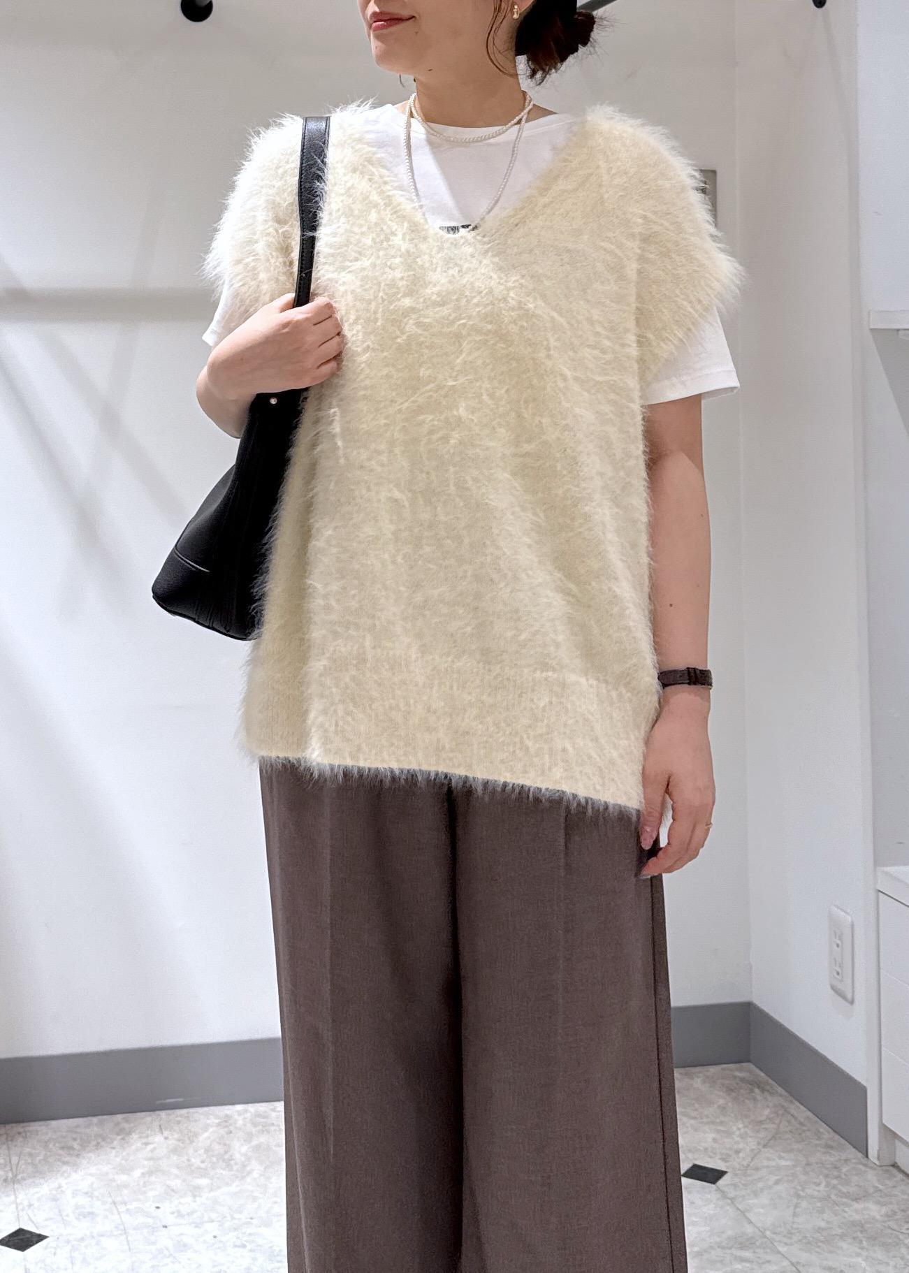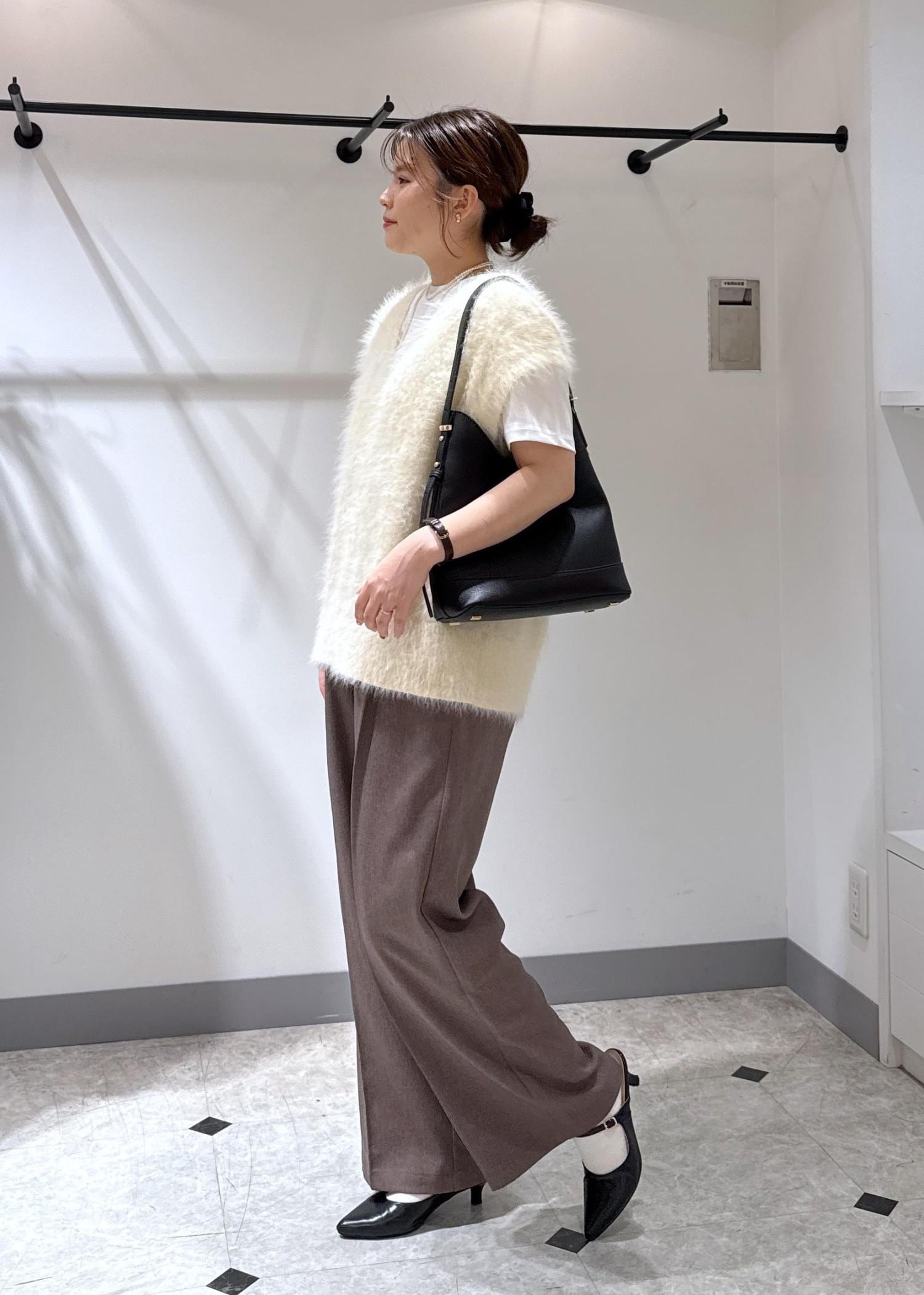 トレンドフェザーニットベストのきれいめパンツコーデ