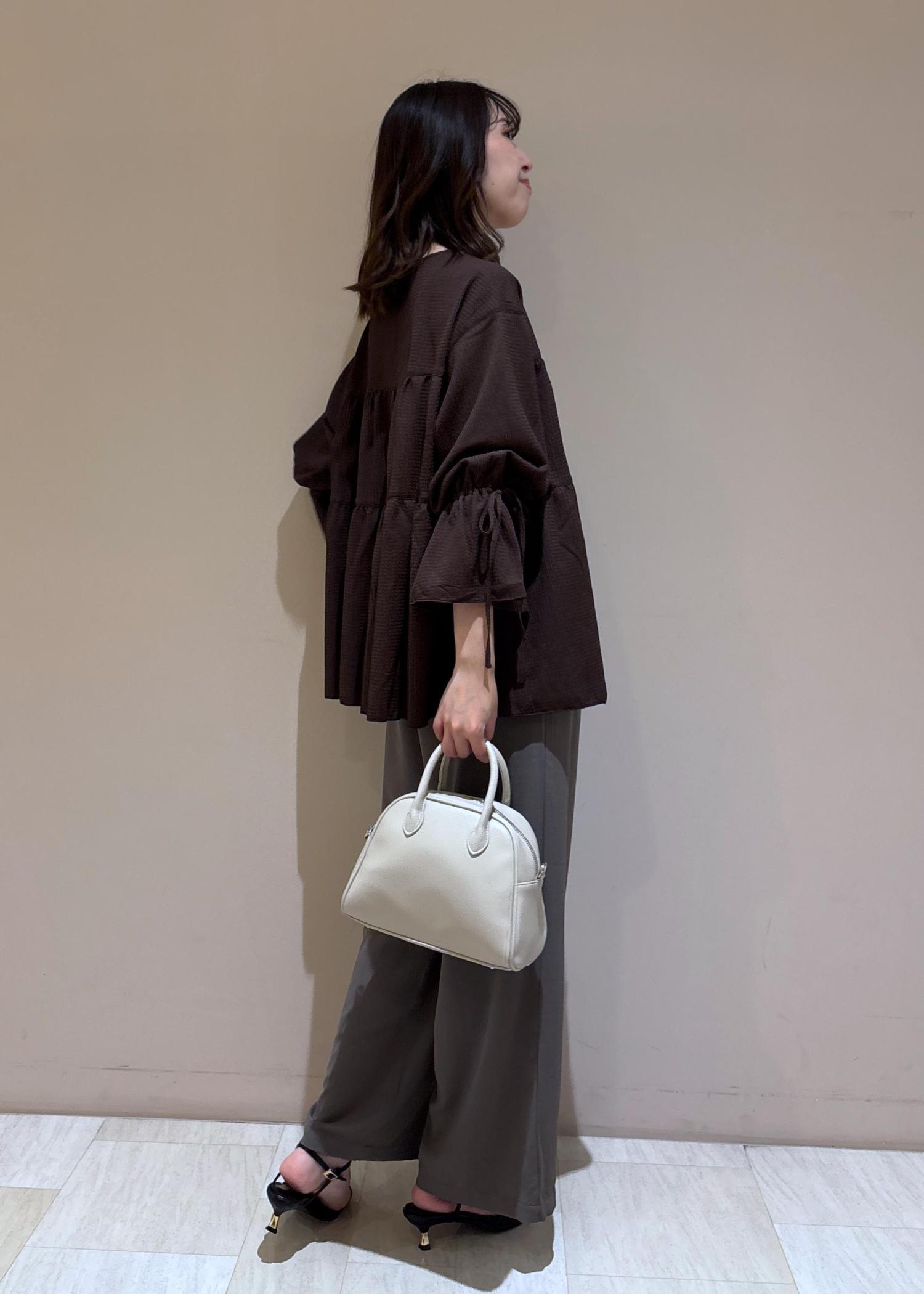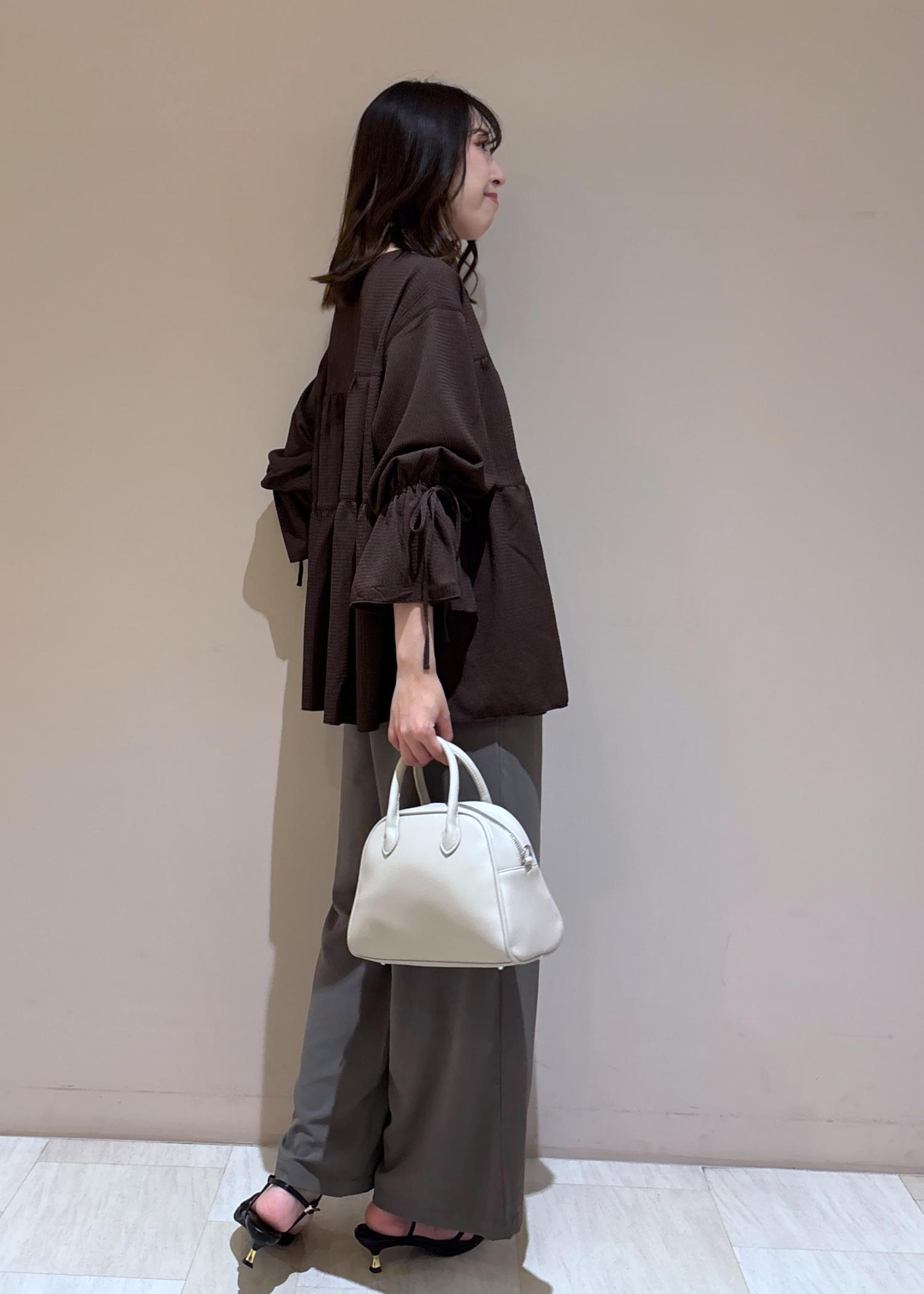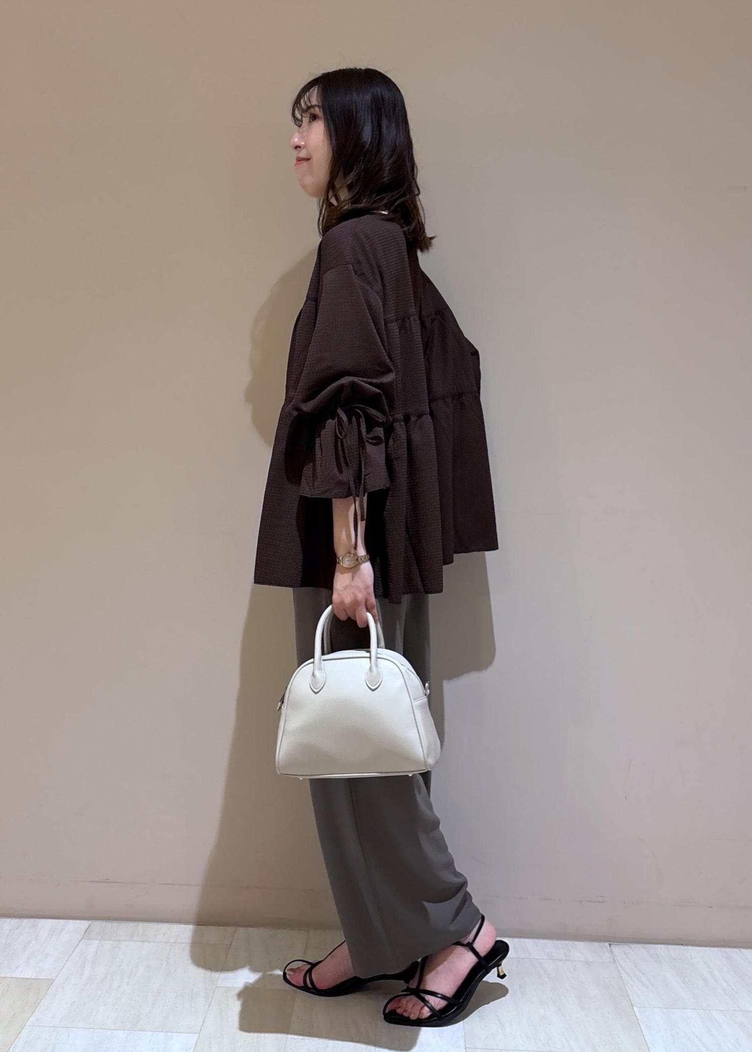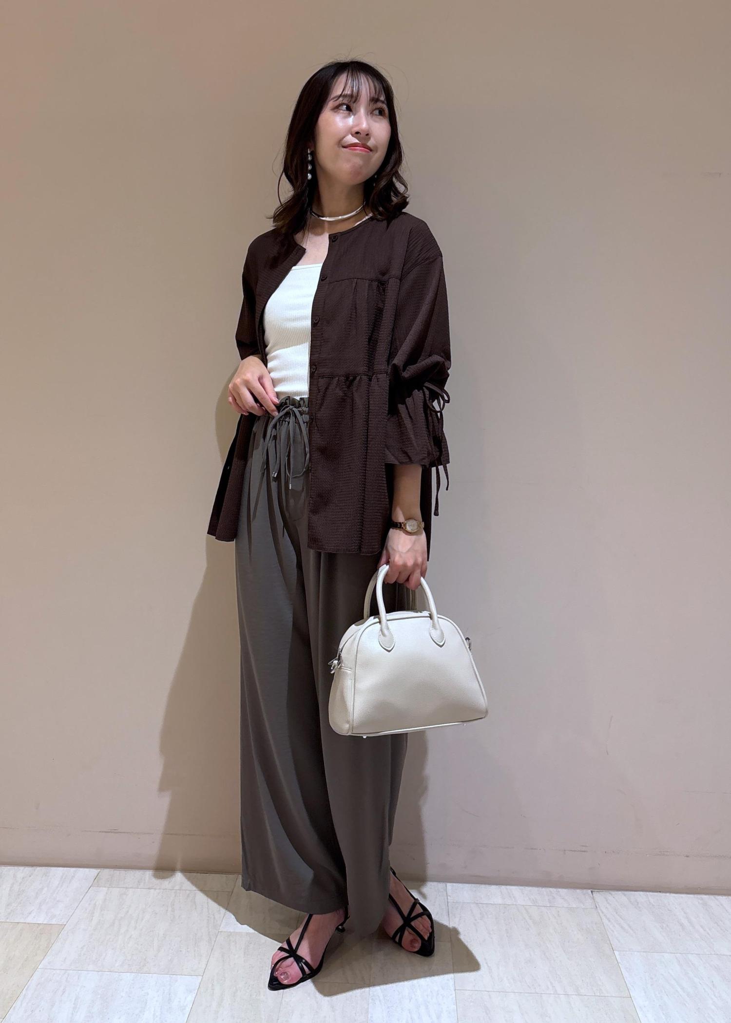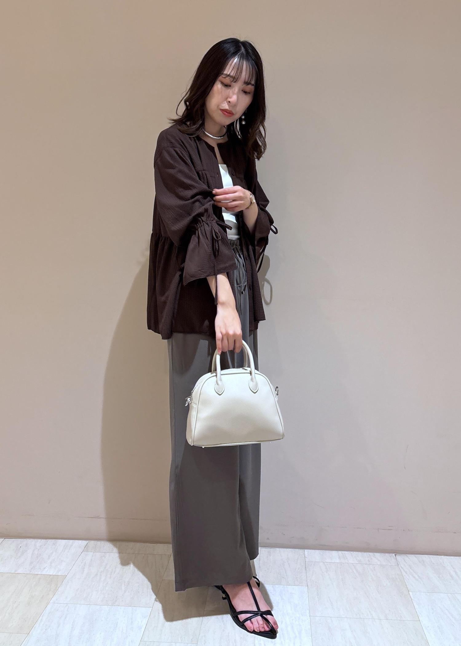 パキッとしたブラウンなので、柔らかい素材のカーキを選ぶと落ち着いた印象に。