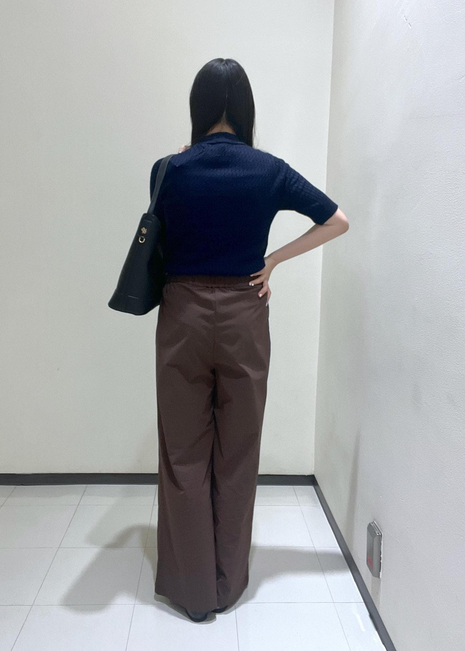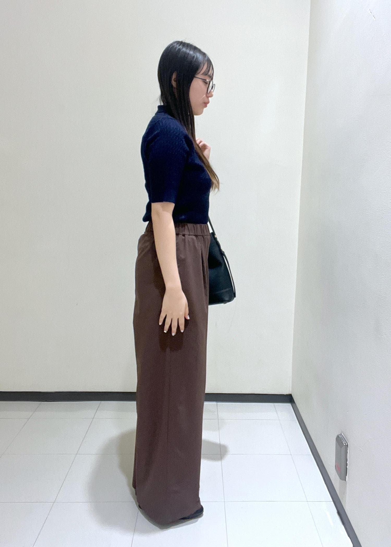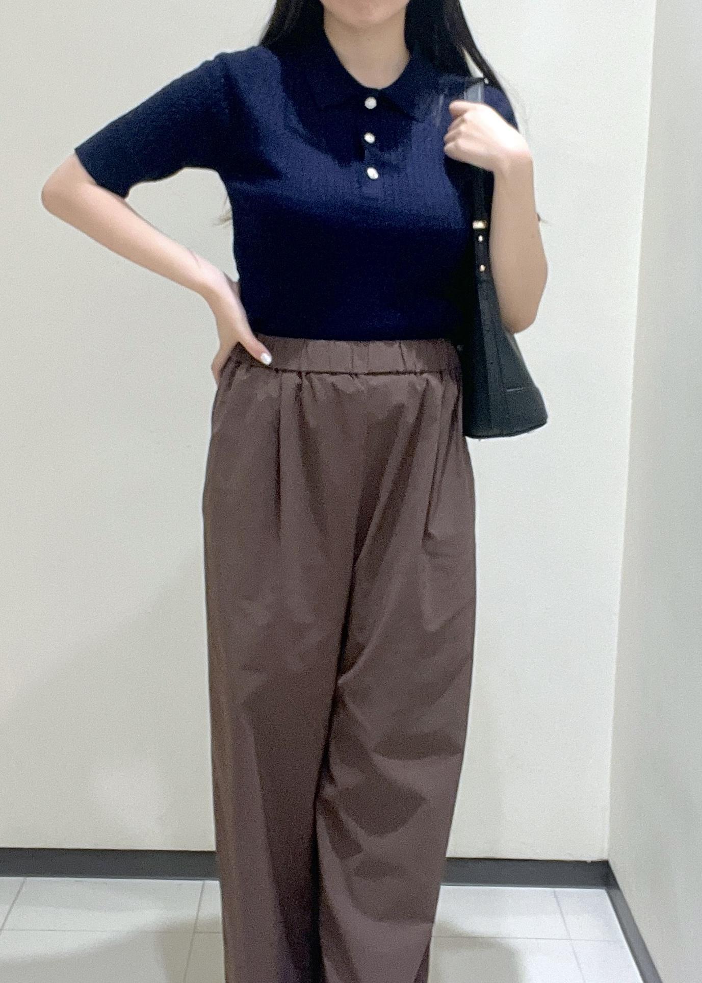 ネイビーのポロニットとブラウンのワイドパンツを合わせることで落ち着きのある上品な印象にしました。