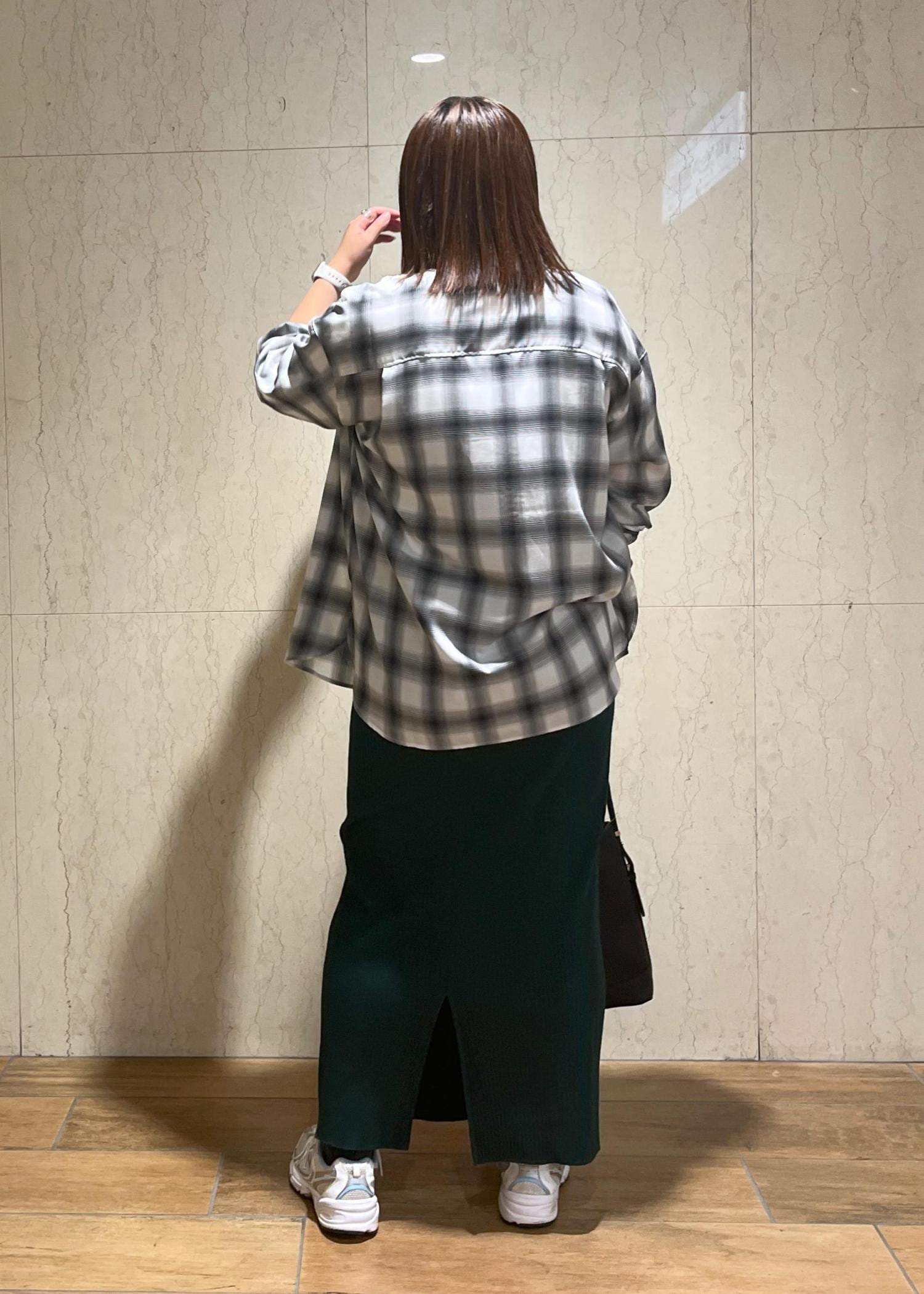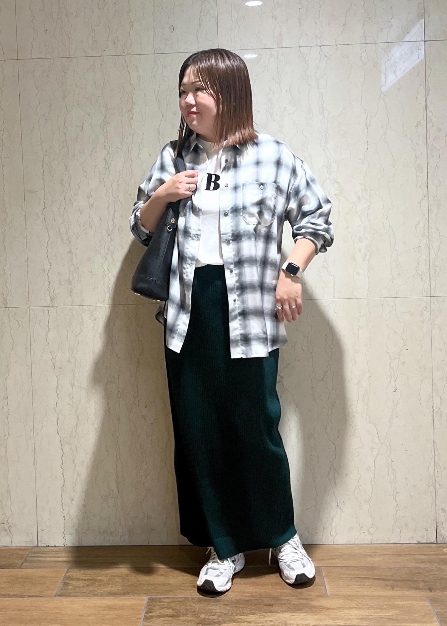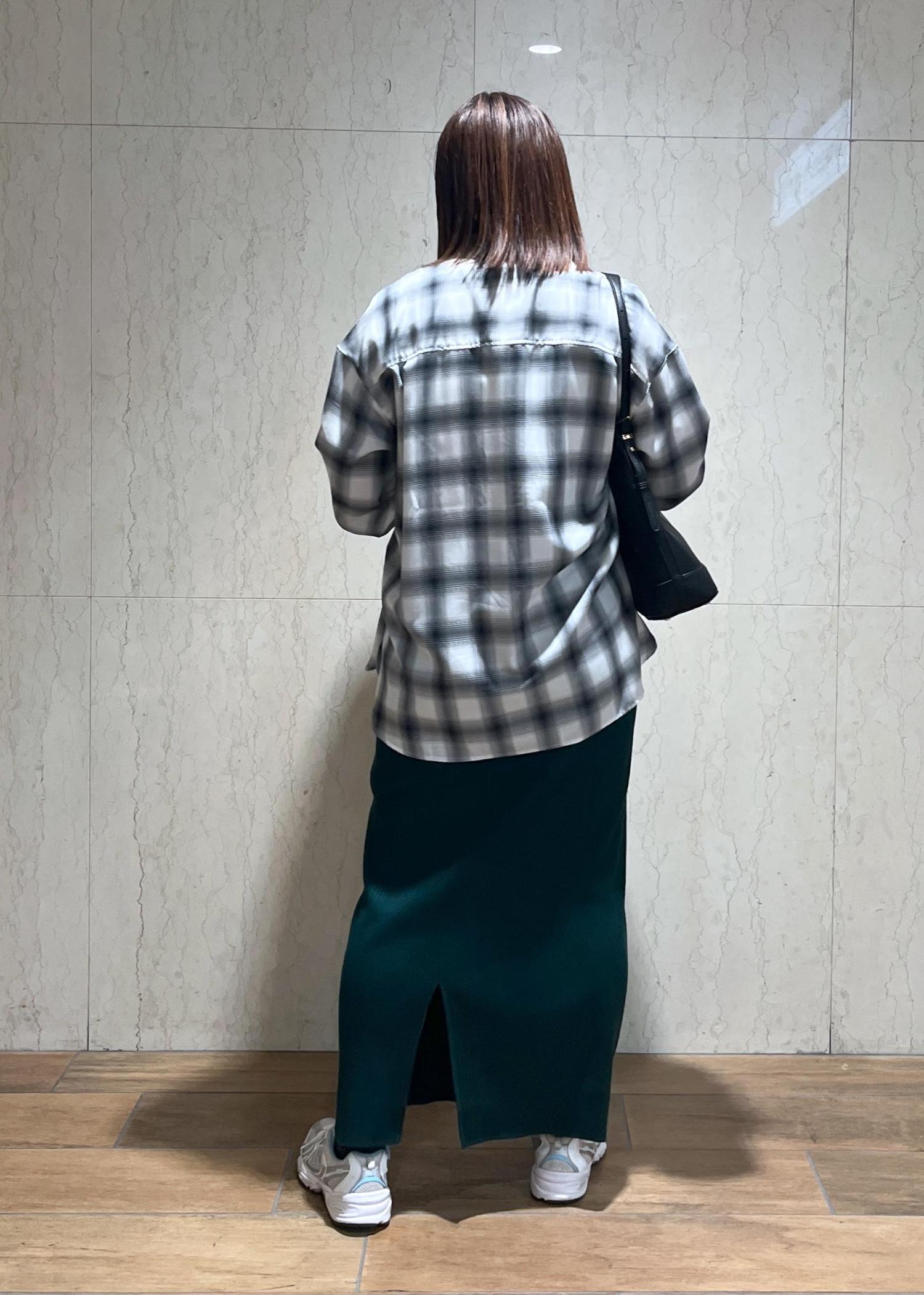 チェックシャツにグリーンのアイラインスカートを合わせた秋らしいコーディネートです。