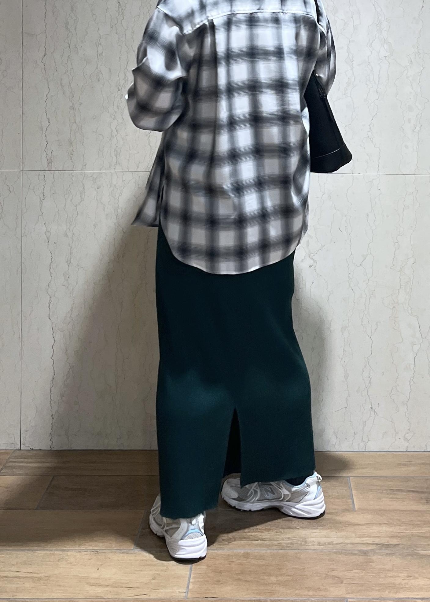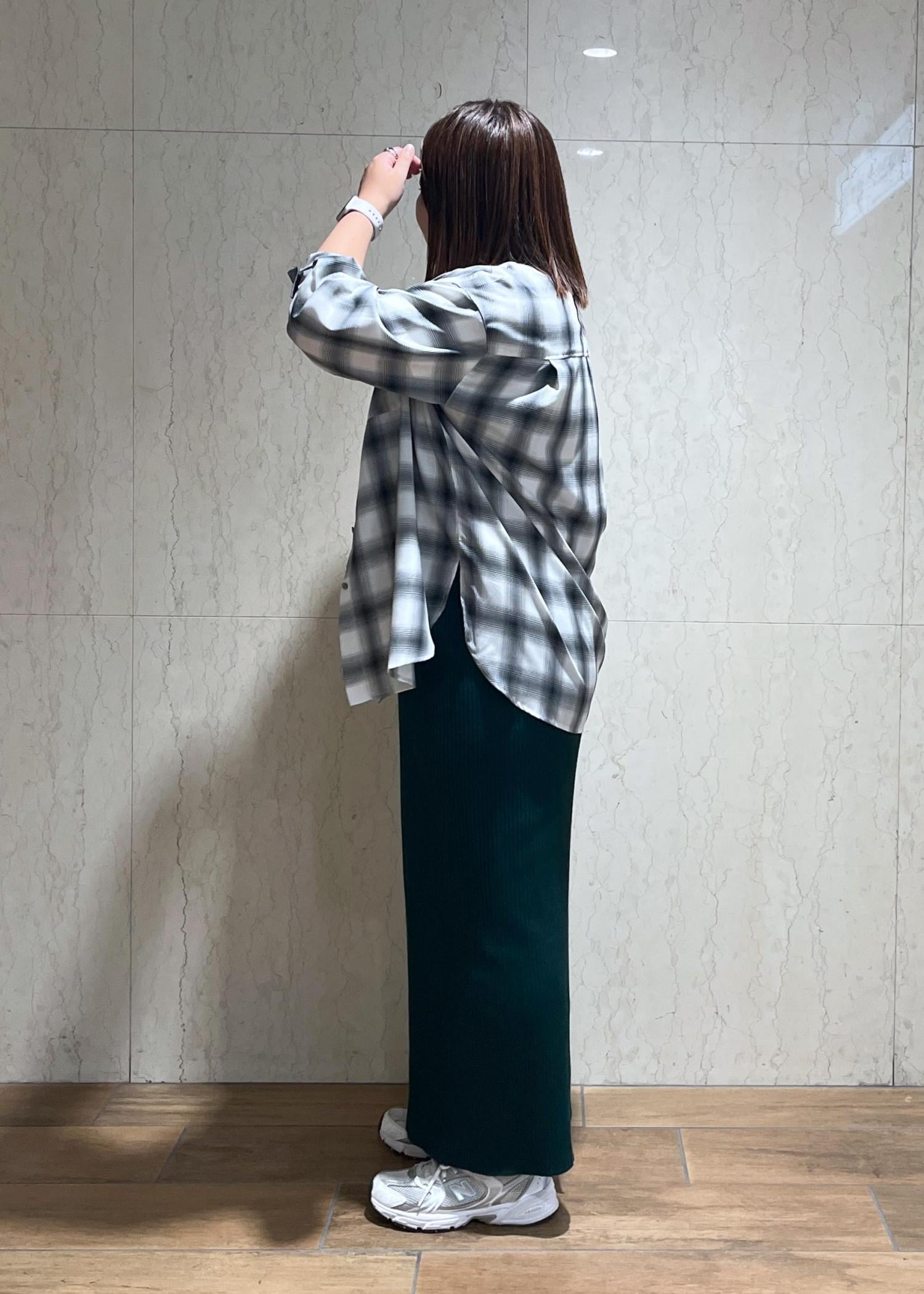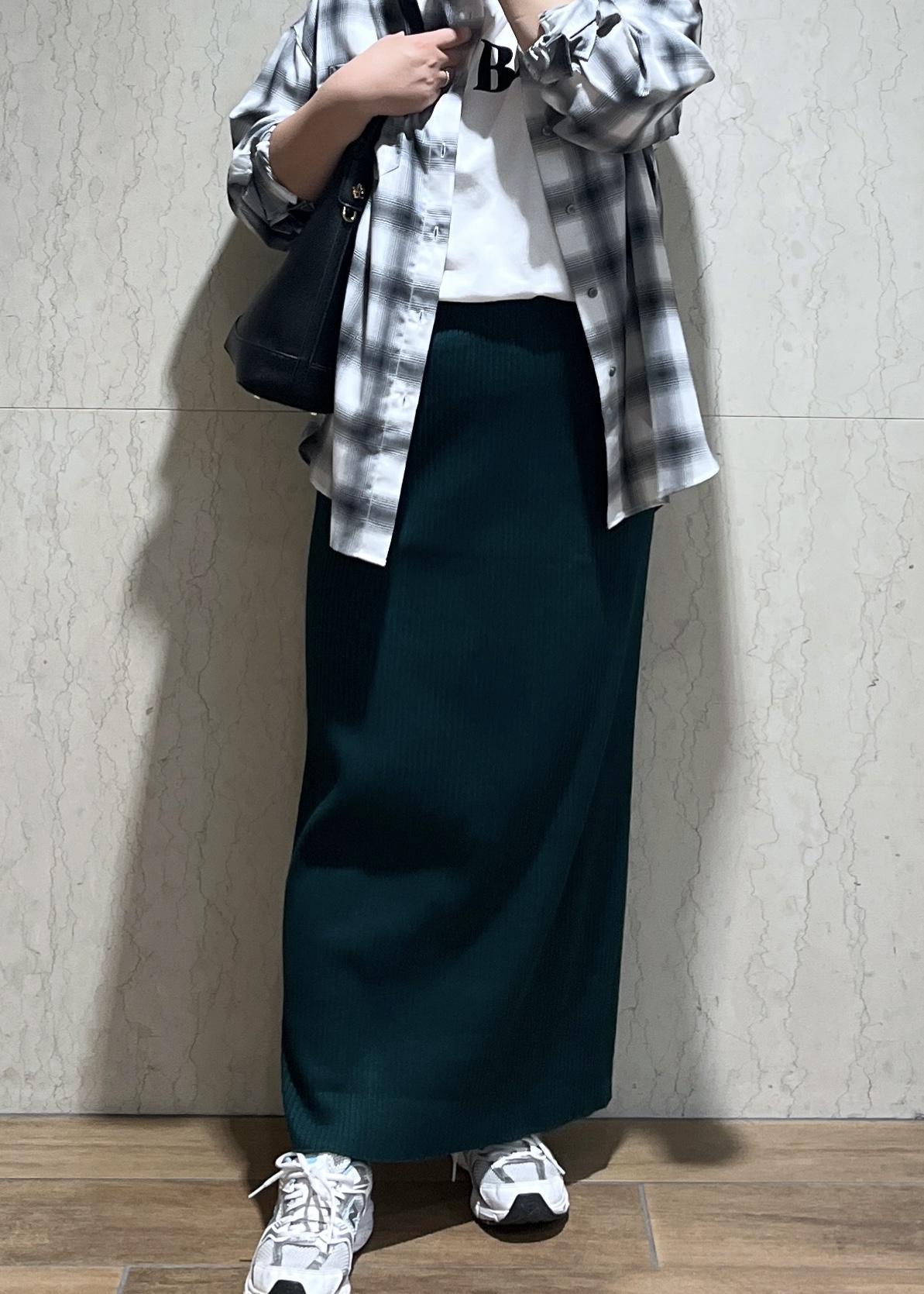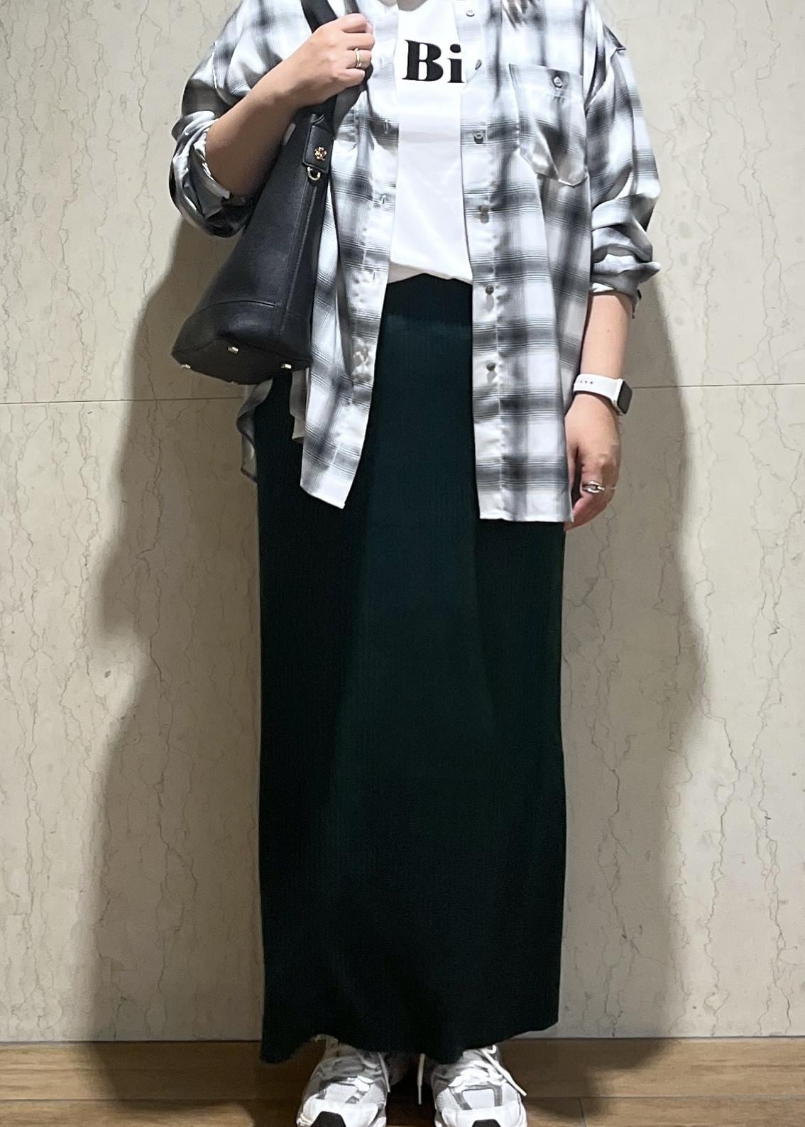 チェックシャツにグリーンのアイラインスカートを合わせた秋らしいコーディネートです。