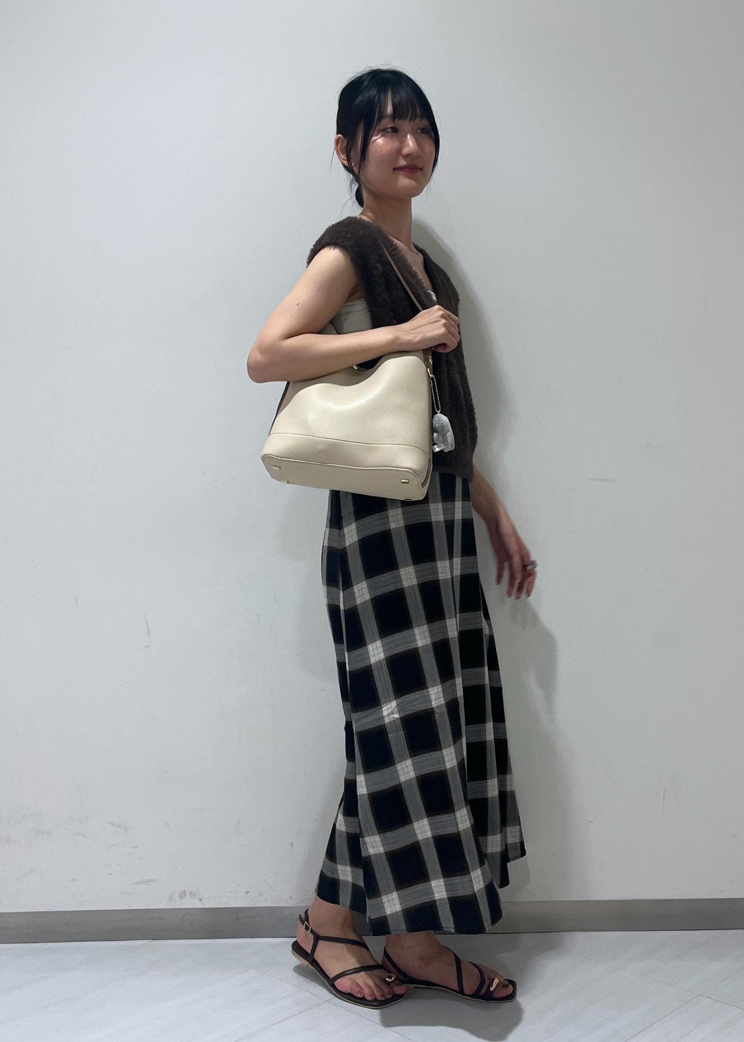 フェザーやチェック柄を使うと、一気に秋らしい印象のコーデになります。