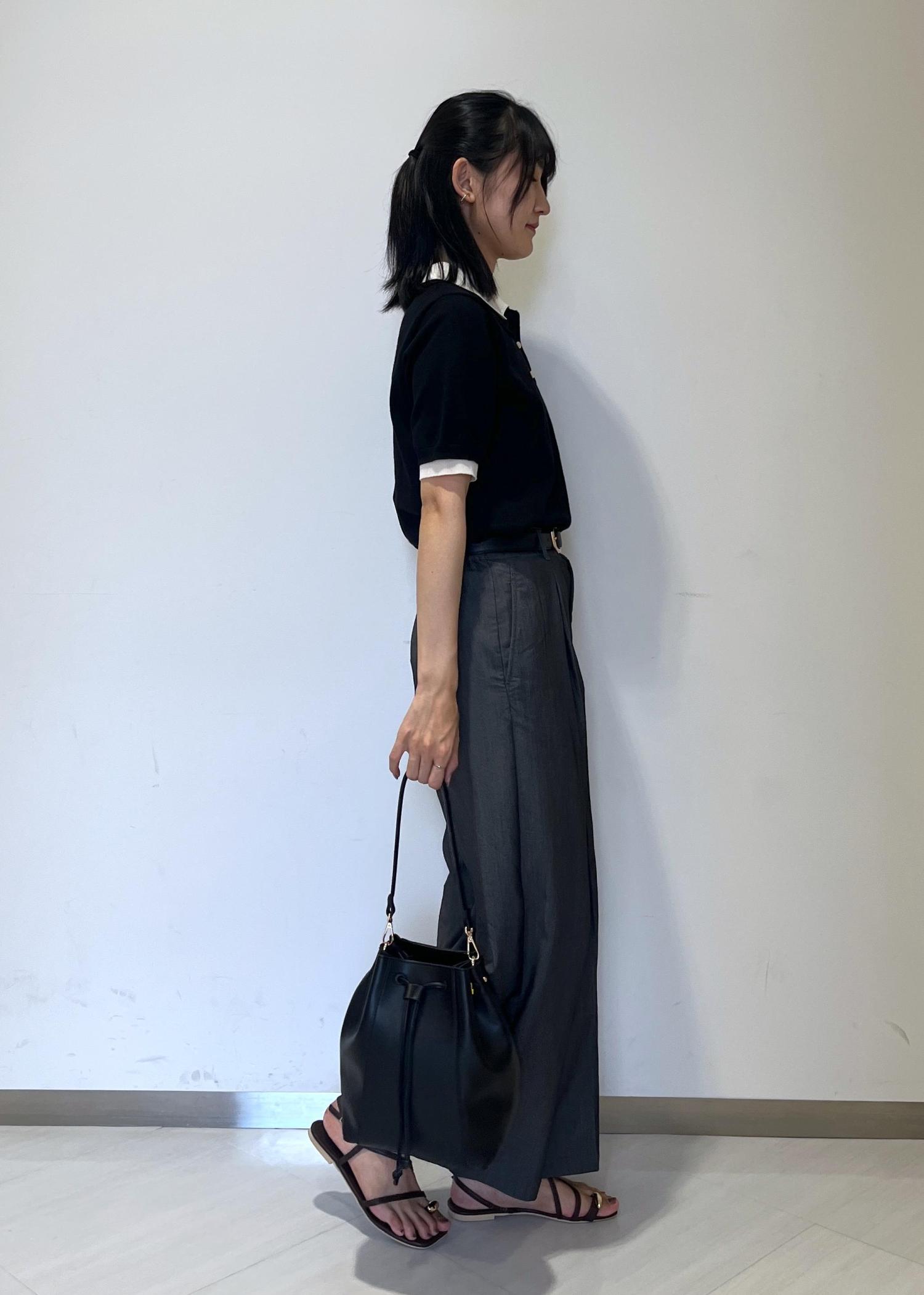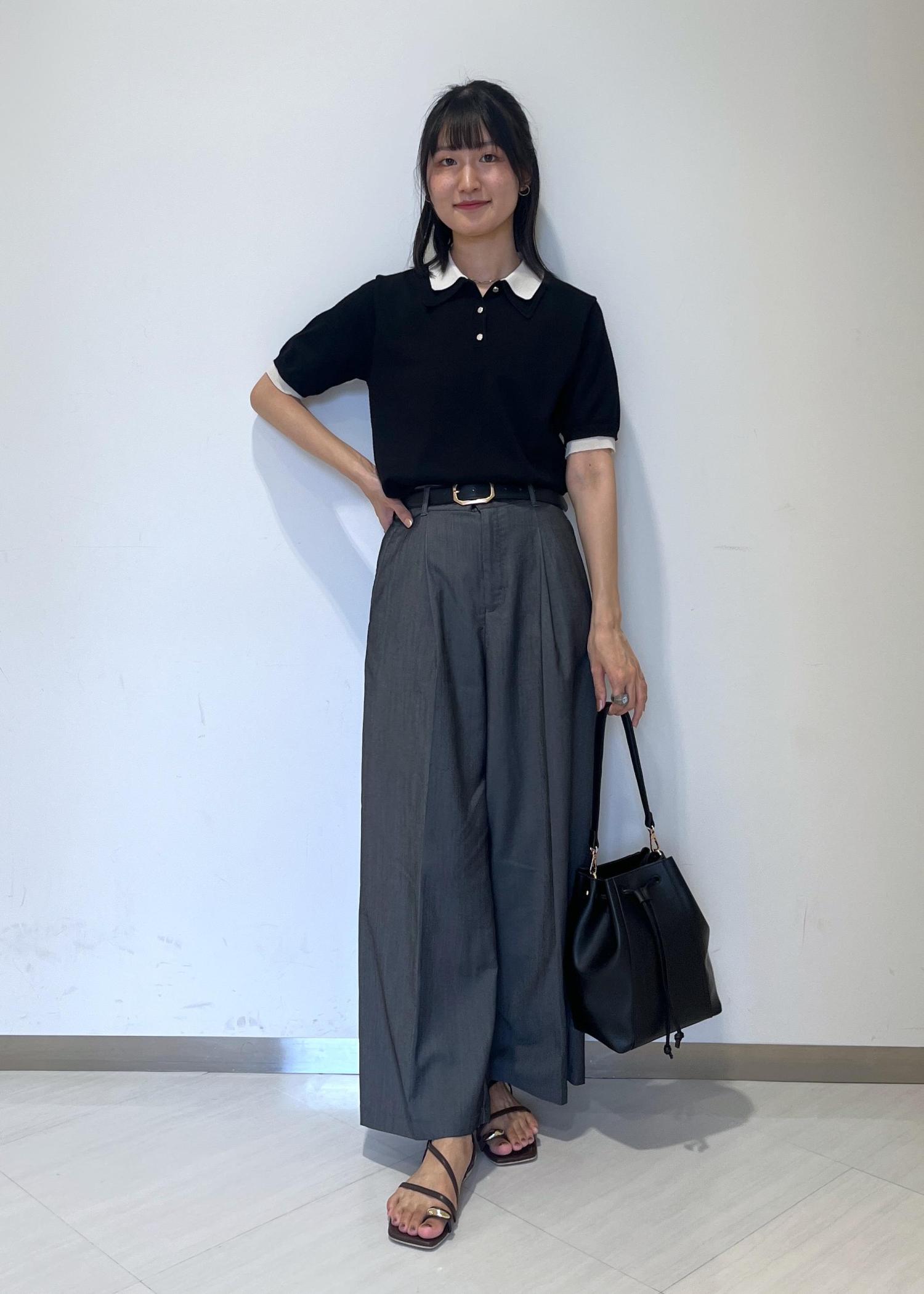 ニットポロシャツ×ワイドパンツ