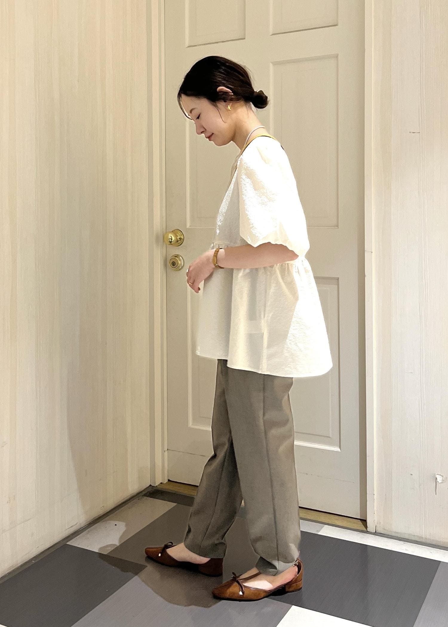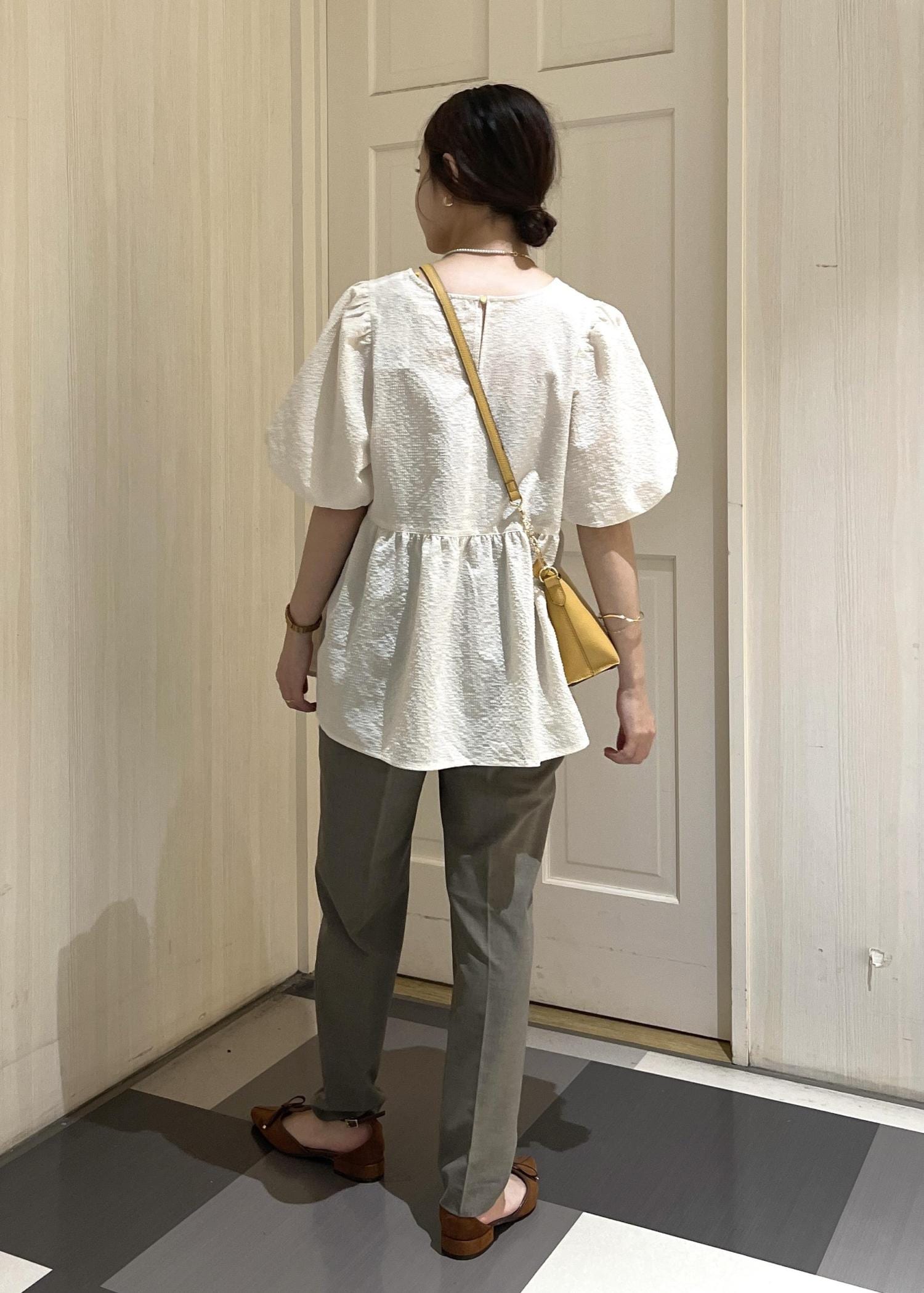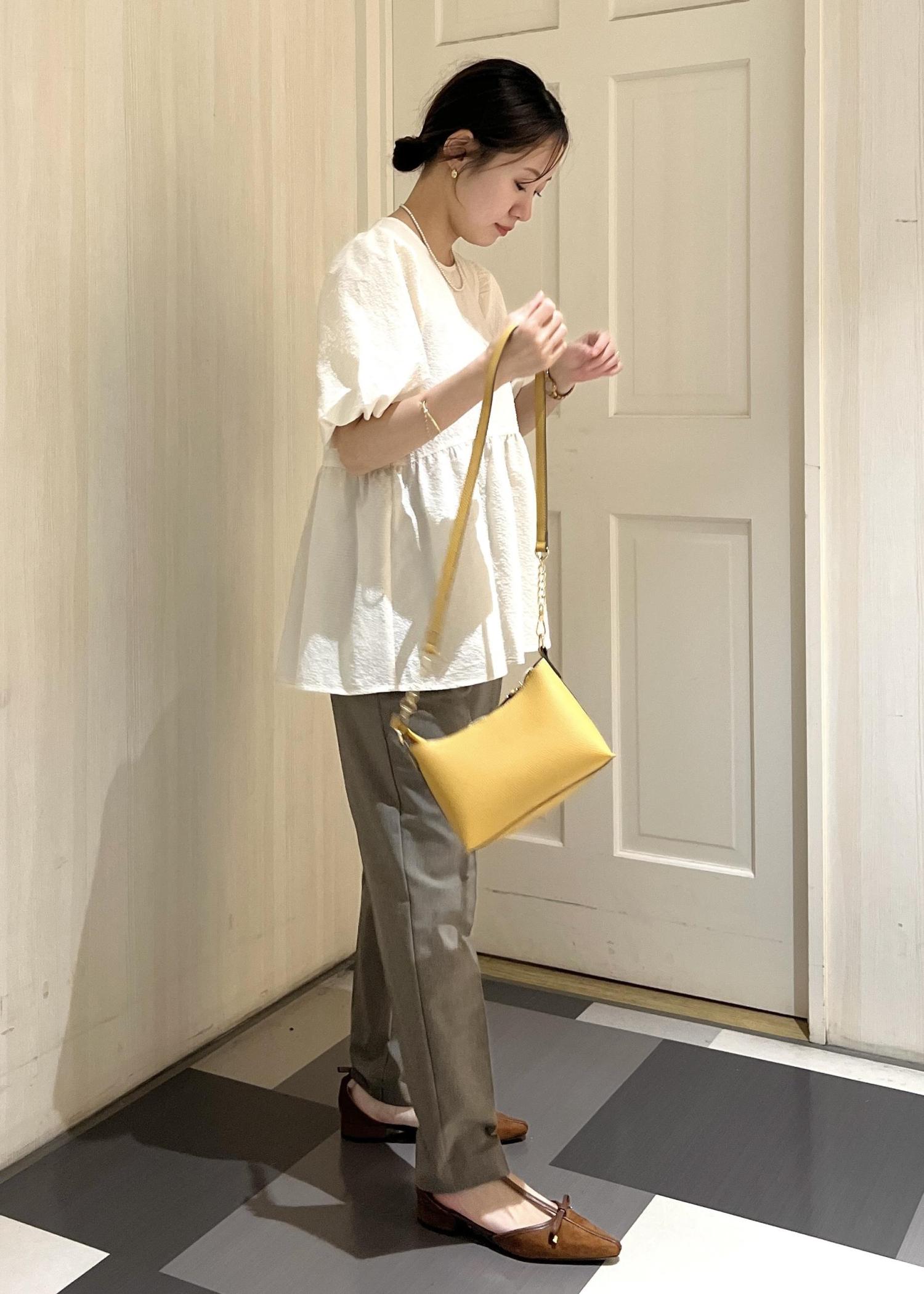 ペプラムトップスにイエローバッグを合わせて、可愛らしいお出かけコーデにしました!