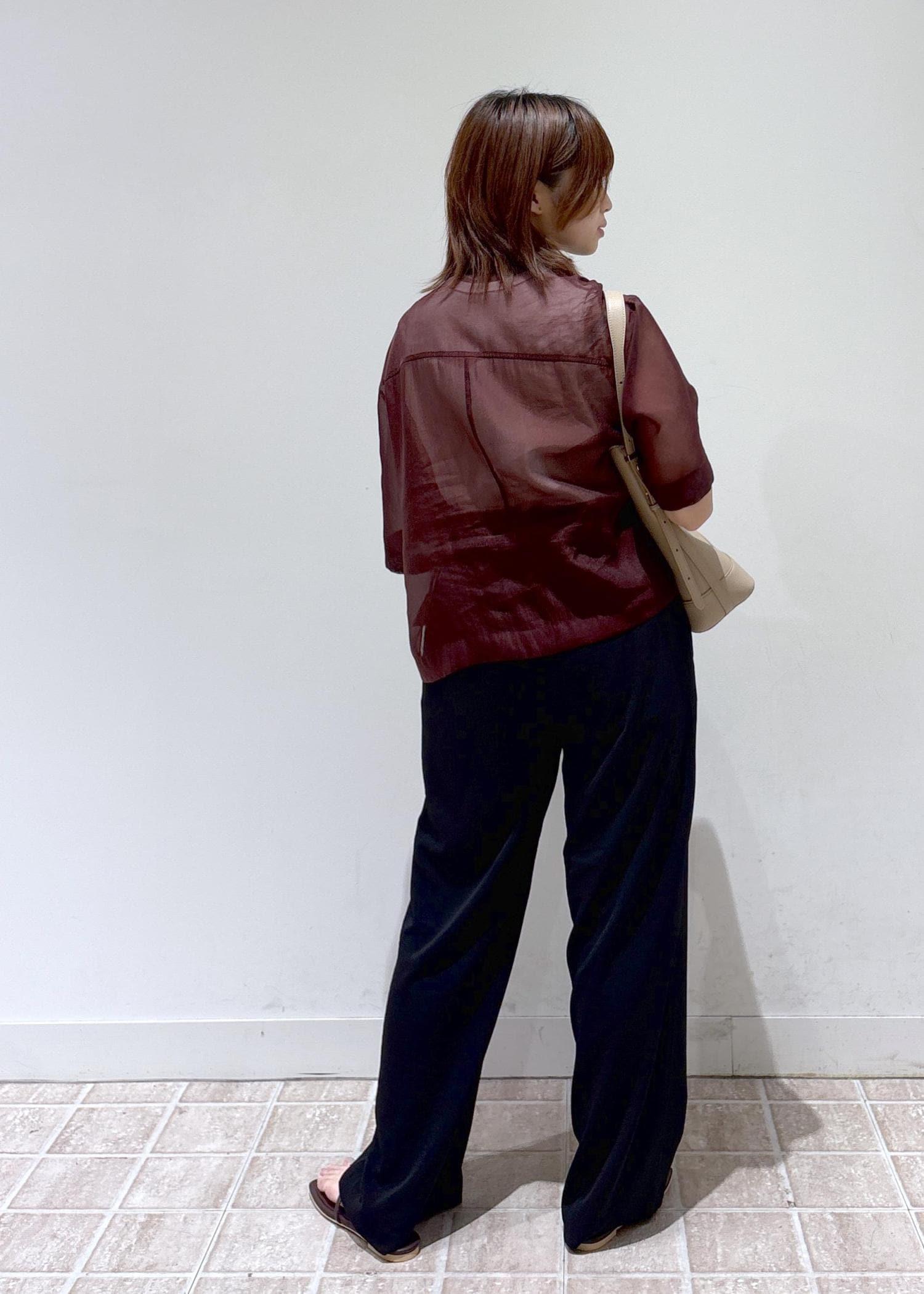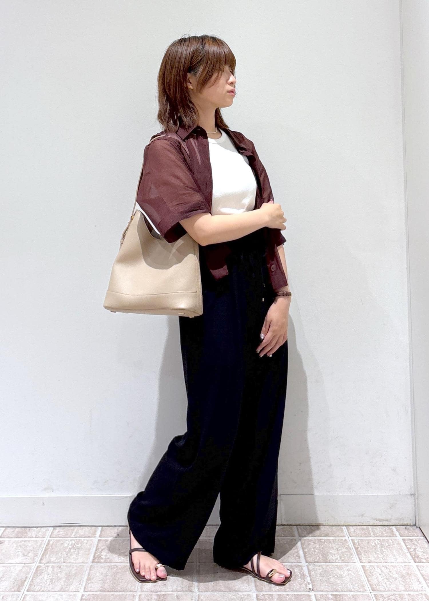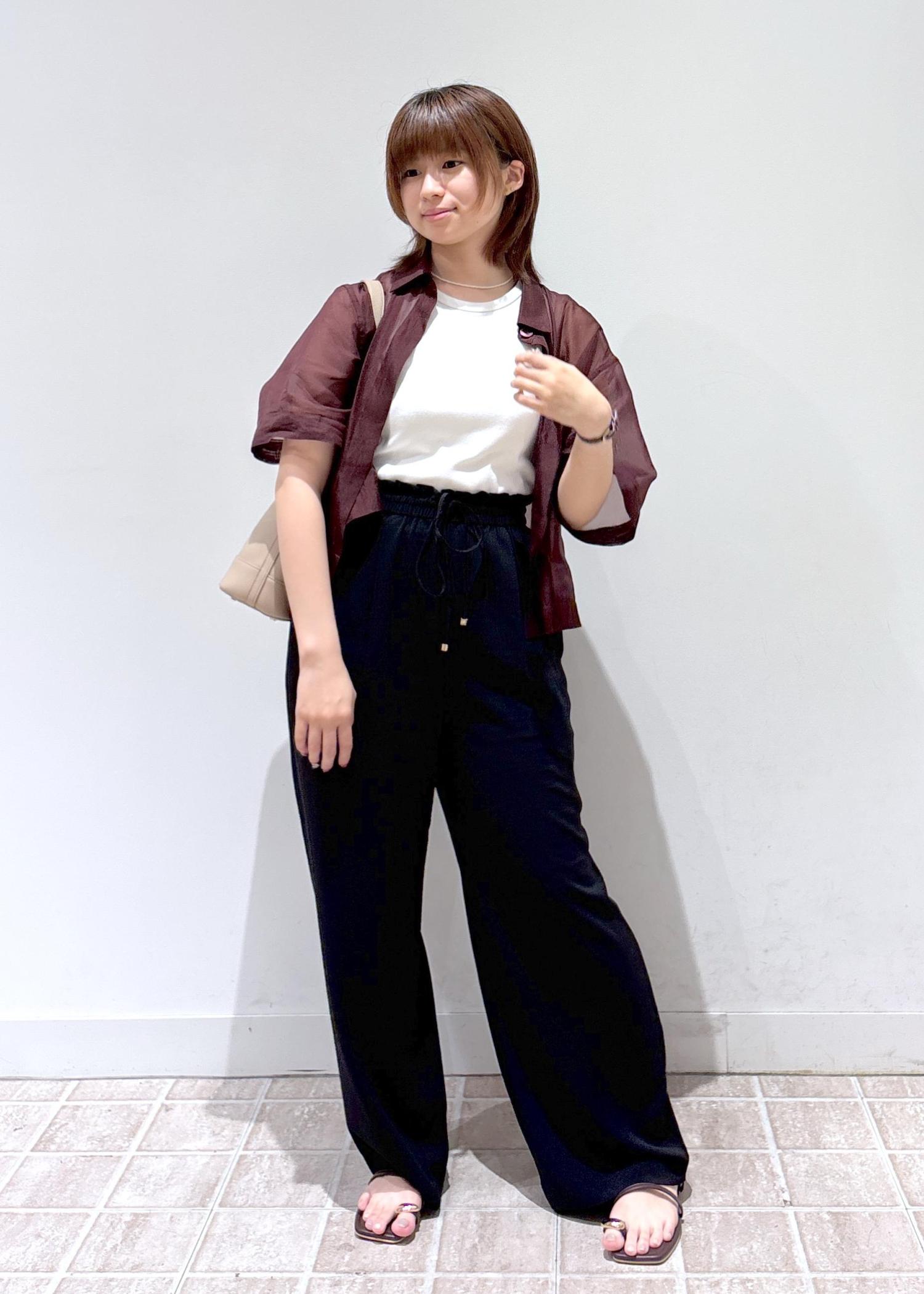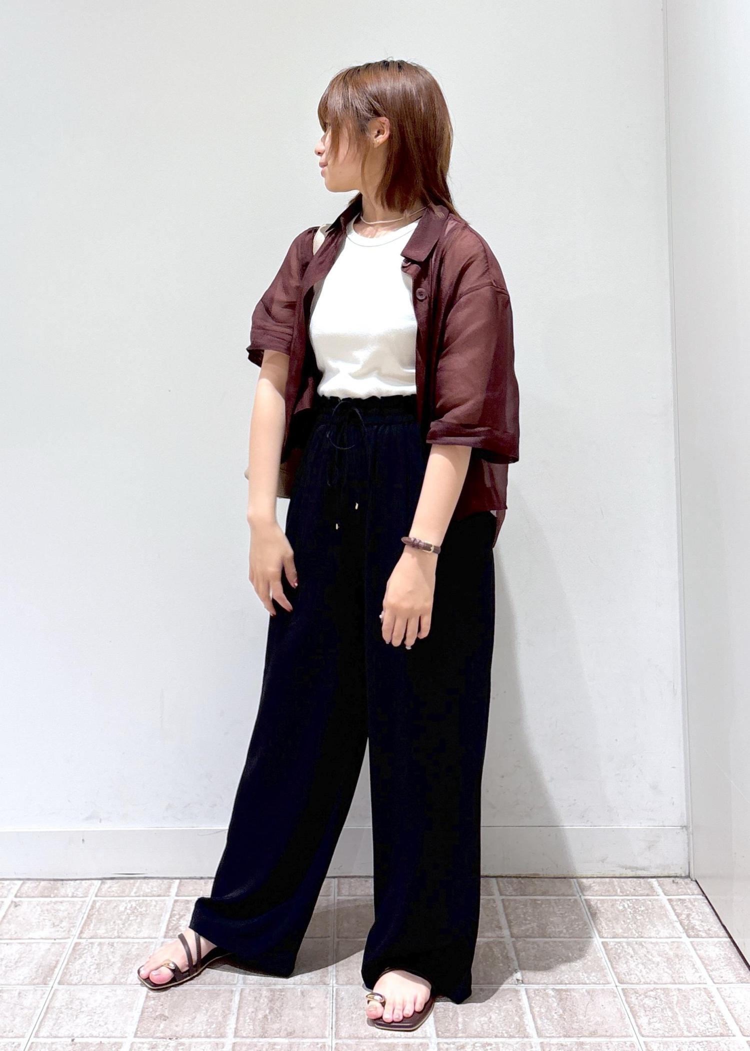 透けすぎないカーディガンとキレイめなパンツで今の時期に着れるキレイめコーデにしました。全て柄がなくシンプルですが程よい肌見せで大人な女性を出しました。