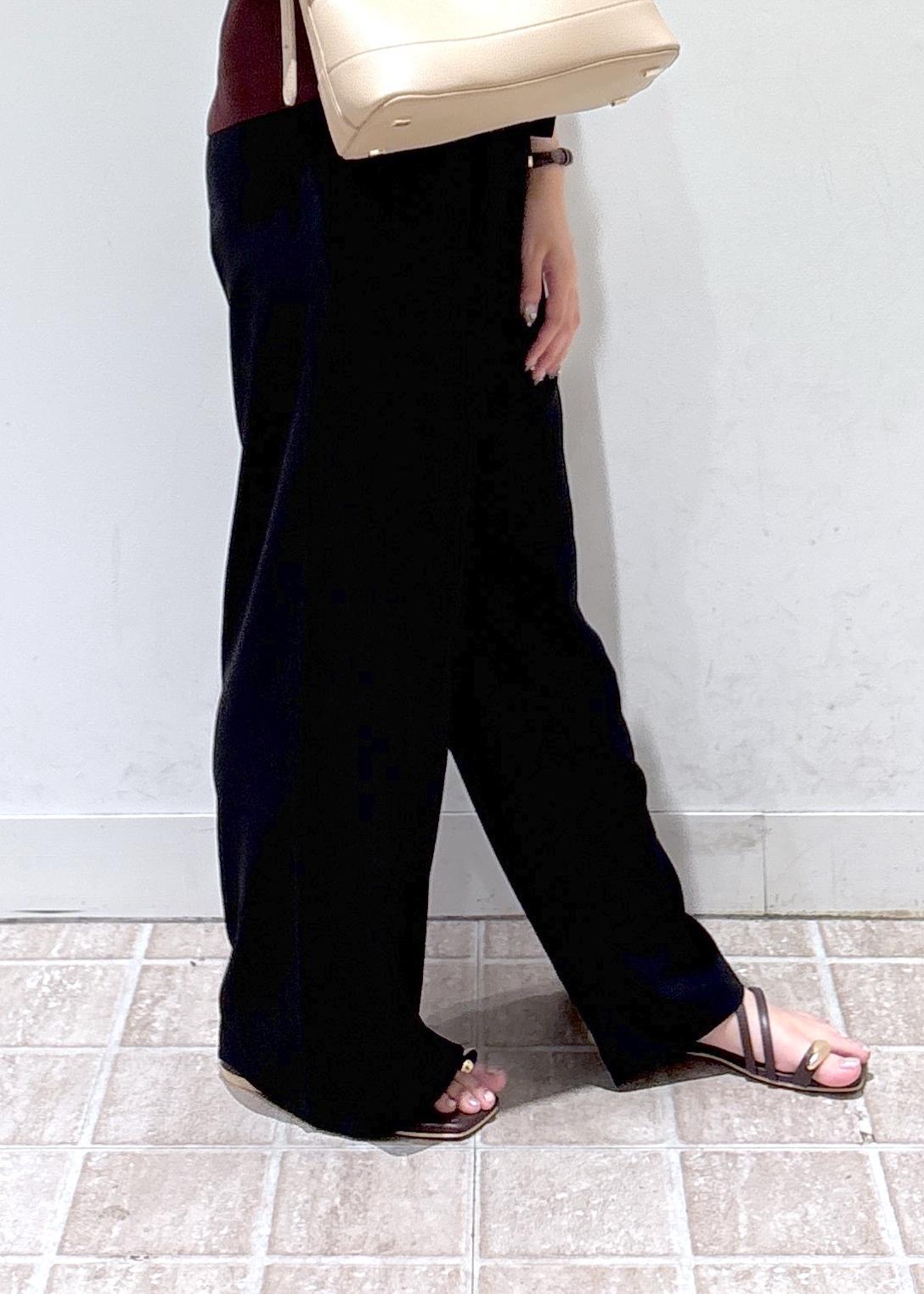 柔らかい素材感になっていて動いたりする時にとても最適なアイテムです。足のラインが拾いにくいアイテムなので太ももなど気になる方におすすめです。150cmの私で、ヒールのない靴ですと地面についてしまう長さですので少し厚みのある靴と合わせていただくと良いです。