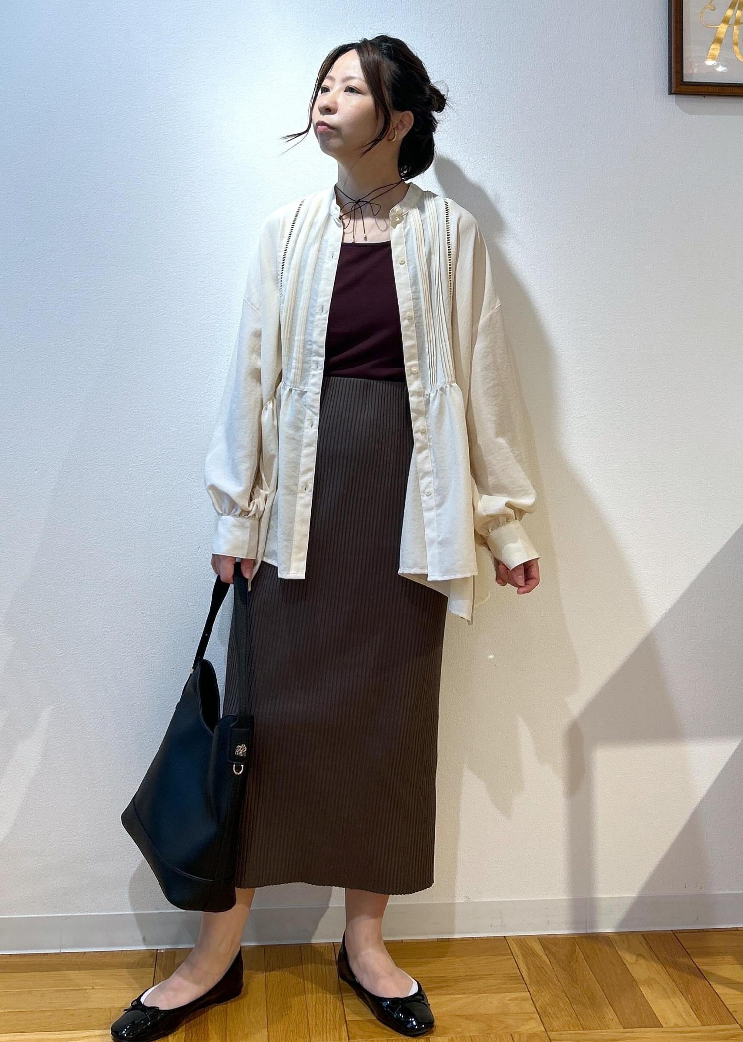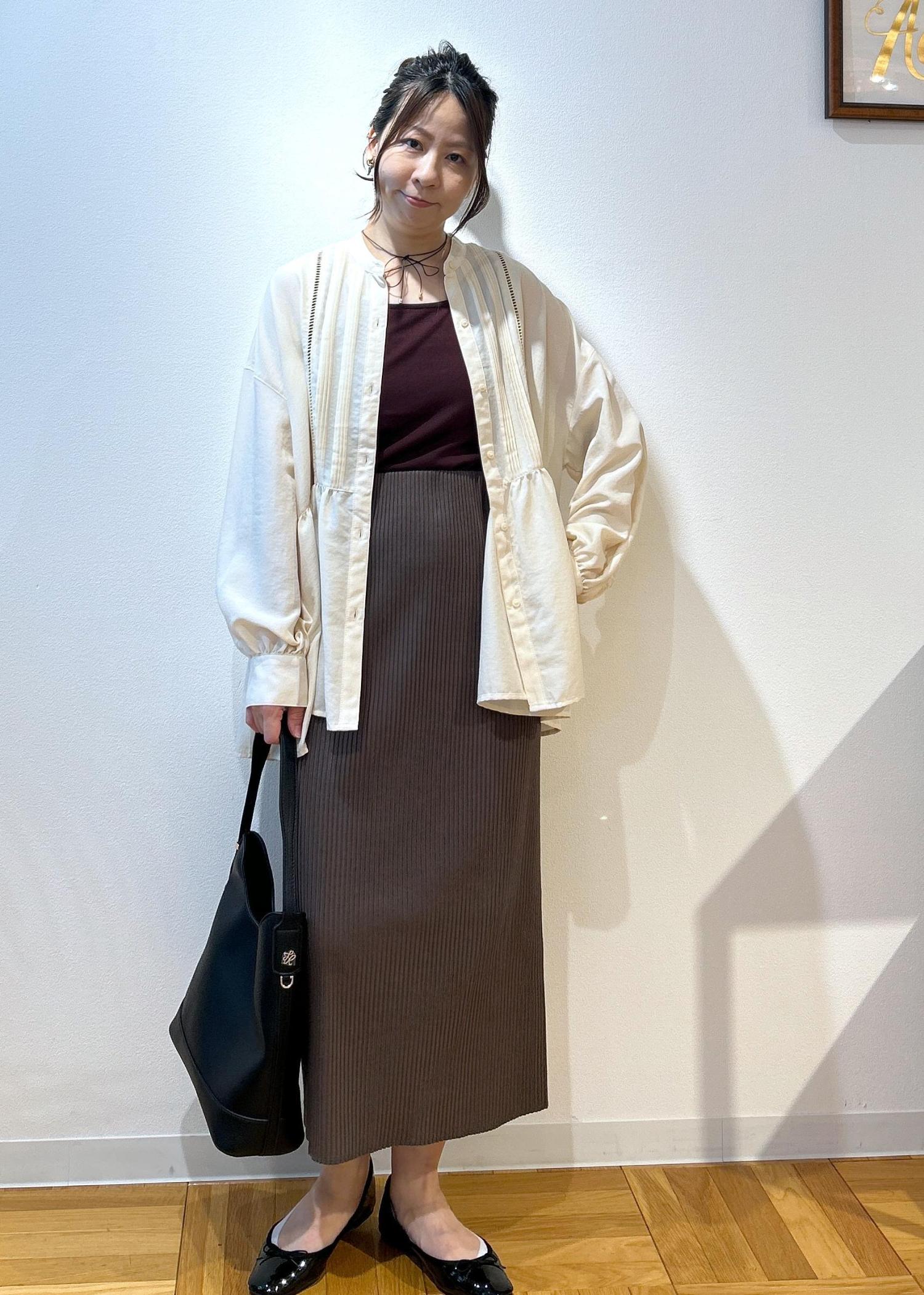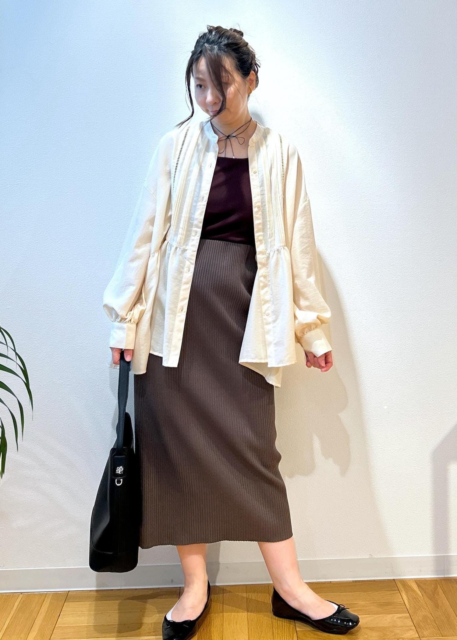 羽織にしてるブラウスは体温調節で羽織ったり、巻いたりできるので、おすすめスタイリングです。