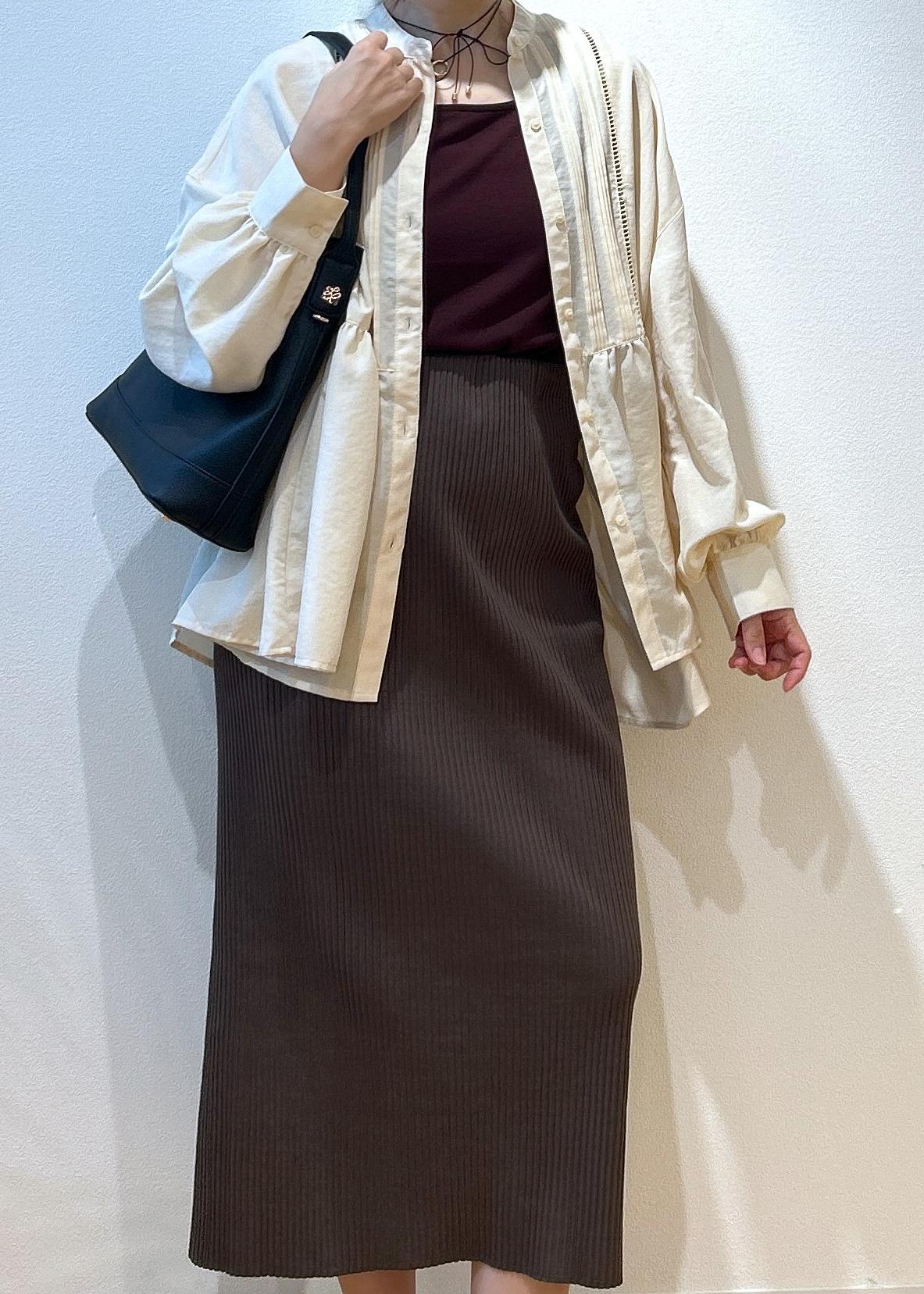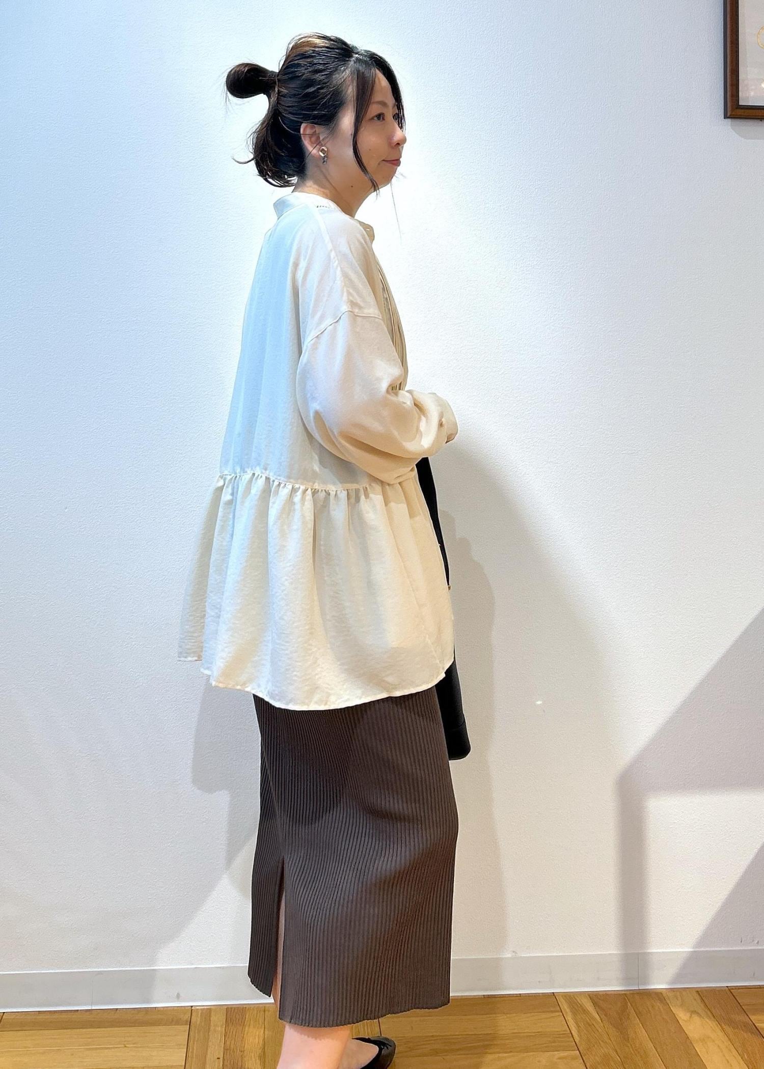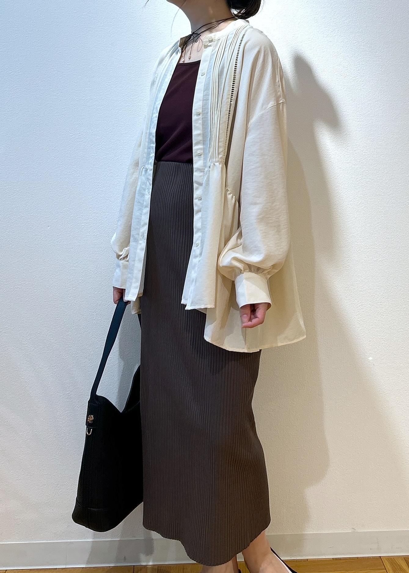 羽織にしてるブラウスは体温調節で羽織ったり、巻いたりできるので、おすすめスタイリングです。