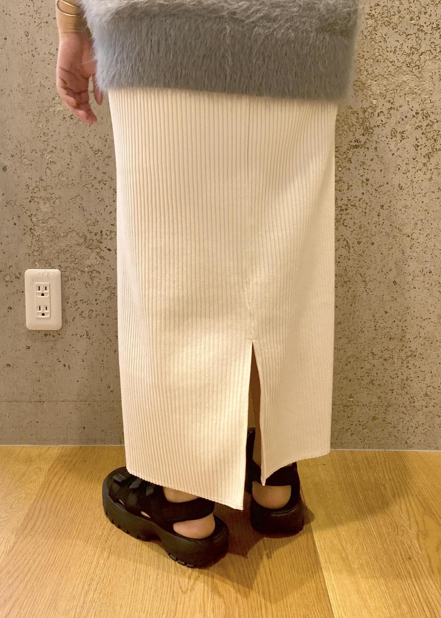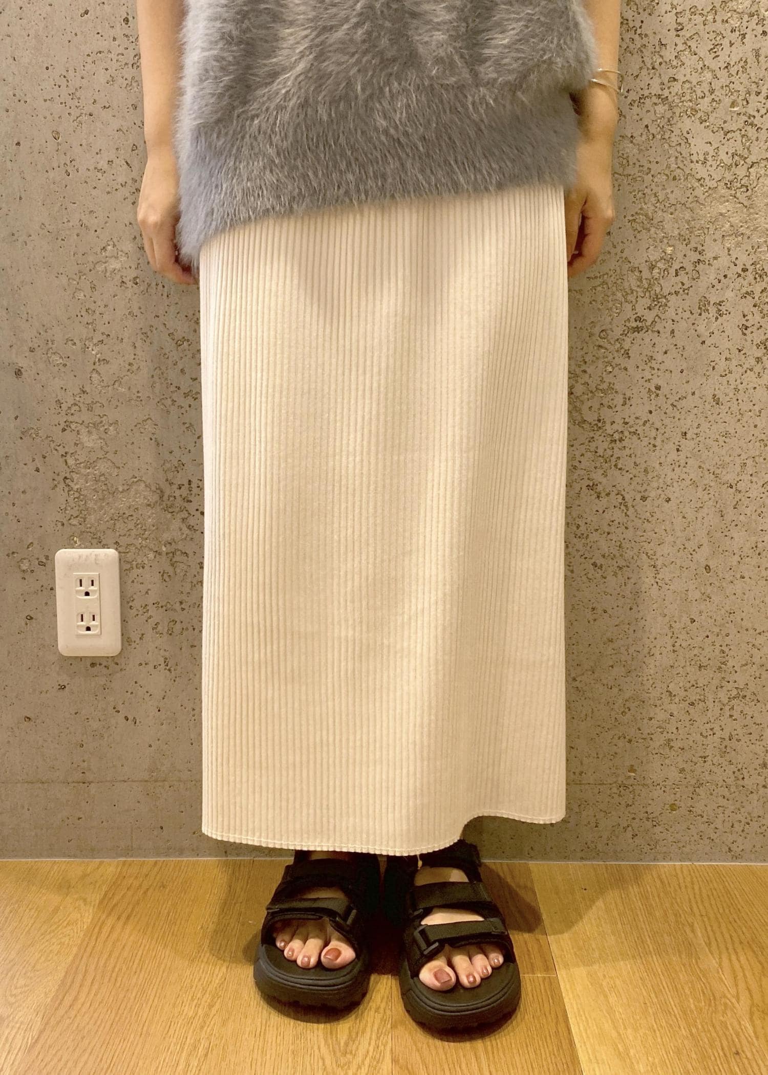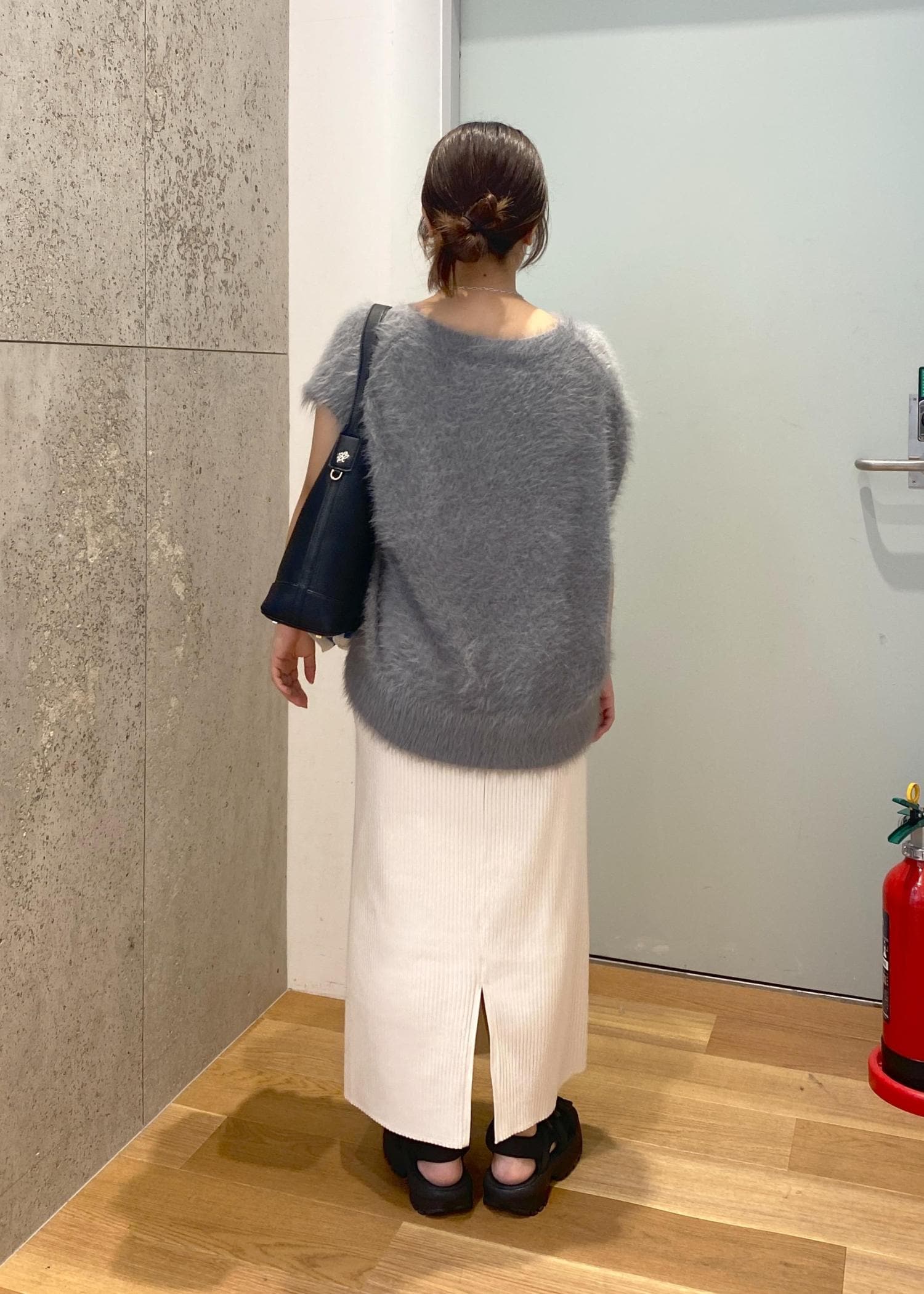 今期も大人気のシャギーニットベストで大人カジュアルなスタイリングにしました。丈が長めですのでIラインのスッキリシルエットのスカートを合わせました。