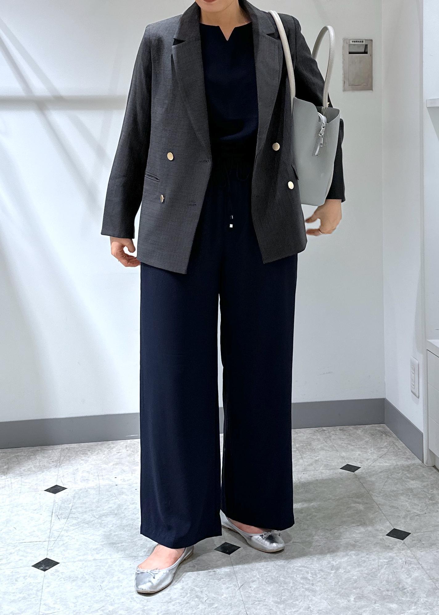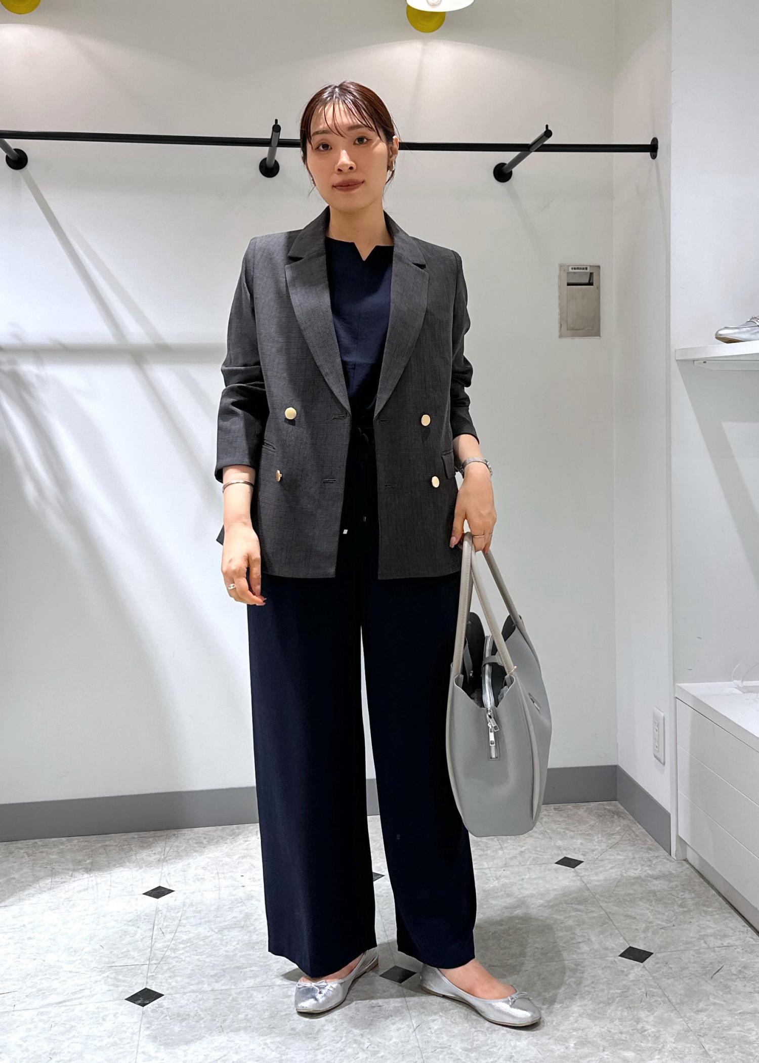 毎年大人気の金ボタンジャケットはミドル丈を着用しています。