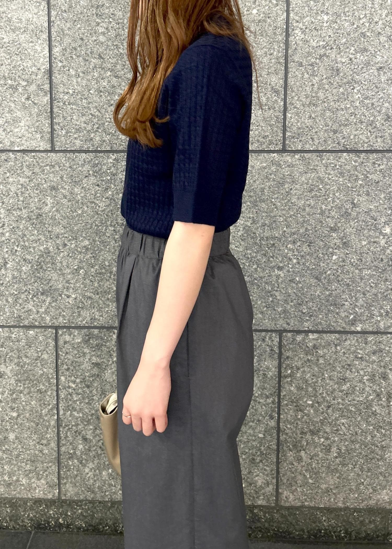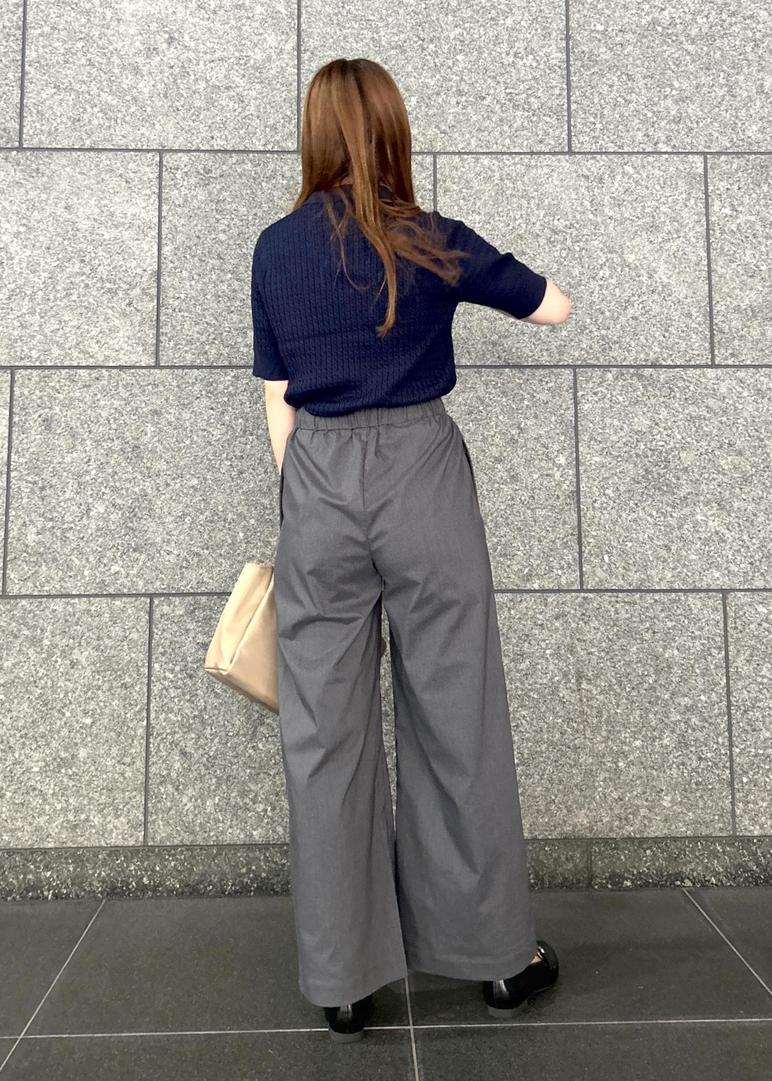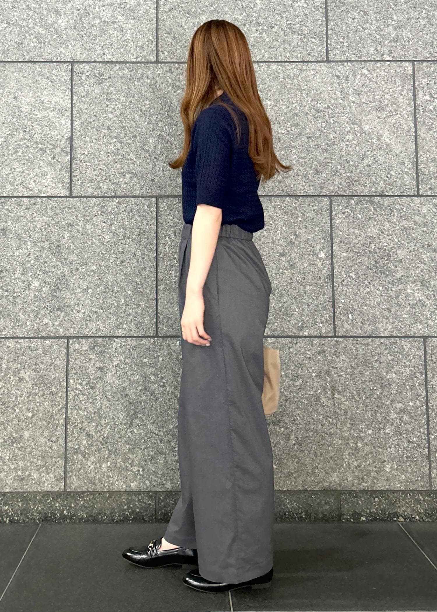 金ボタンが高見えするネイビーのトップスにグレーのワイドパンツを合わせて、大人らしさを演出したコーデに仕上げました!