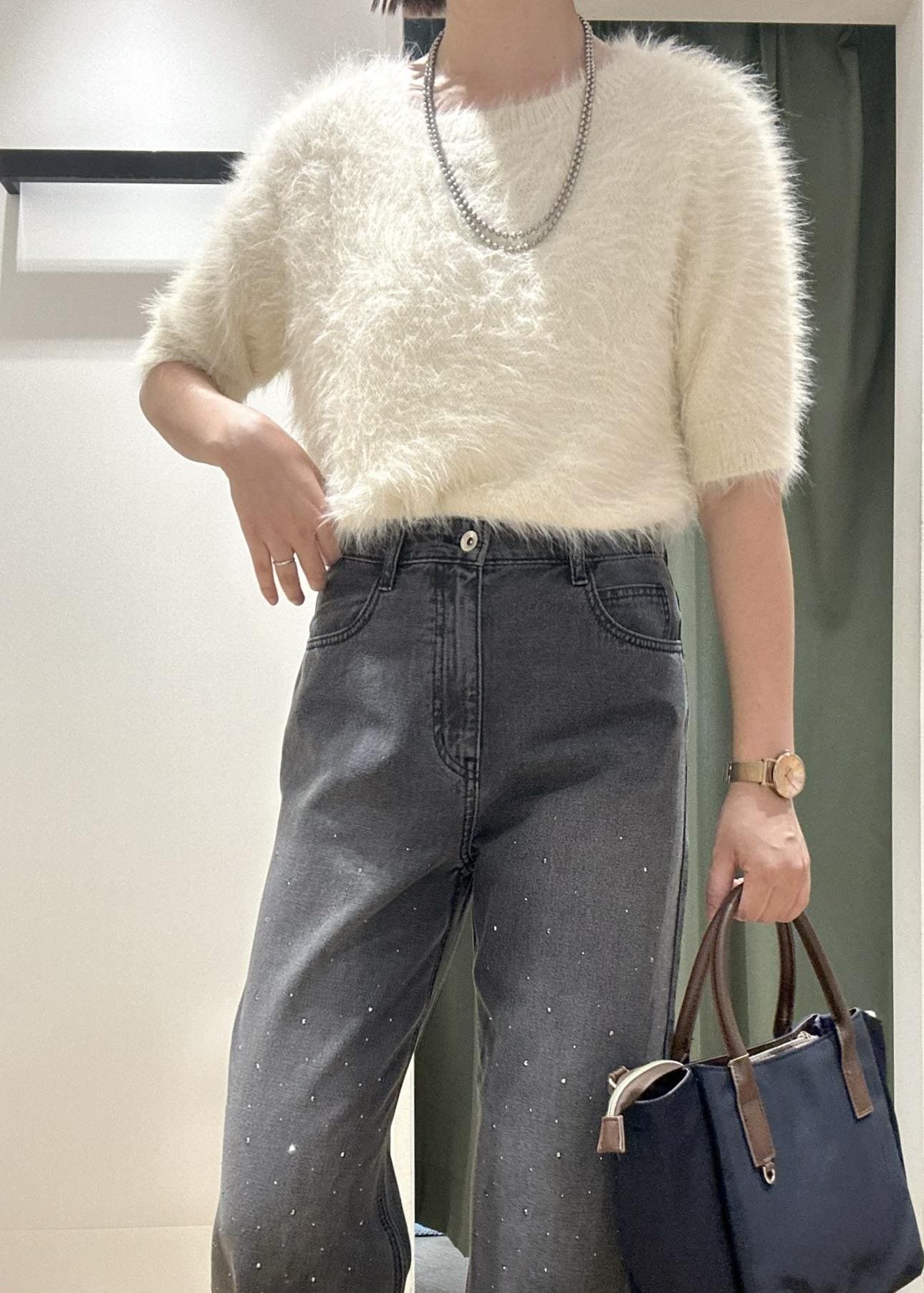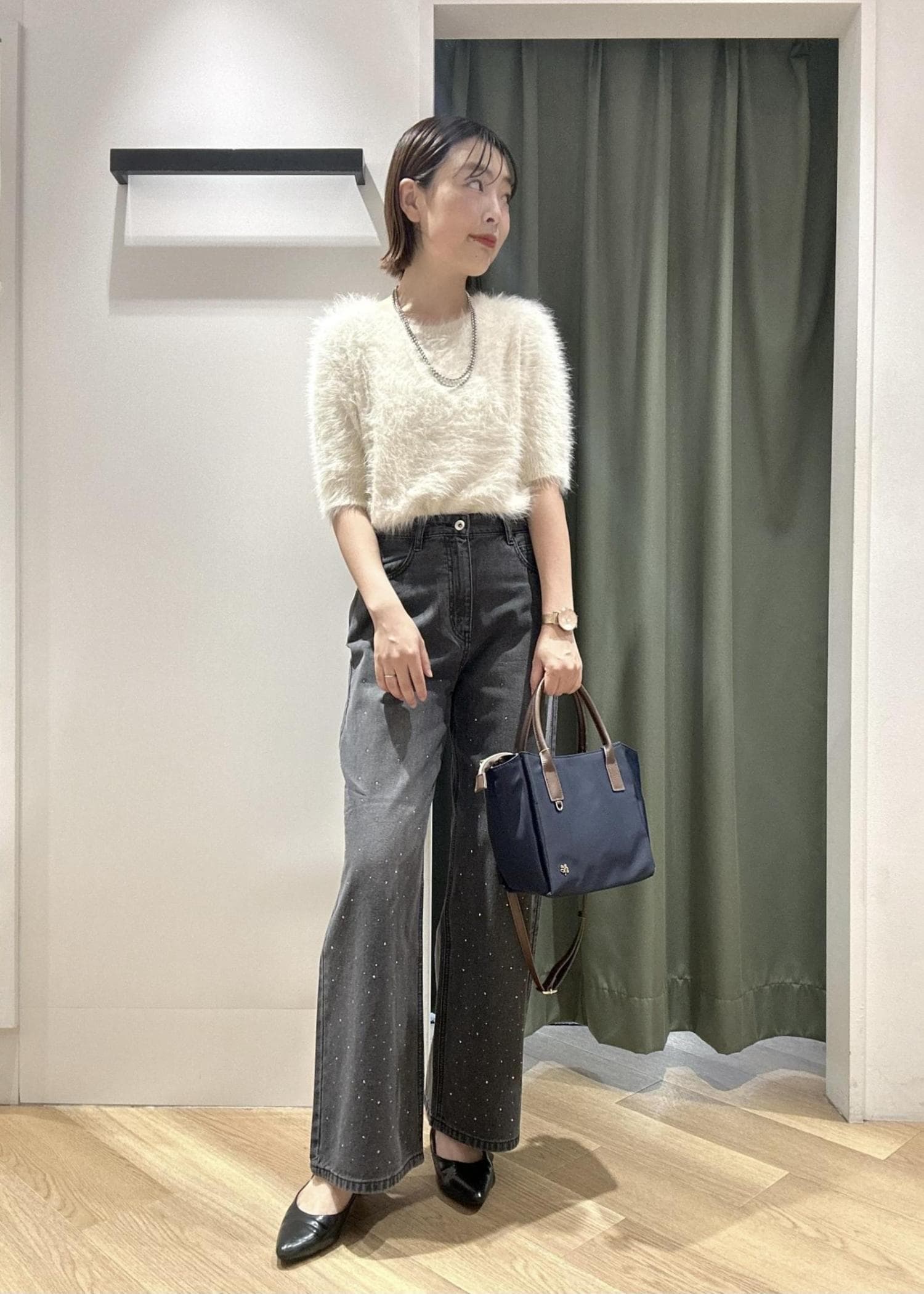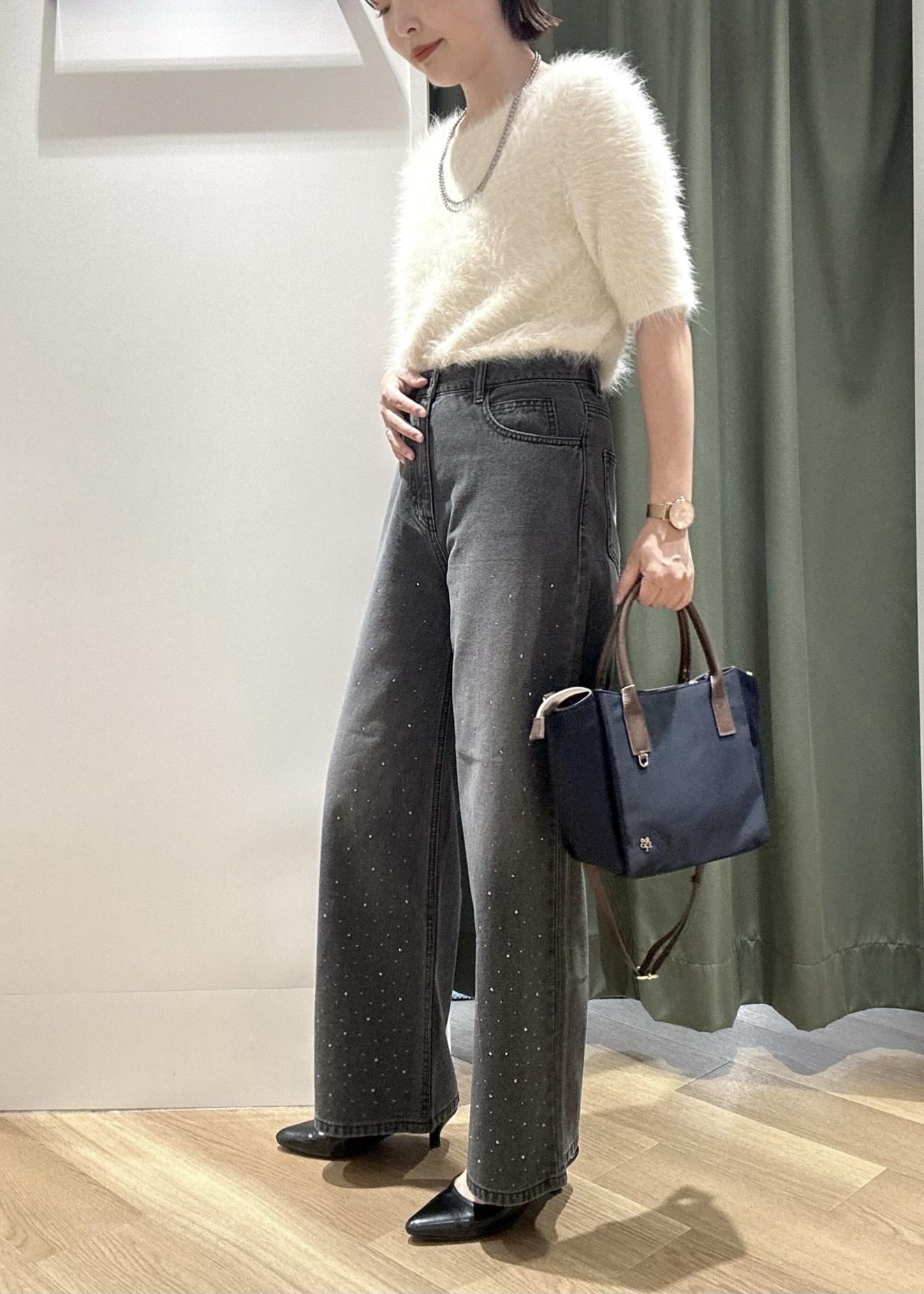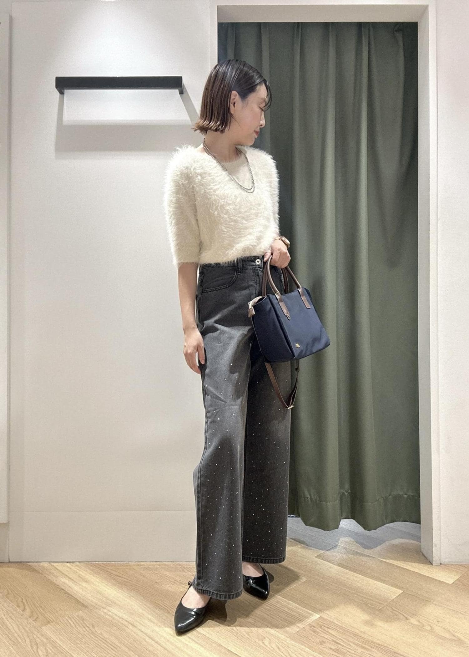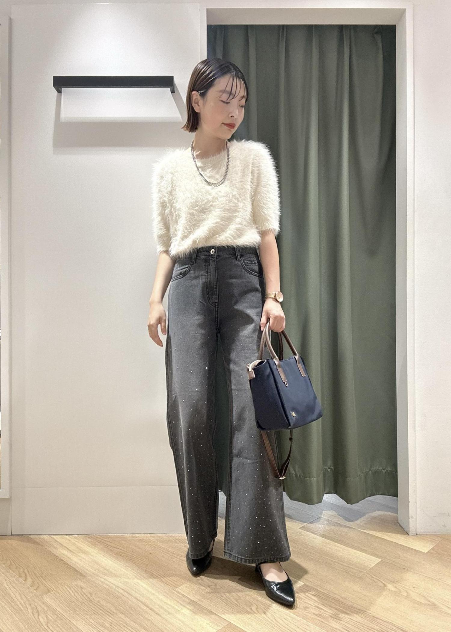 ふんわりフェミニンな白のジャギーに存在感のあるビジューのデニムを合わせた秋のコーディネートです♪足元のミュールで、全体的に大人っぽい印象に。