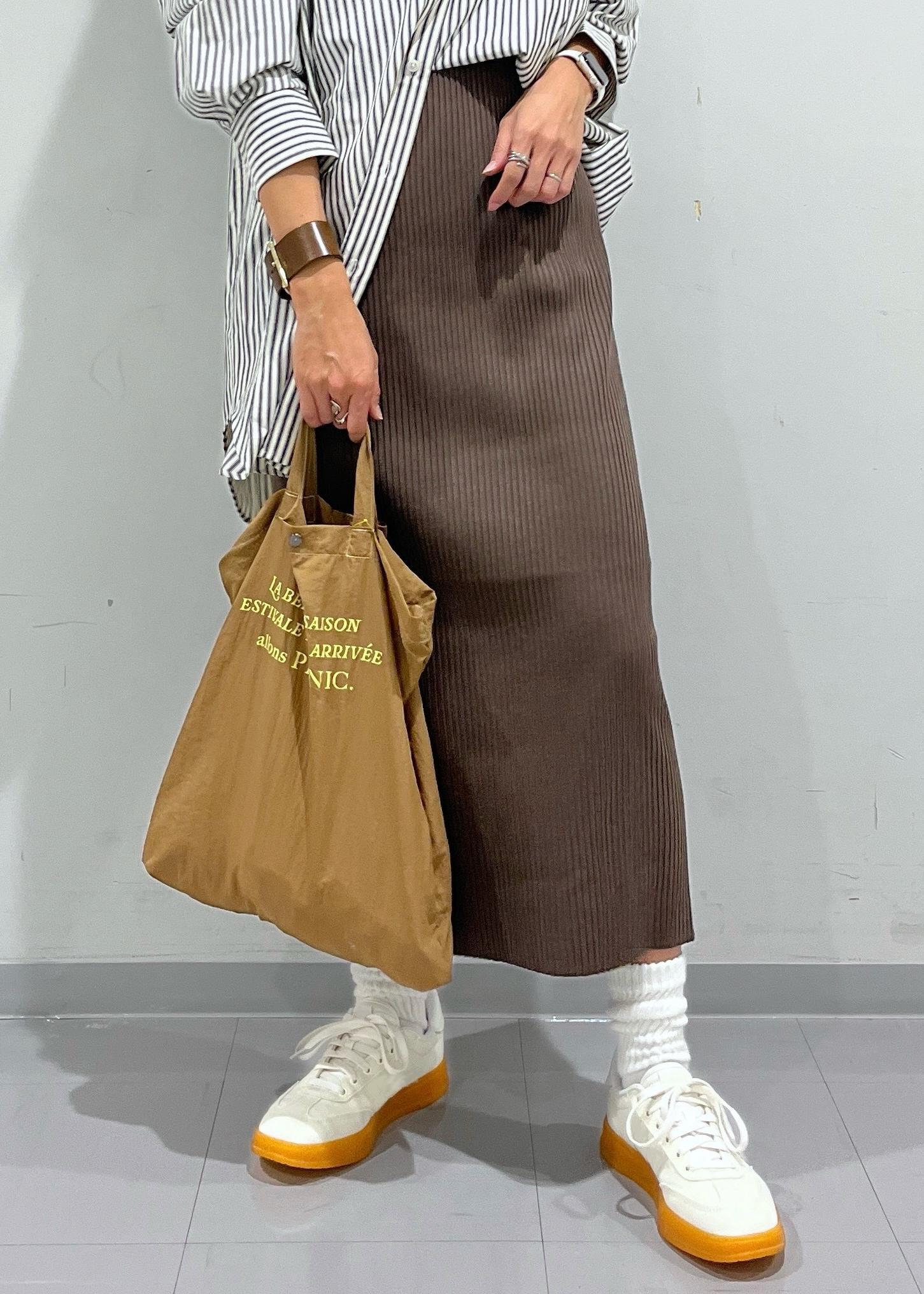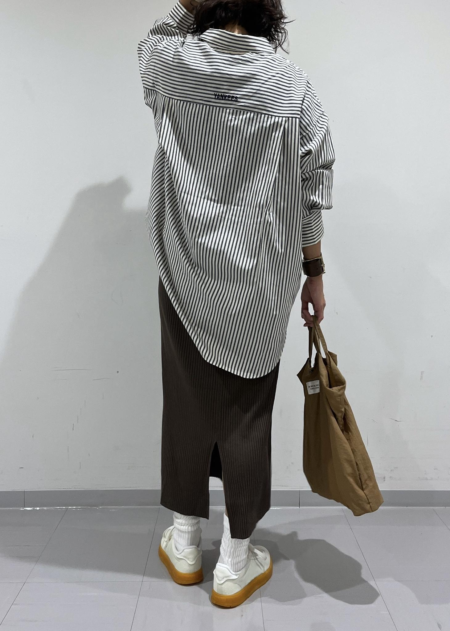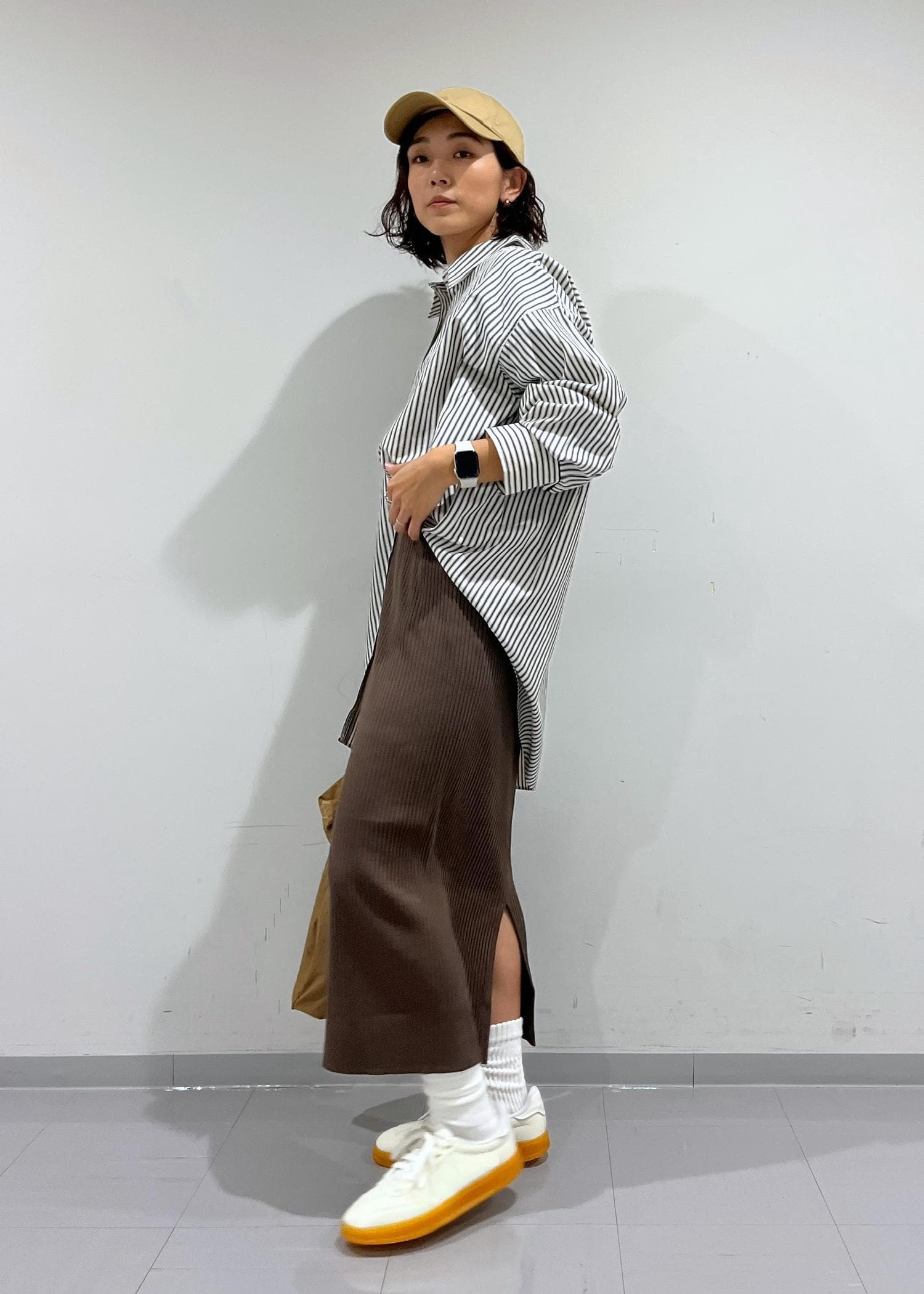足元や小物をスポーティにしているのでボトムはアイラインスカートで女性らしさを残しました。