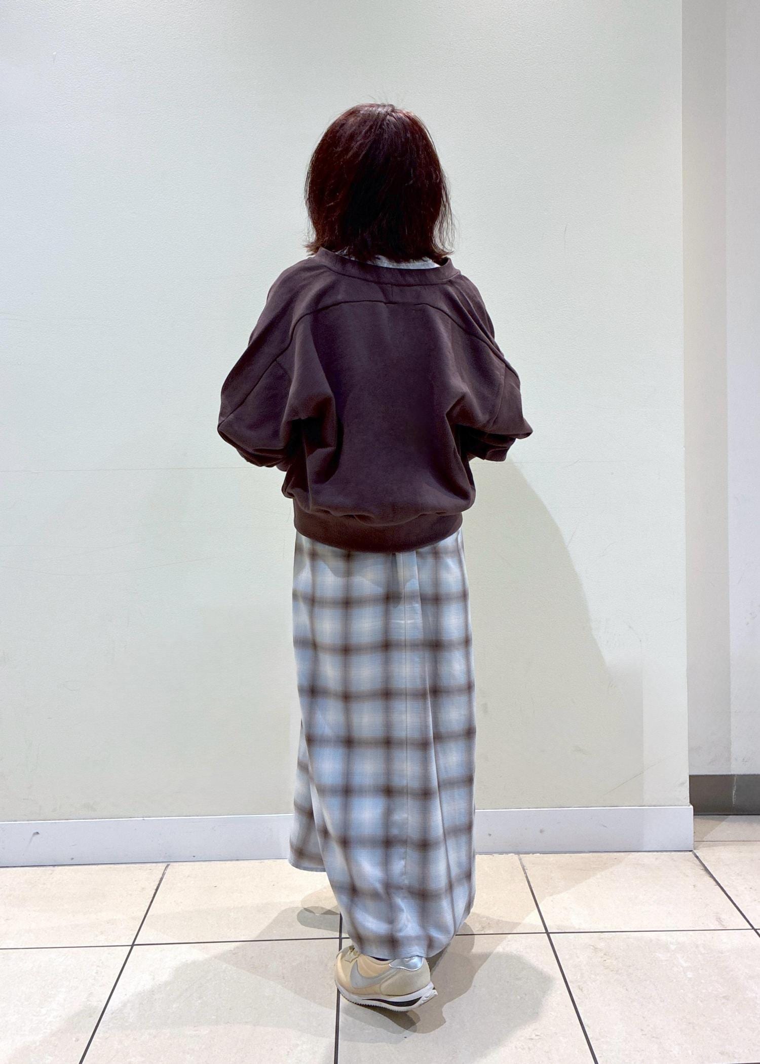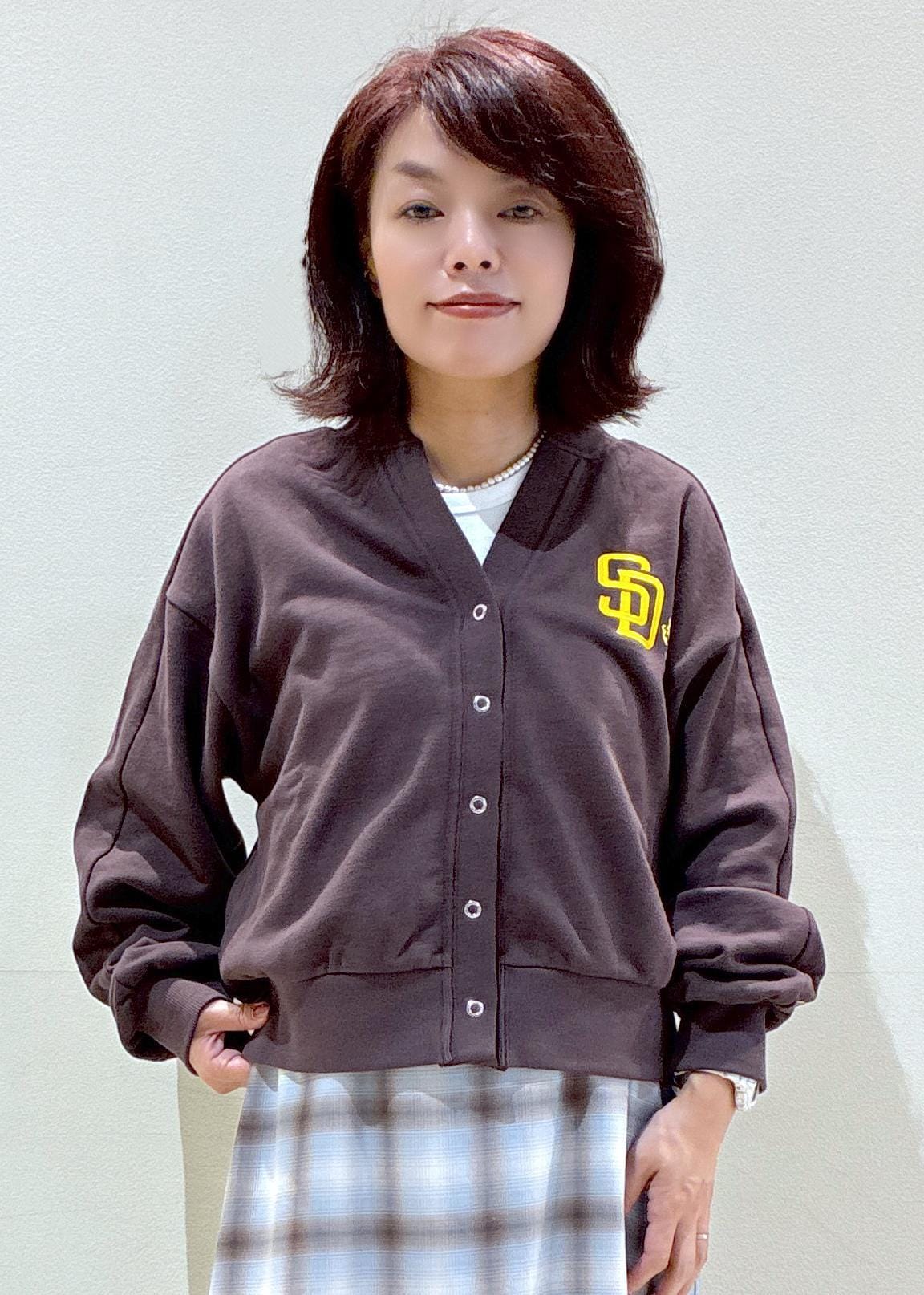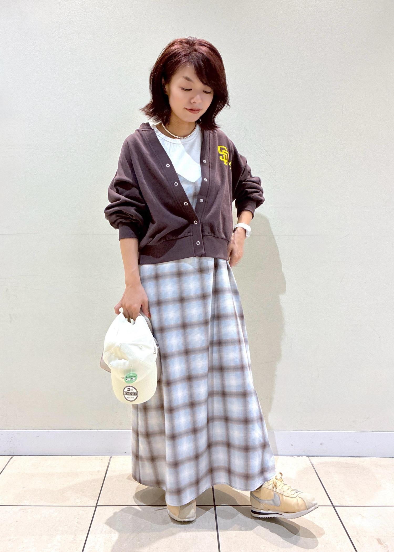 昨年も大人気⭐︎MLBコレクションにパドレスが新しく加わりました。トレンドのチョコレートブラウンが今の気分にぴったり!袖口やロゴにあしらわれたPEANUTSのキャラクターのモチーフがポイントです。かわいらしくチェックキャミワンピ合わせでロペピクニックらしいスポーティにコーディネートしました。スニーカーは私物です
