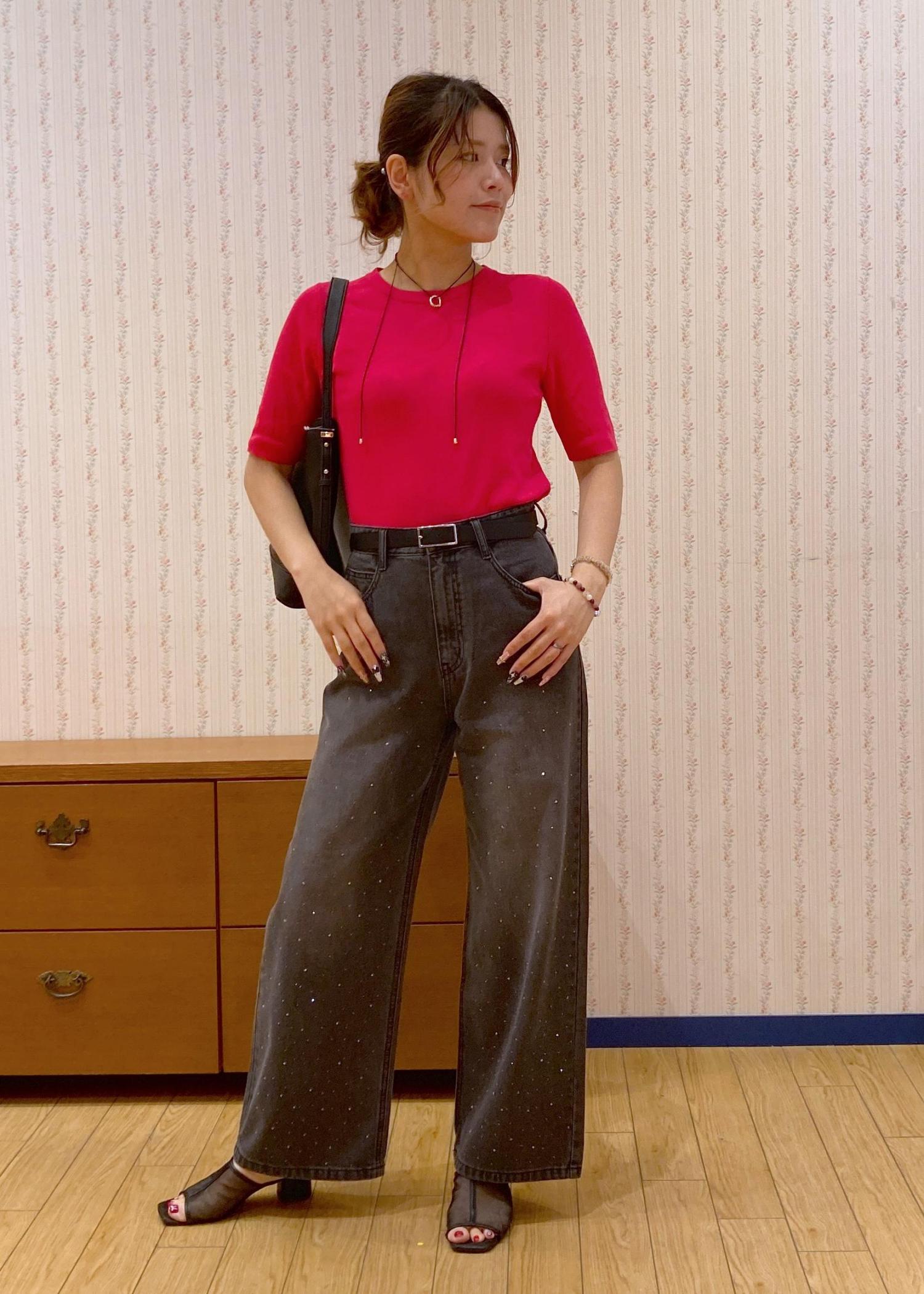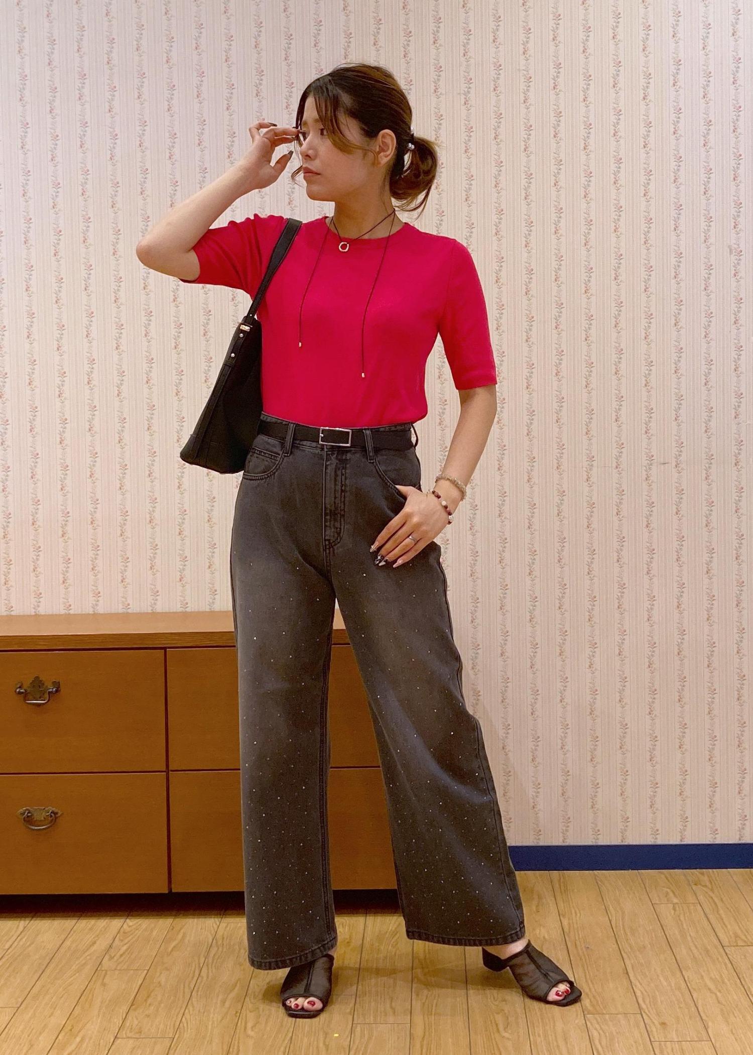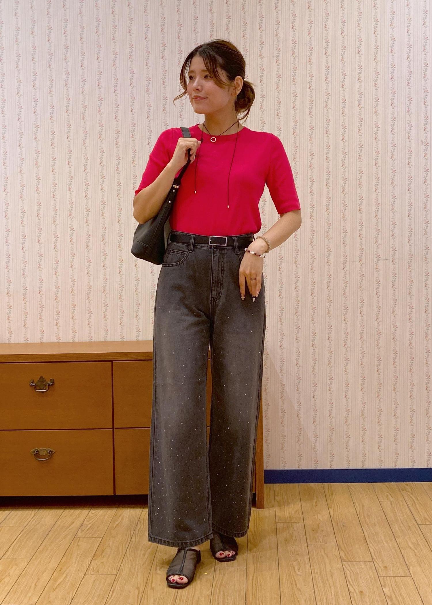 ビビットピンクのトップスにキラキラとしたビジューが映えるブラックデニムを合わせたシンプルなカジュアルコーディネートです。