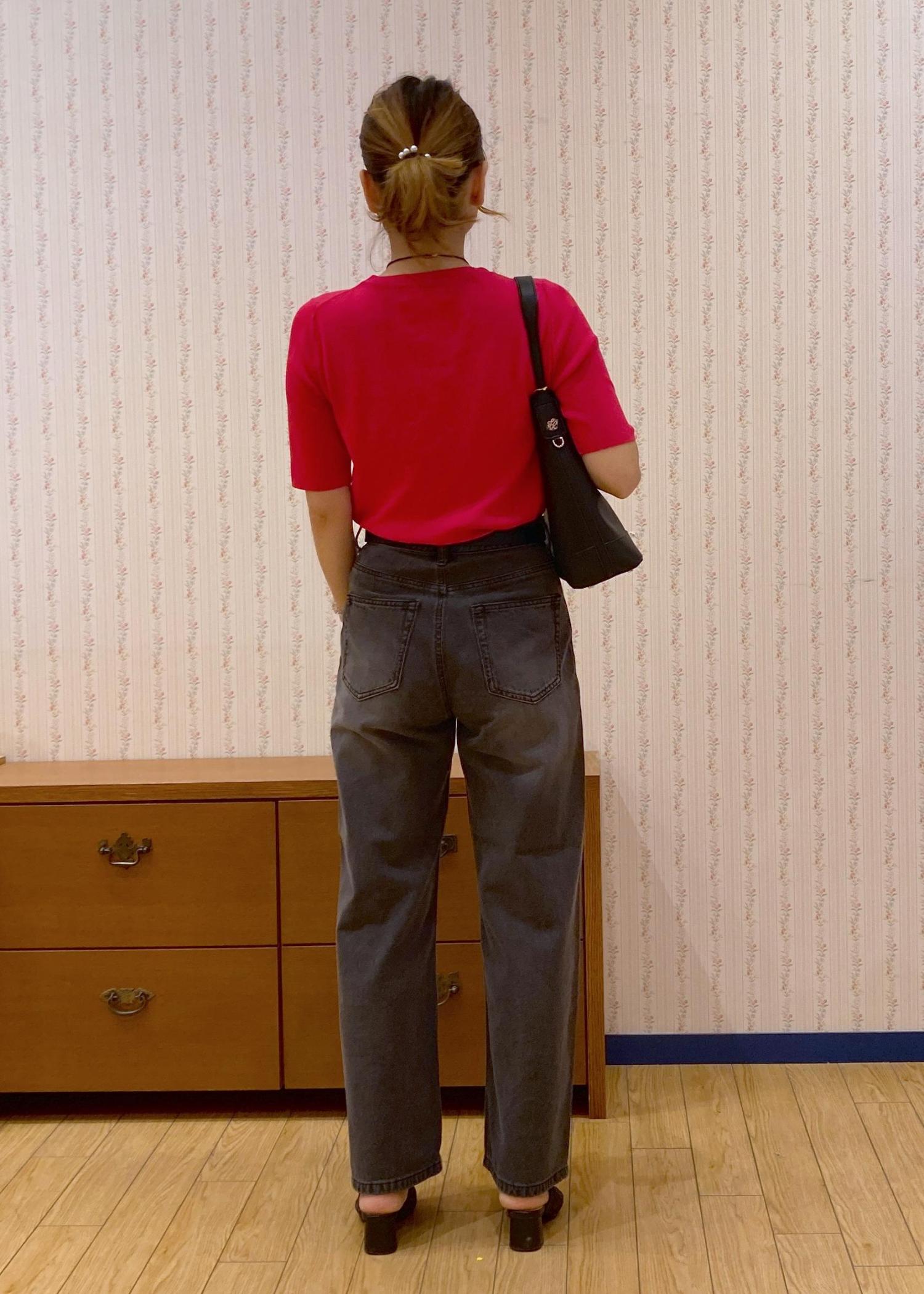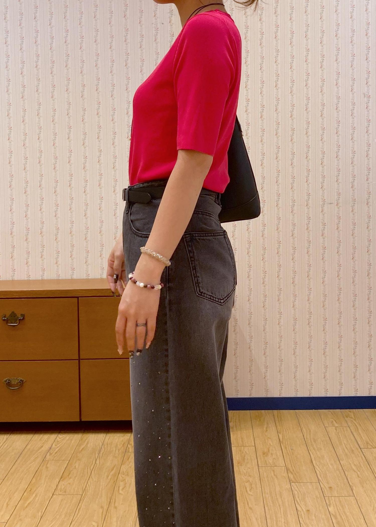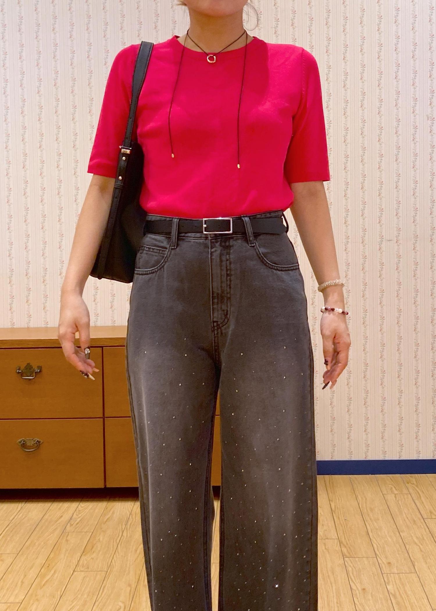 ビビットピンクのトップスにキラキラとしたビジューが映えるブラックデニムを合わせたシンプルなカジュアルコーディネートです。