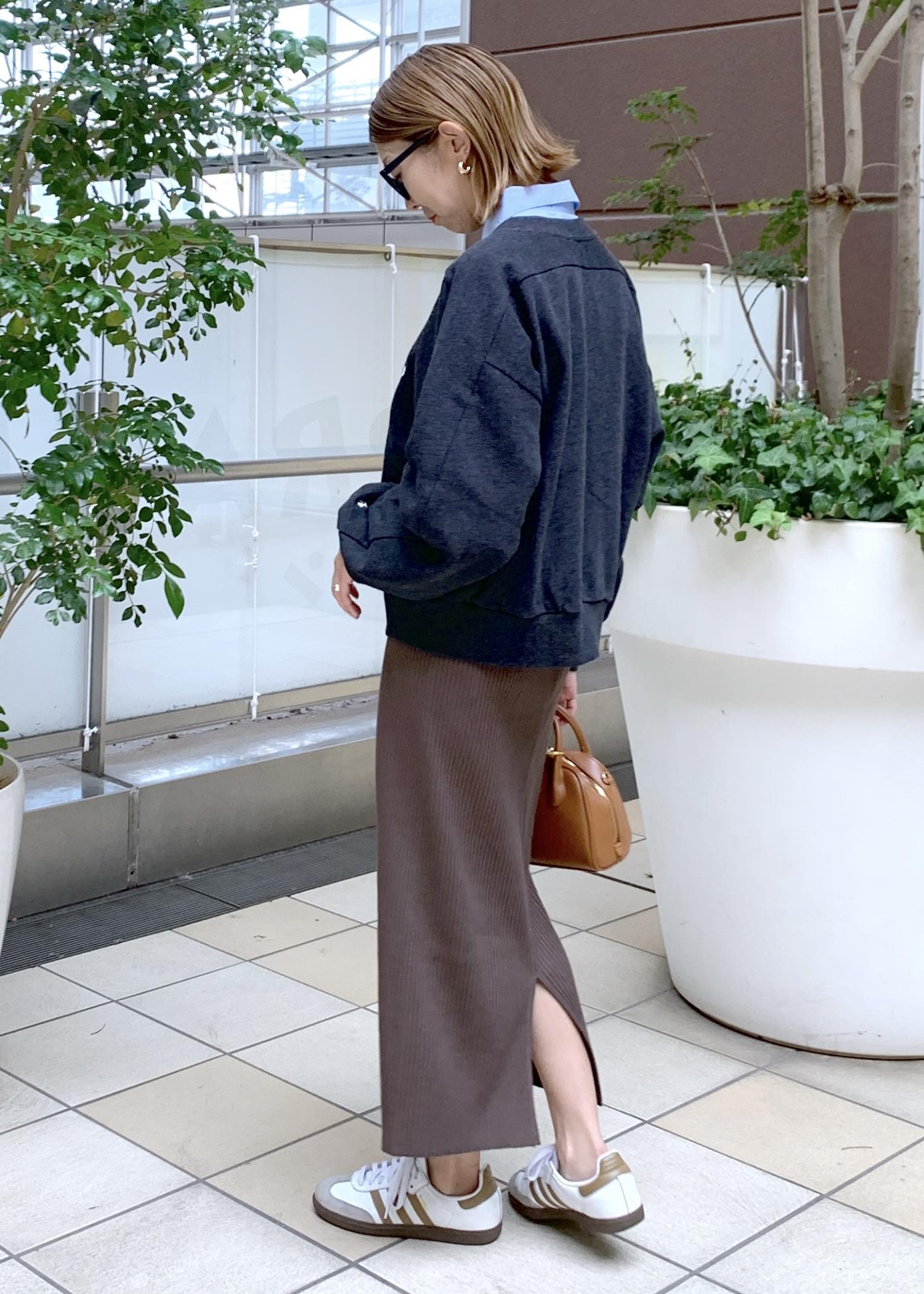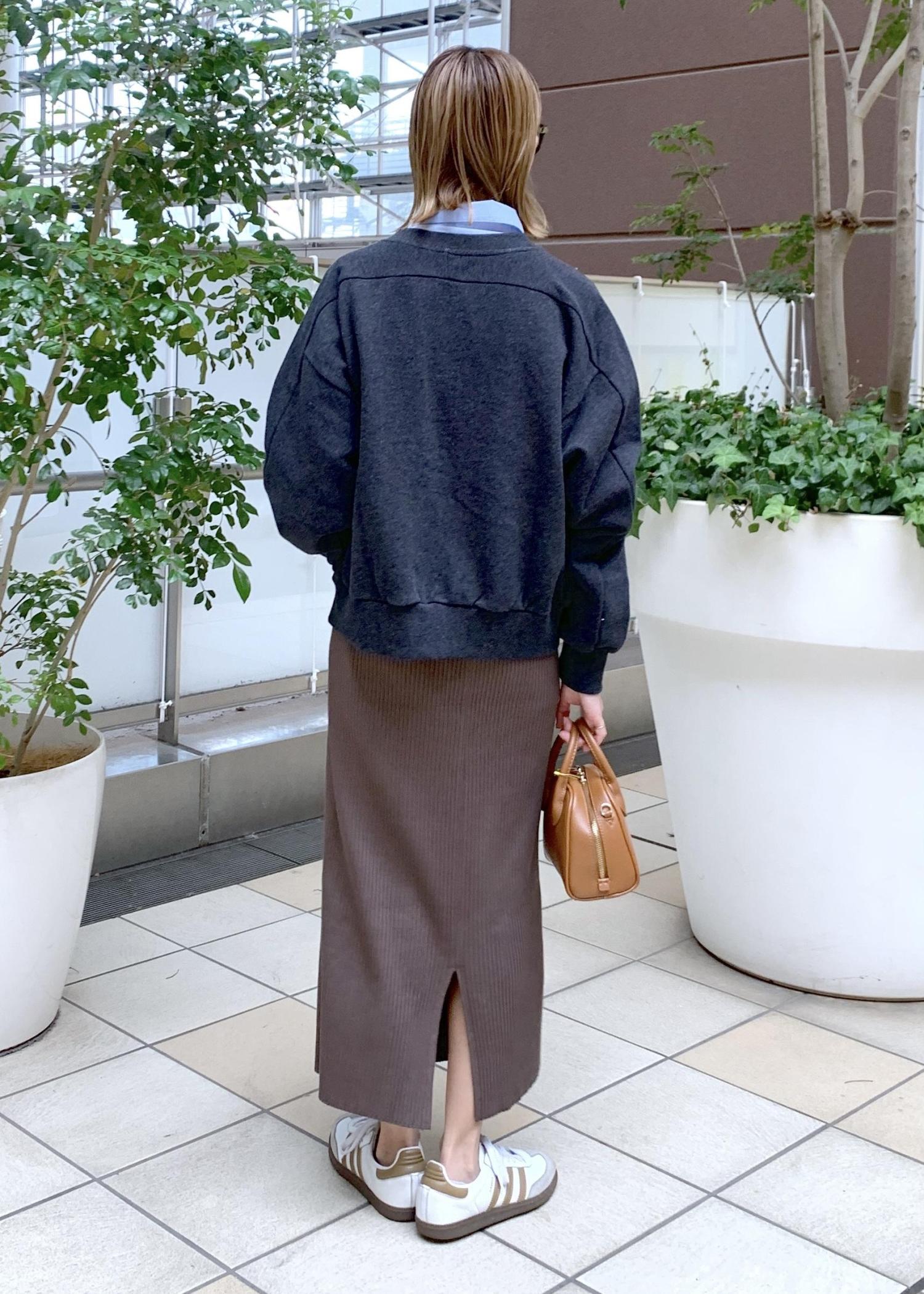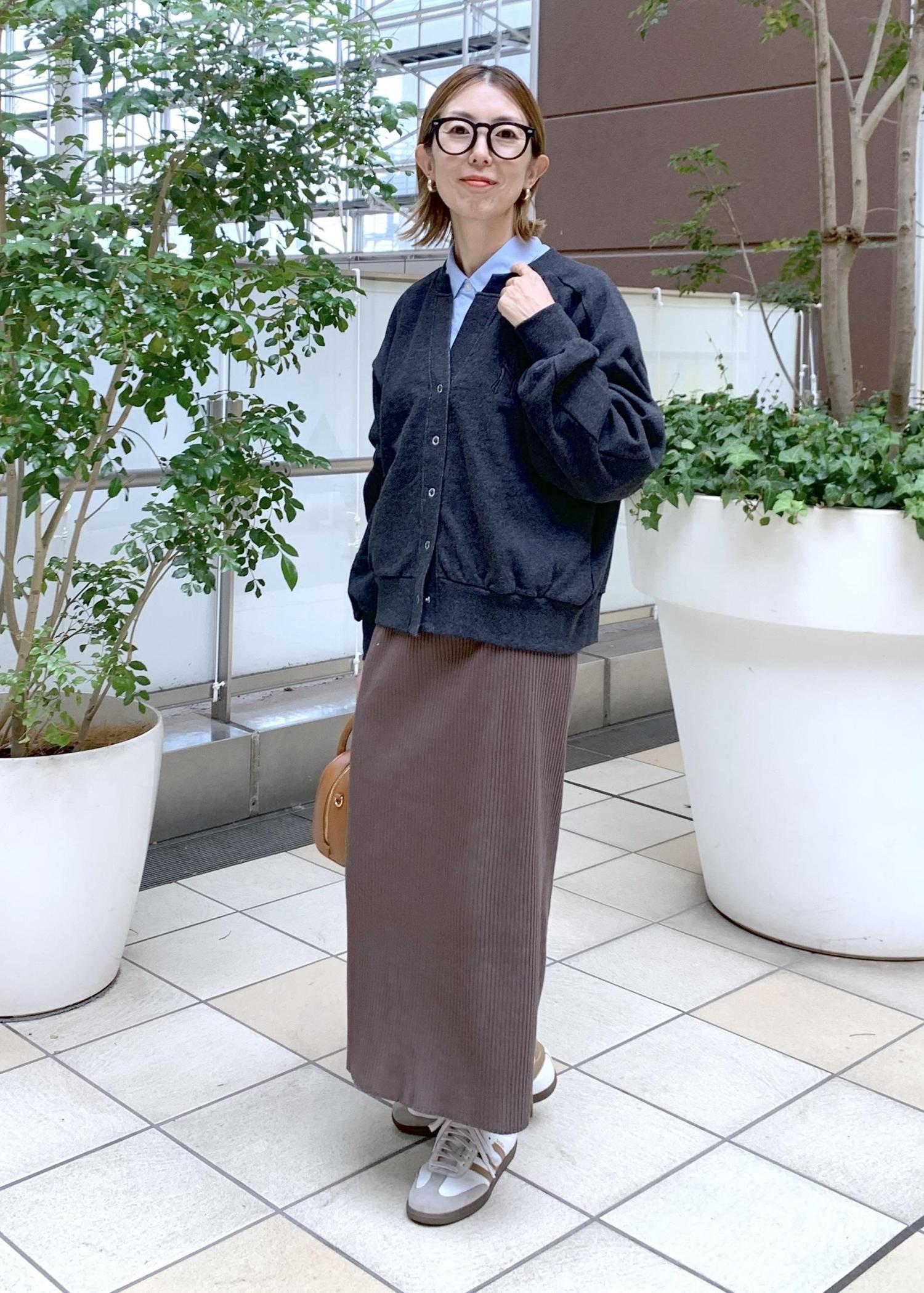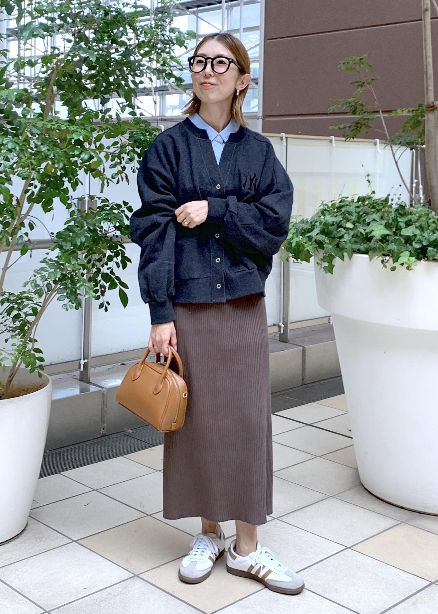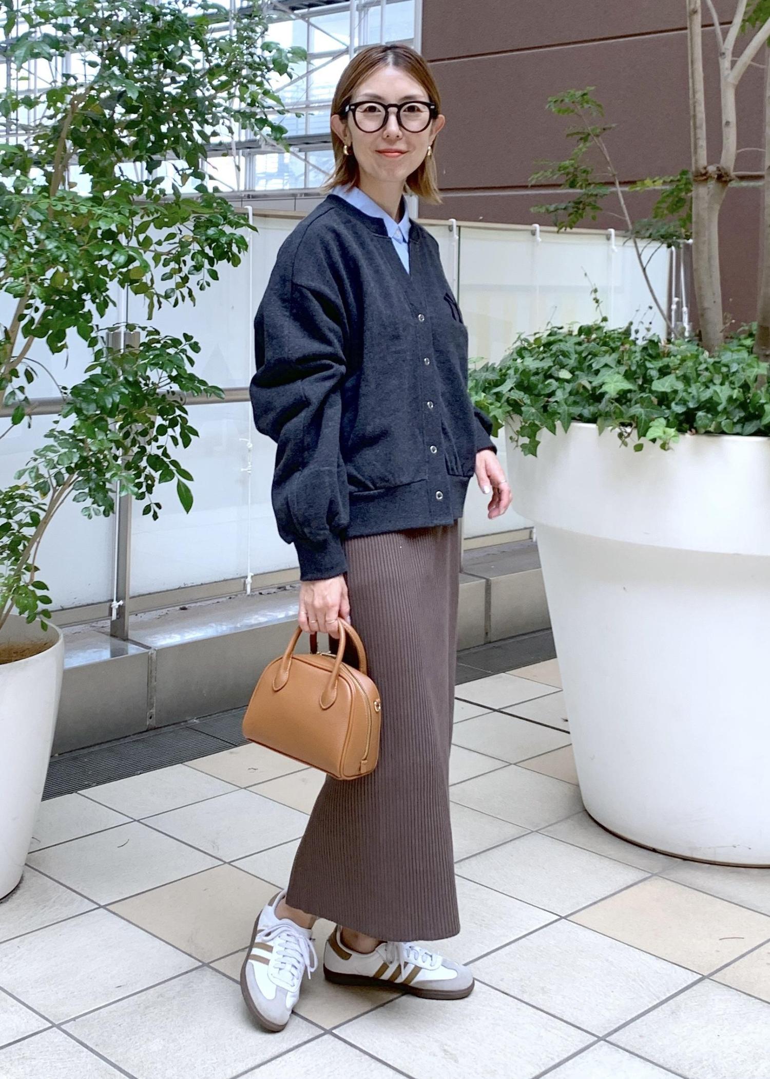 スウェットカーデのインナーにシャツをレイヤードして大人な印象に…