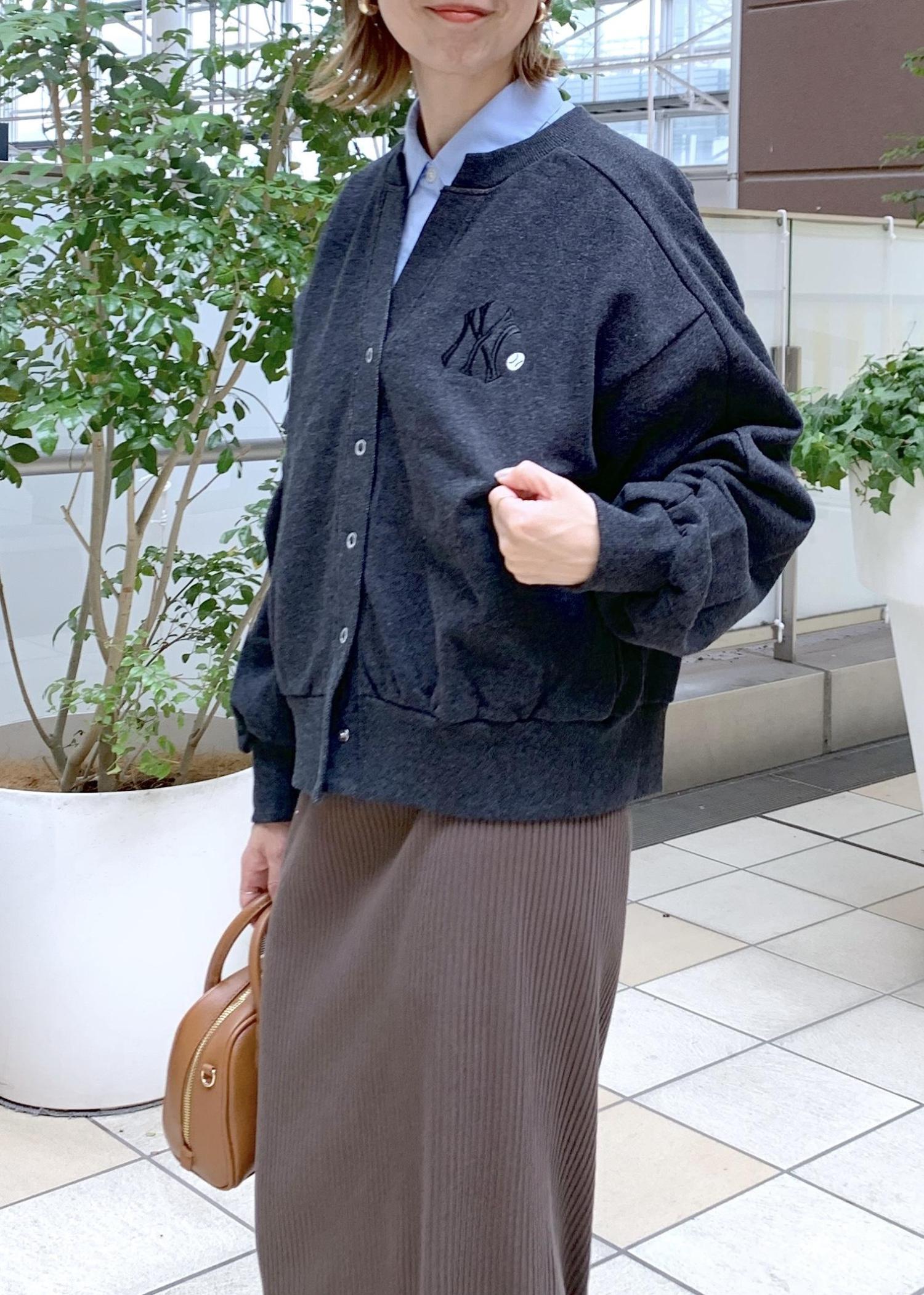 スタジャンの様な雰囲気だが、首元はキーネックで抜け感のあるカーディガン。