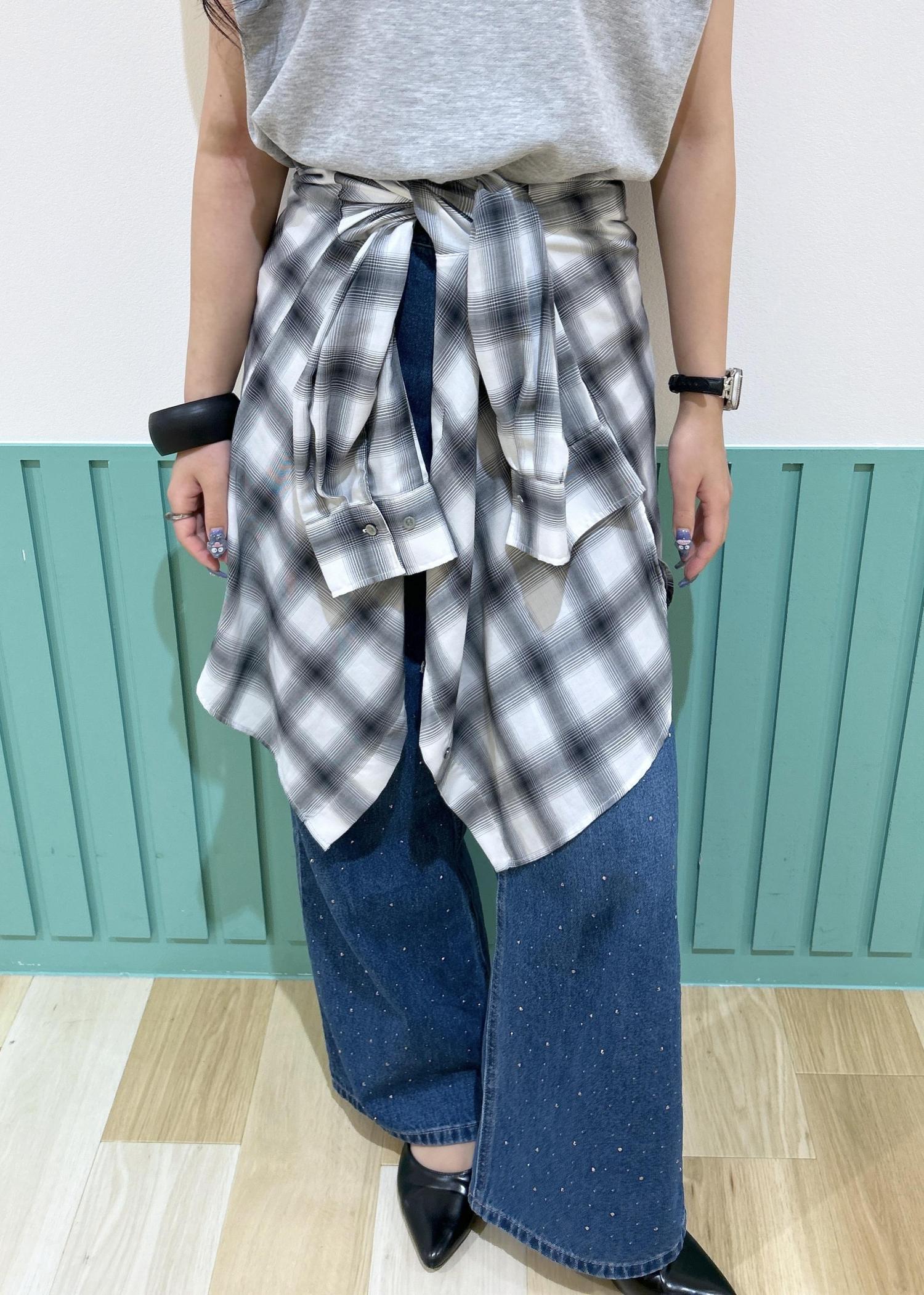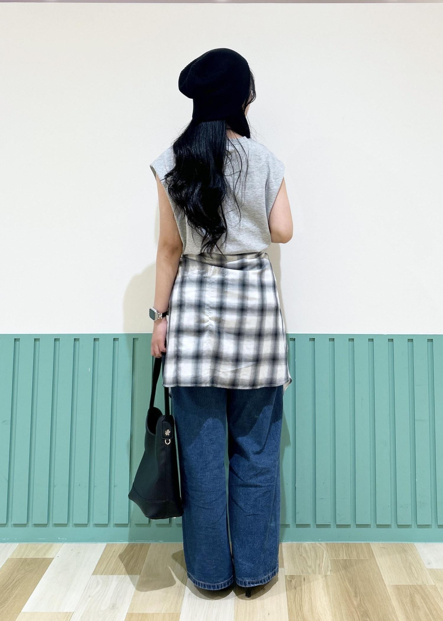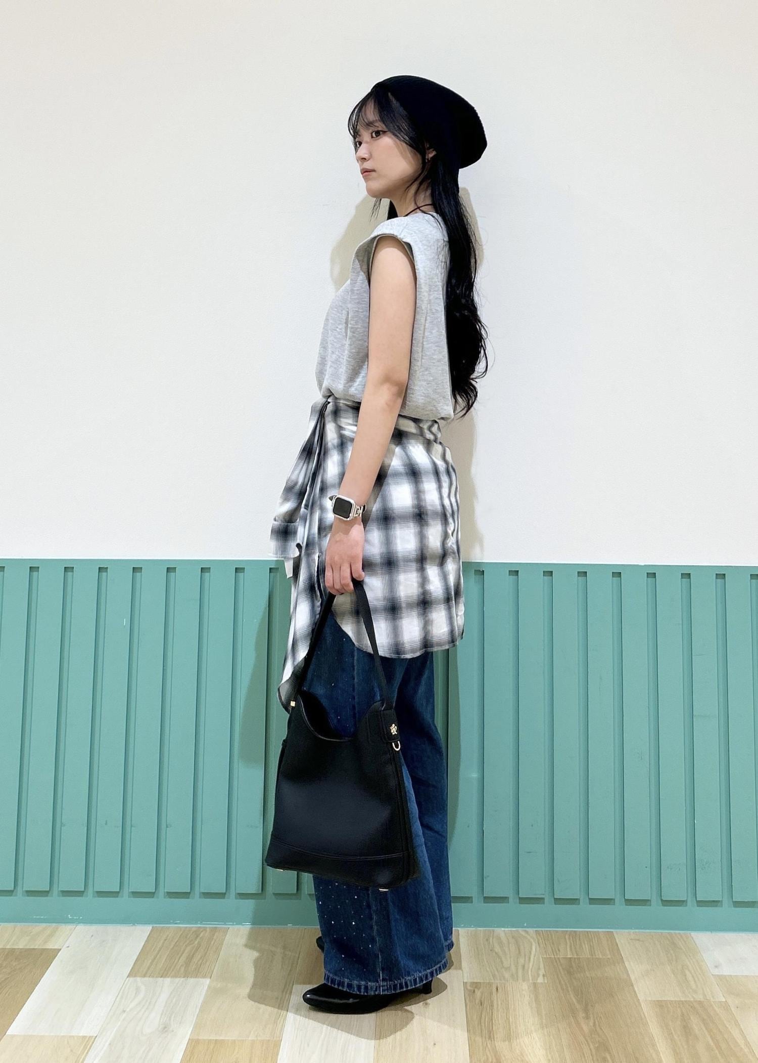 腰に巻いたチェックシャツでラフさとアクセントを加えてみました。