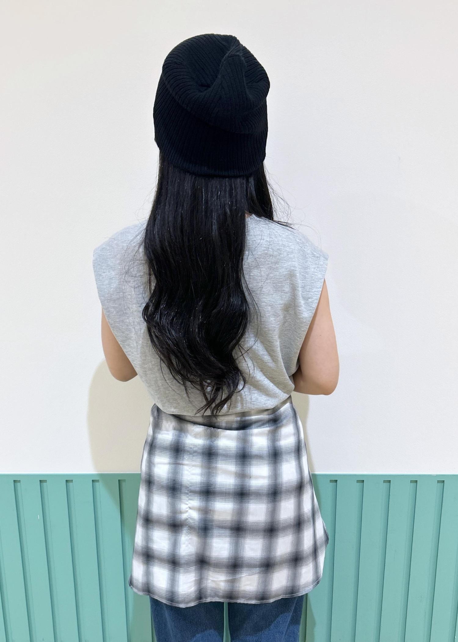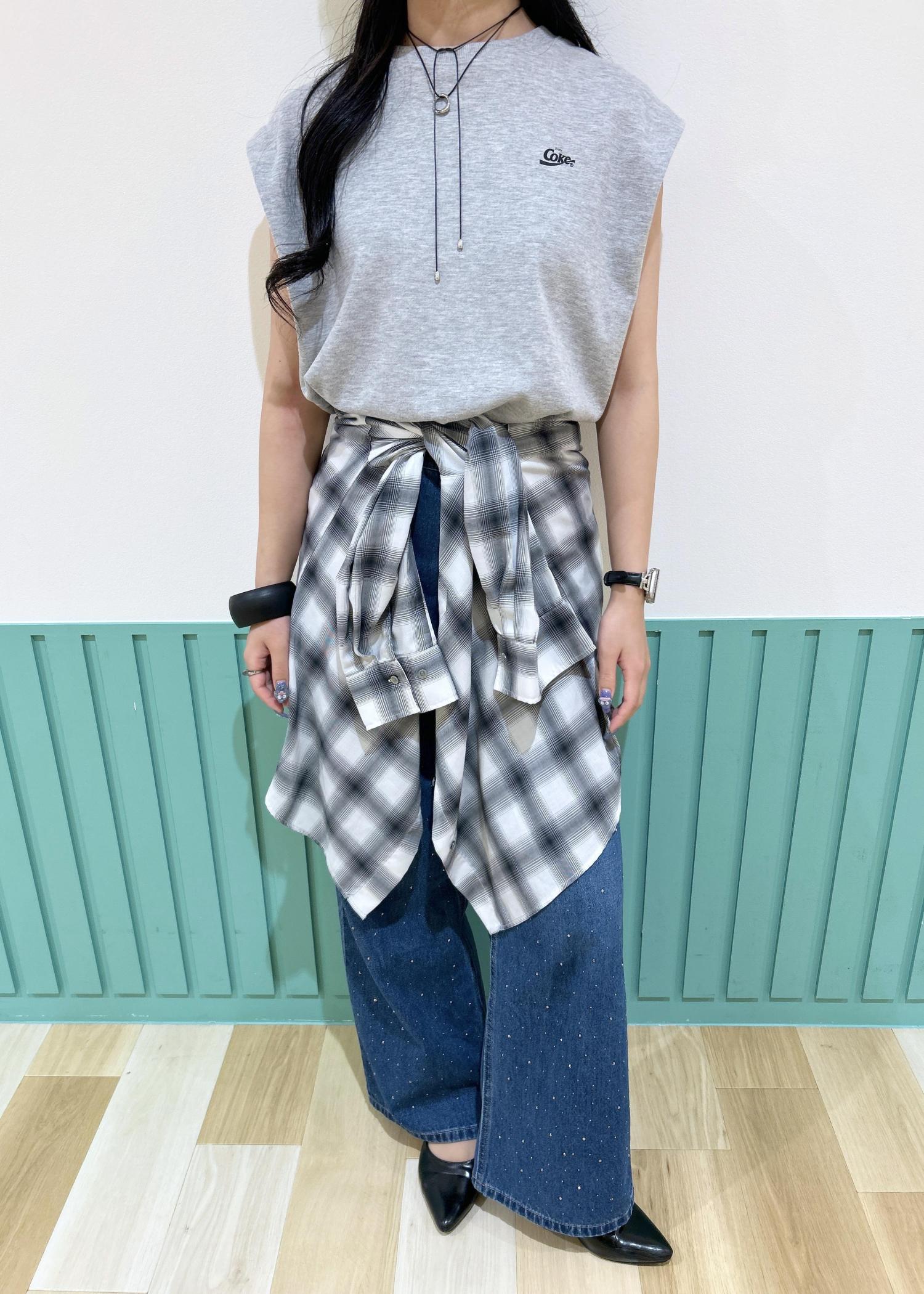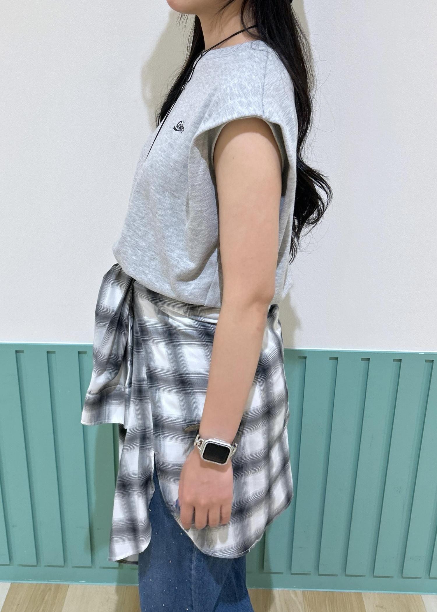 腰に巻いたチェックシャツでラフさとアクセントを加えてみました。