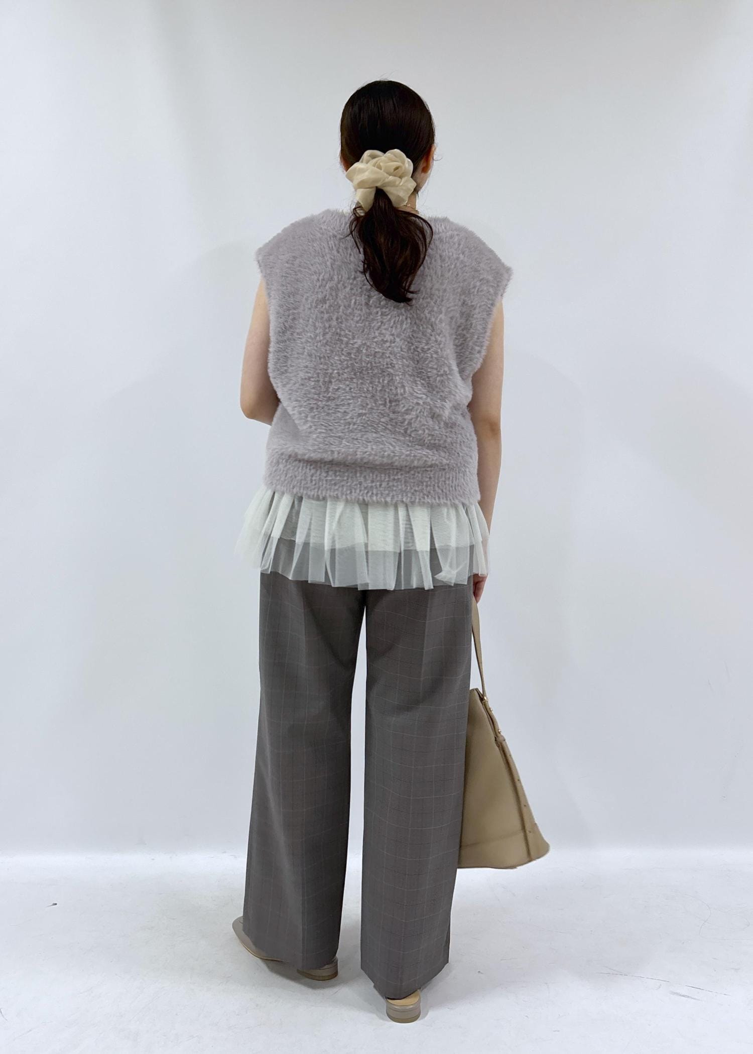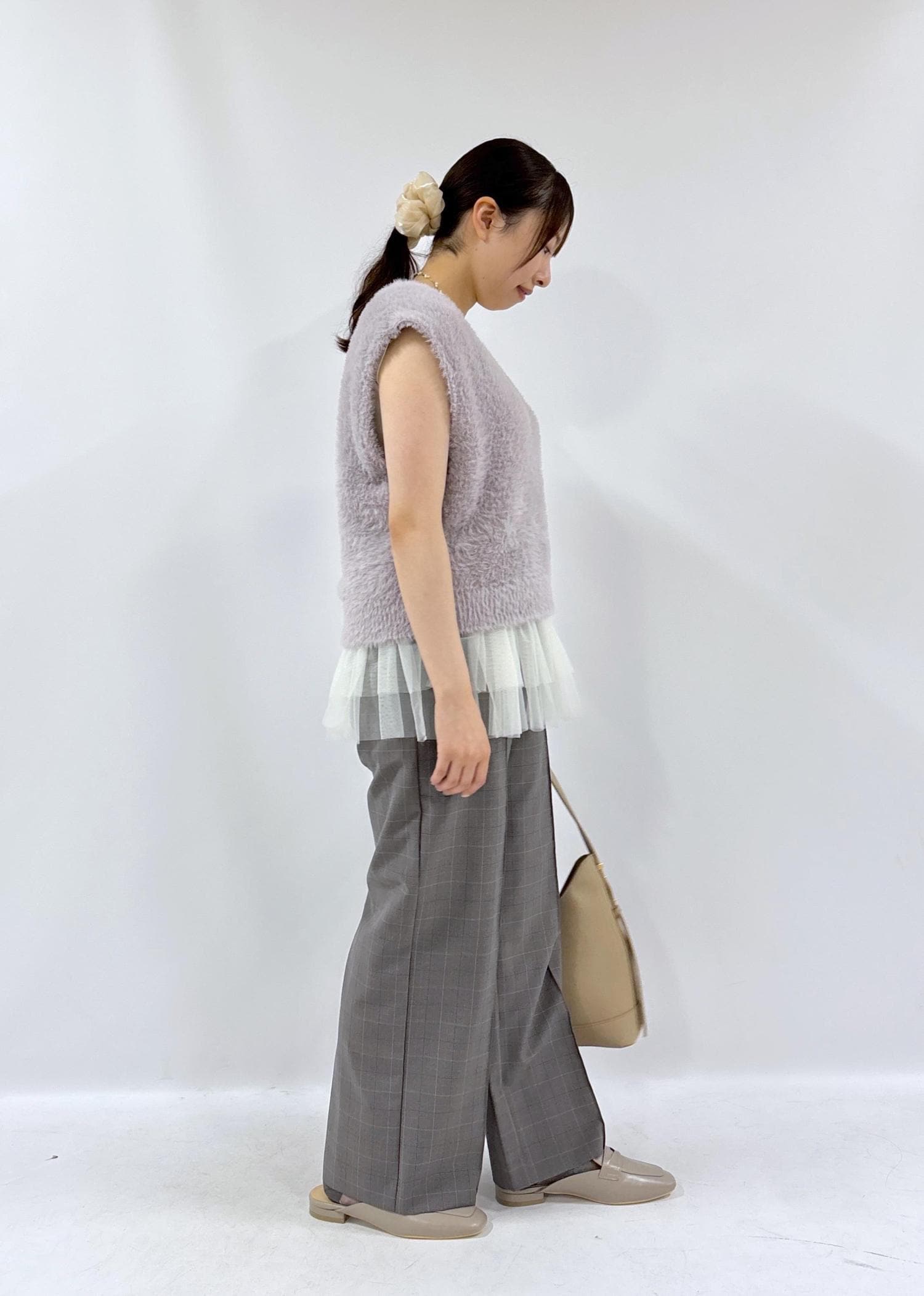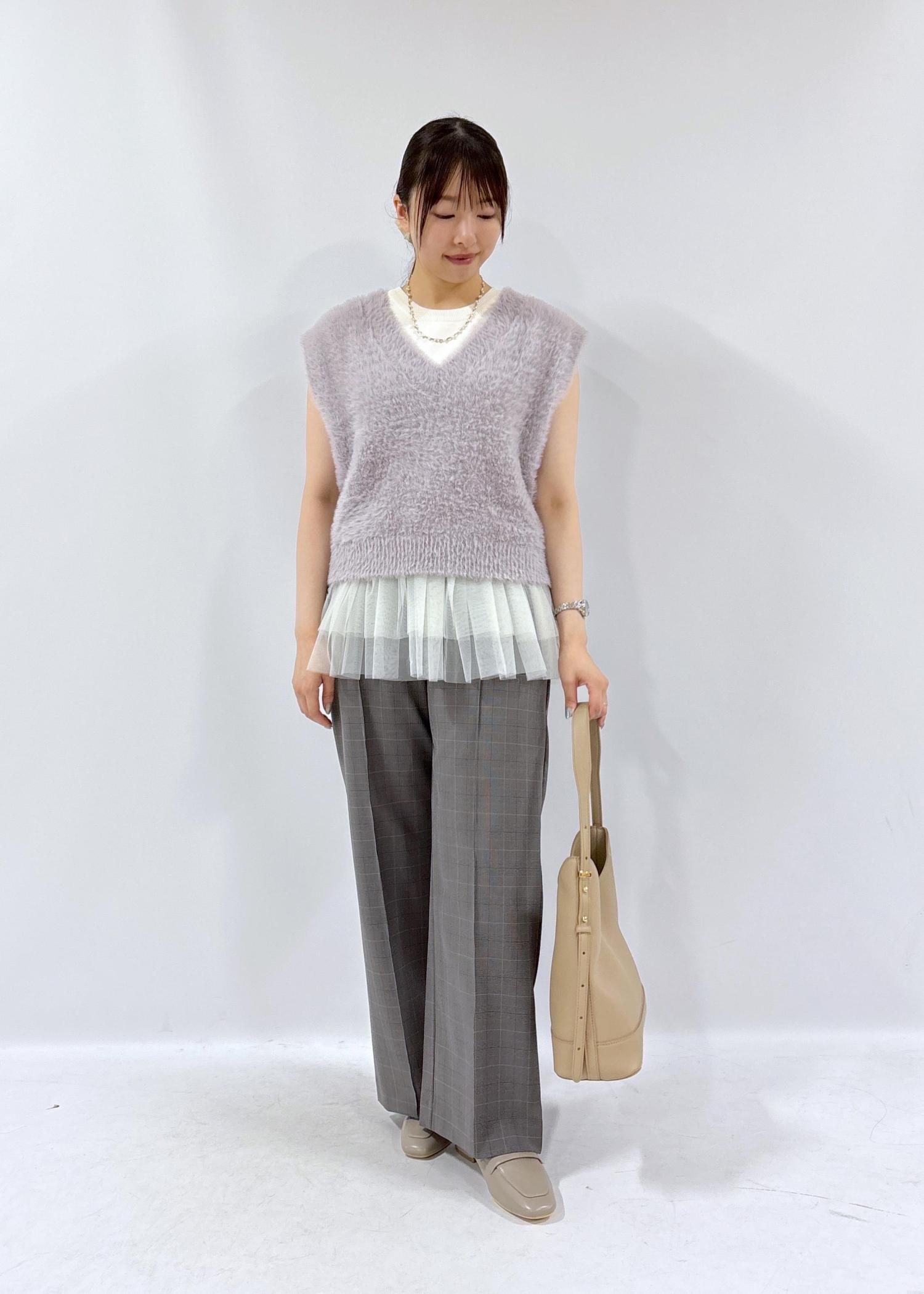 触り心地抜群のフェザーニットベストを合わせたコーデです。甘くなり過ぎないようにパンツを合わせ、小物は落ち着いたカラーを取り入れました。