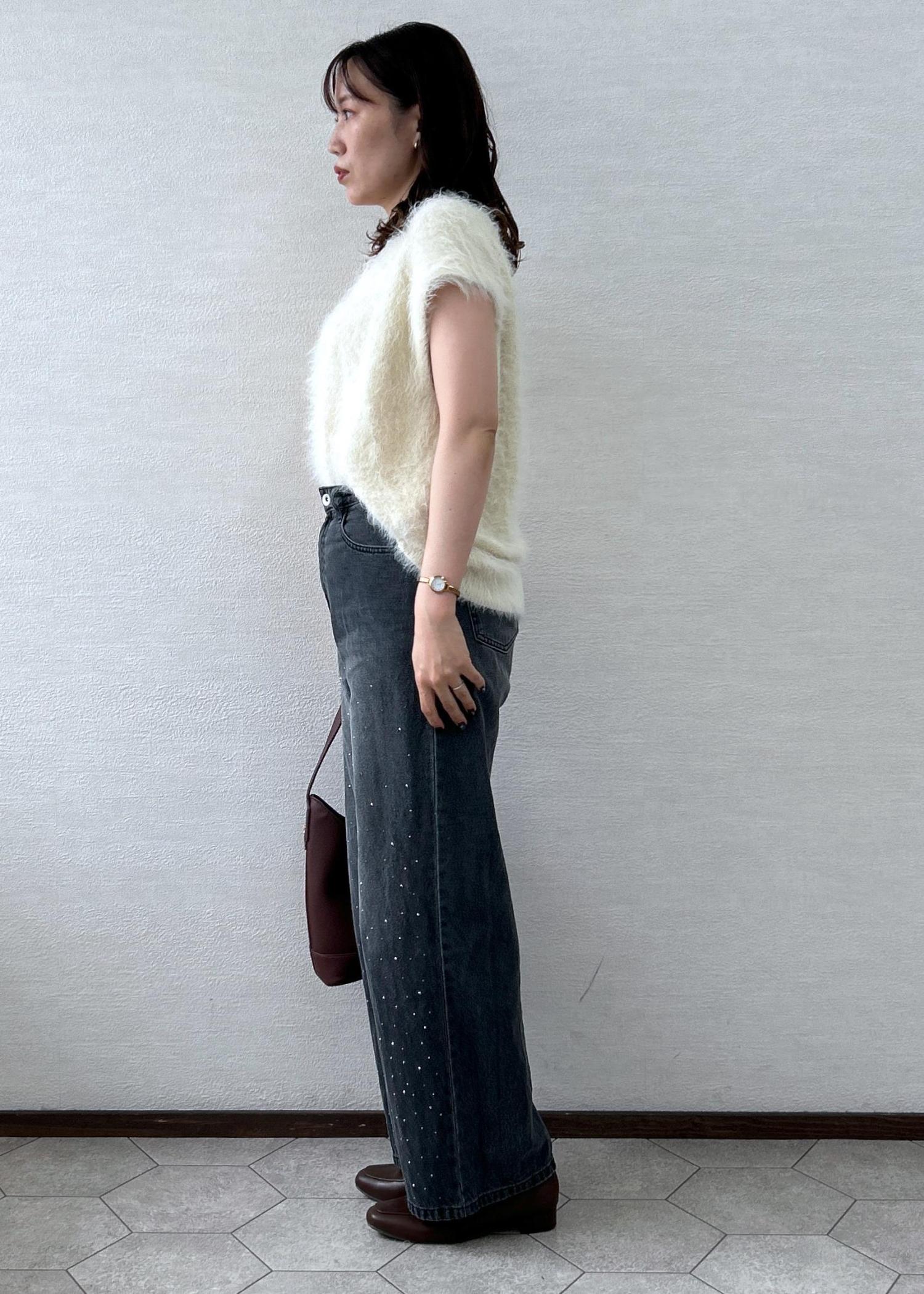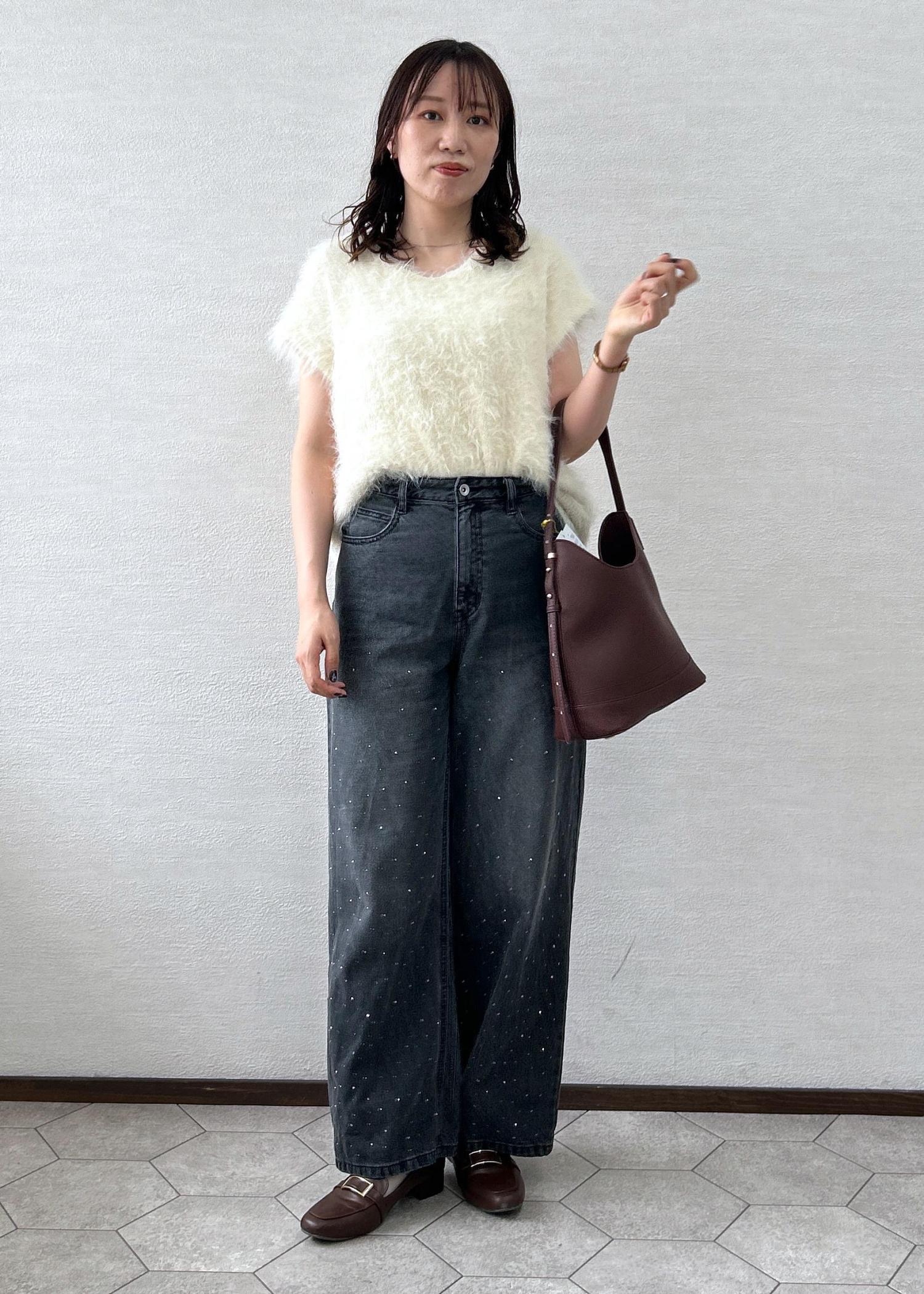 フェミニン要素のあるシャギーニットにブラックデニムを合わせてバランス調節しました。