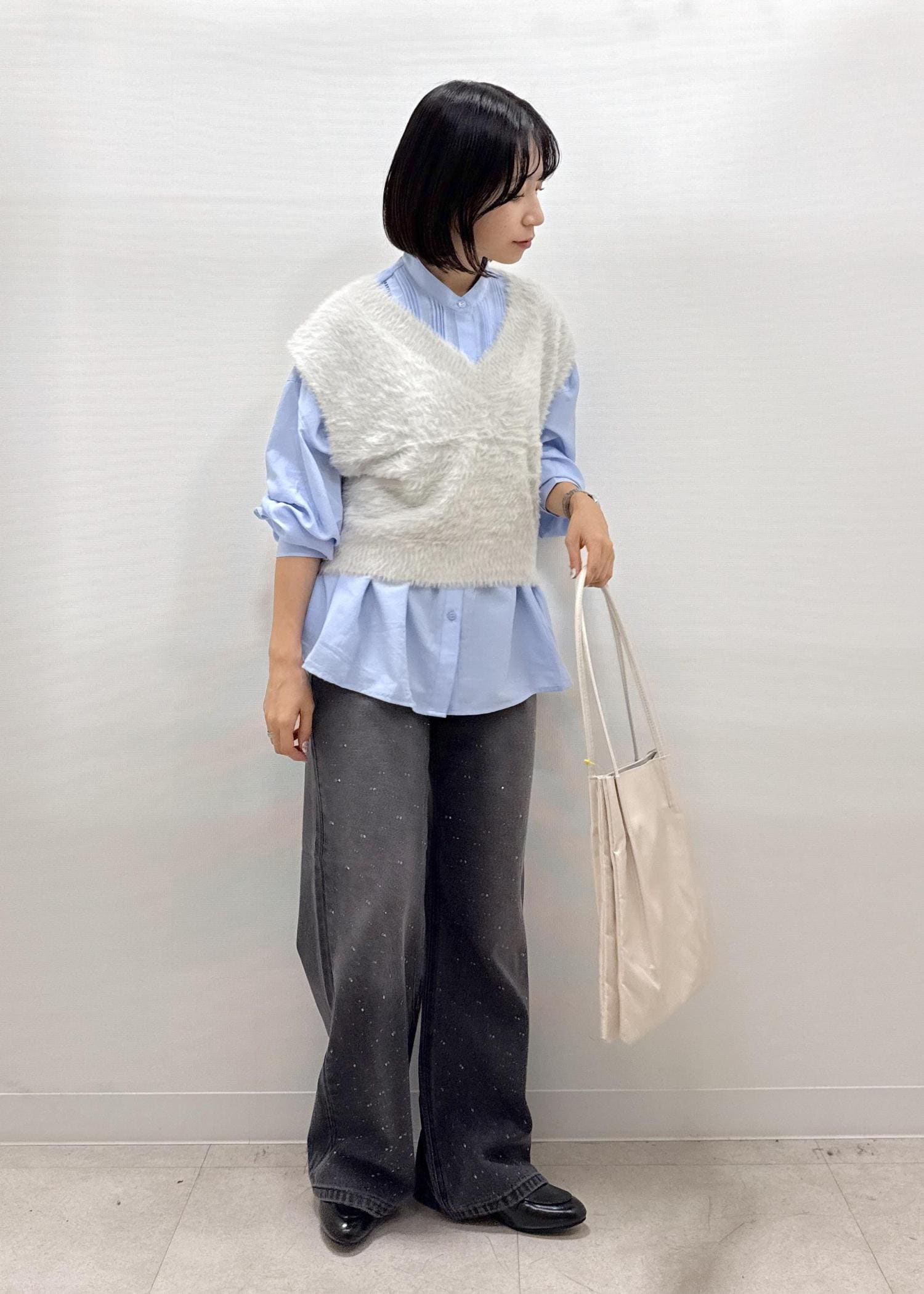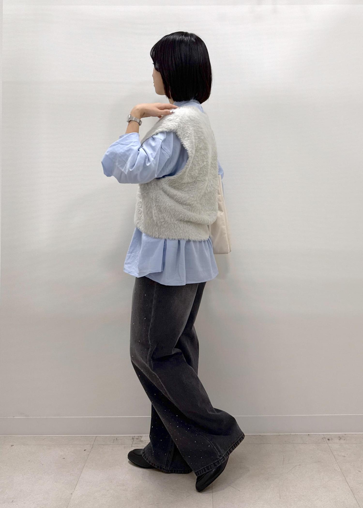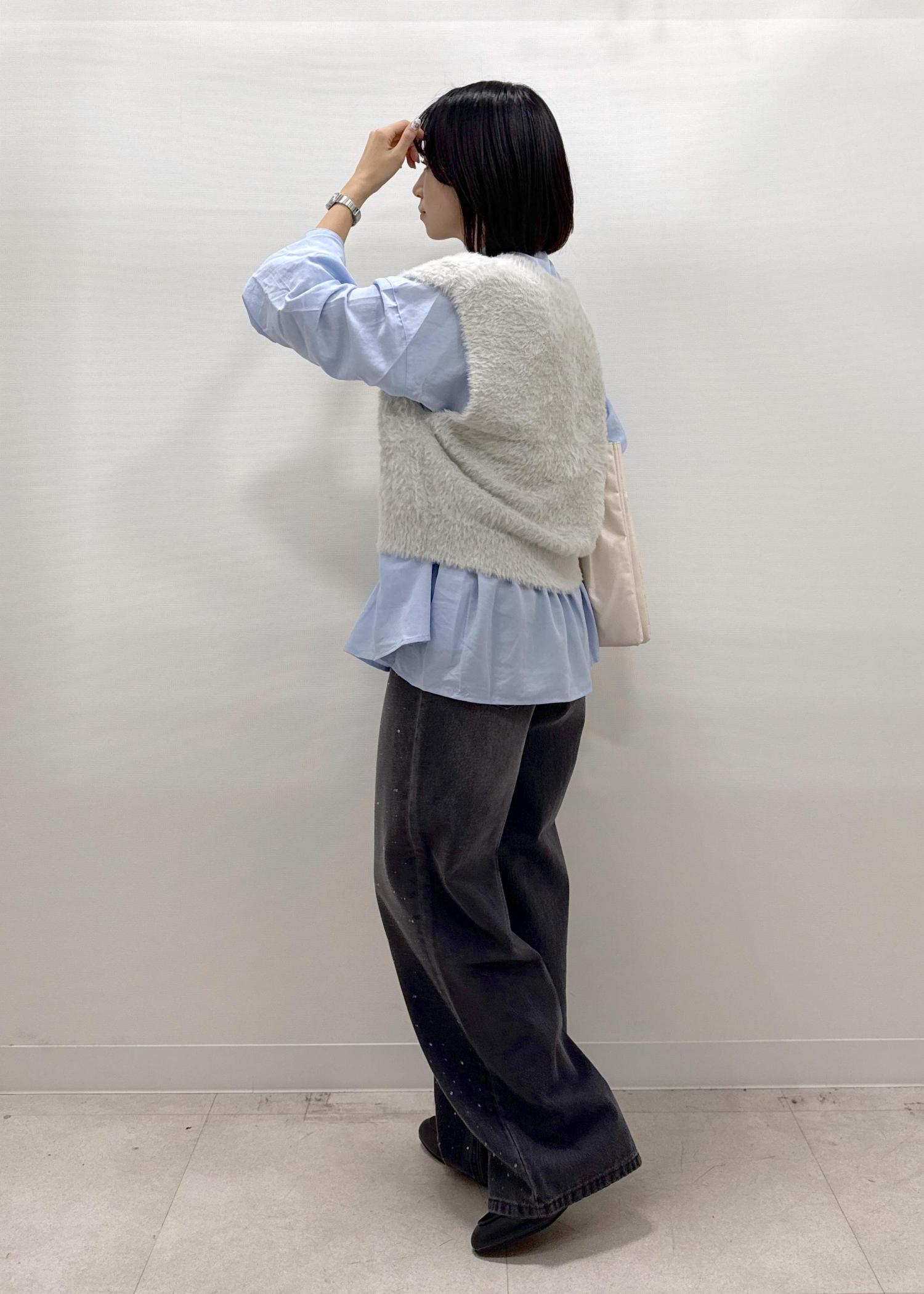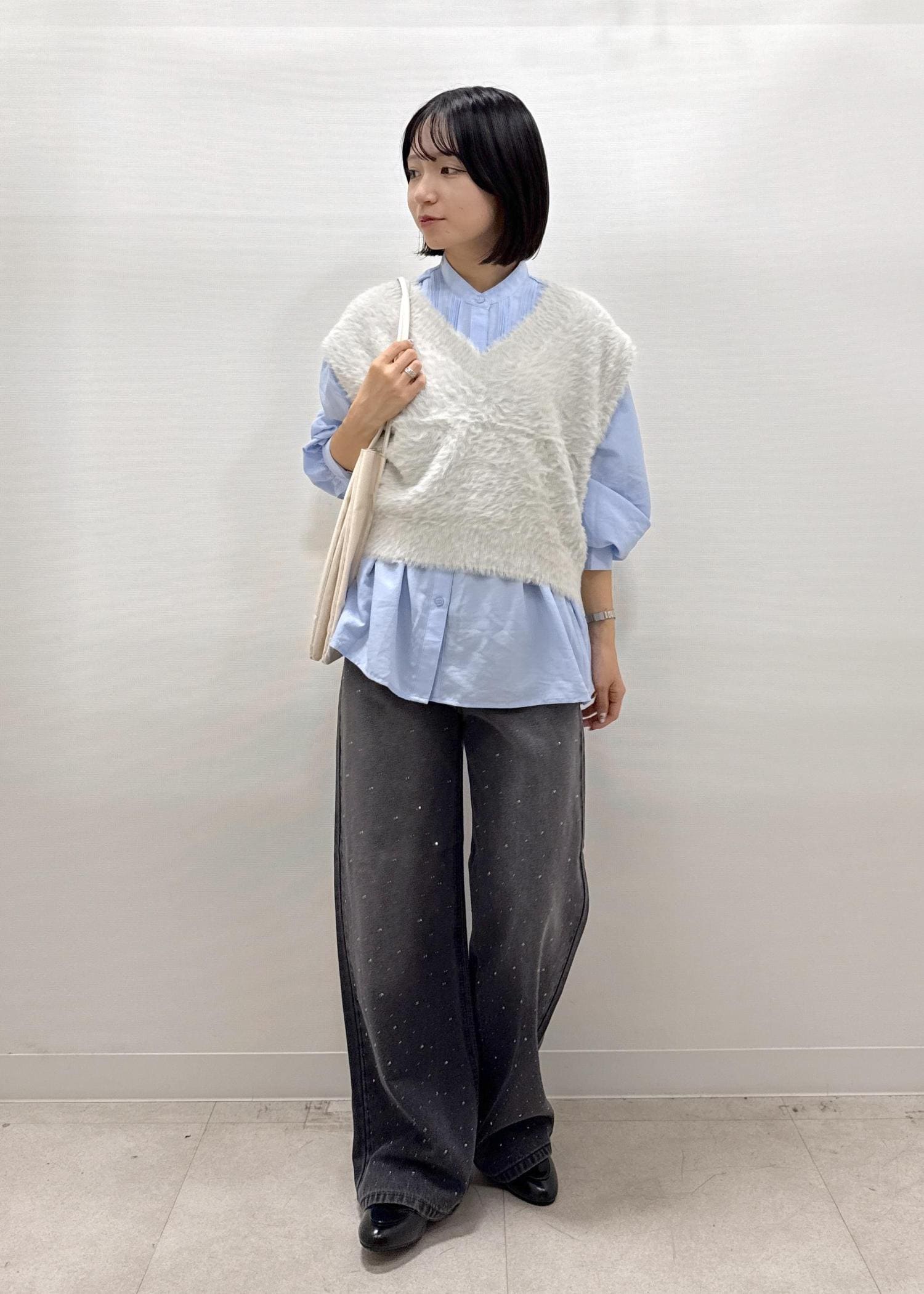 ペプラムシャツにフェザーのベストをレイヤードしたコーデ☺︎