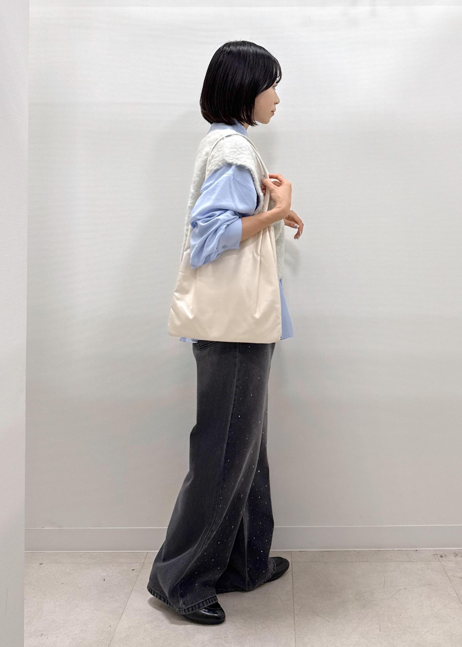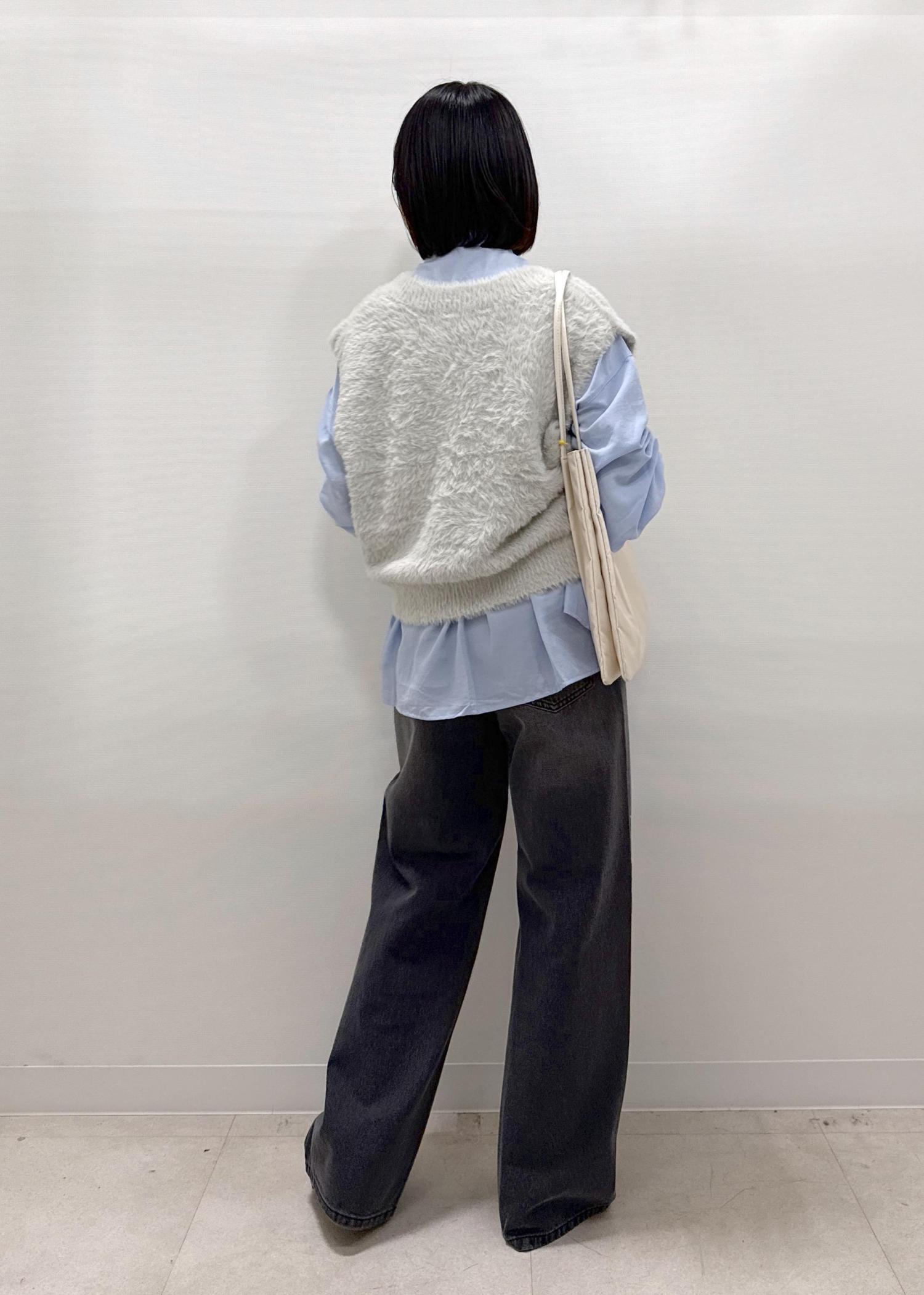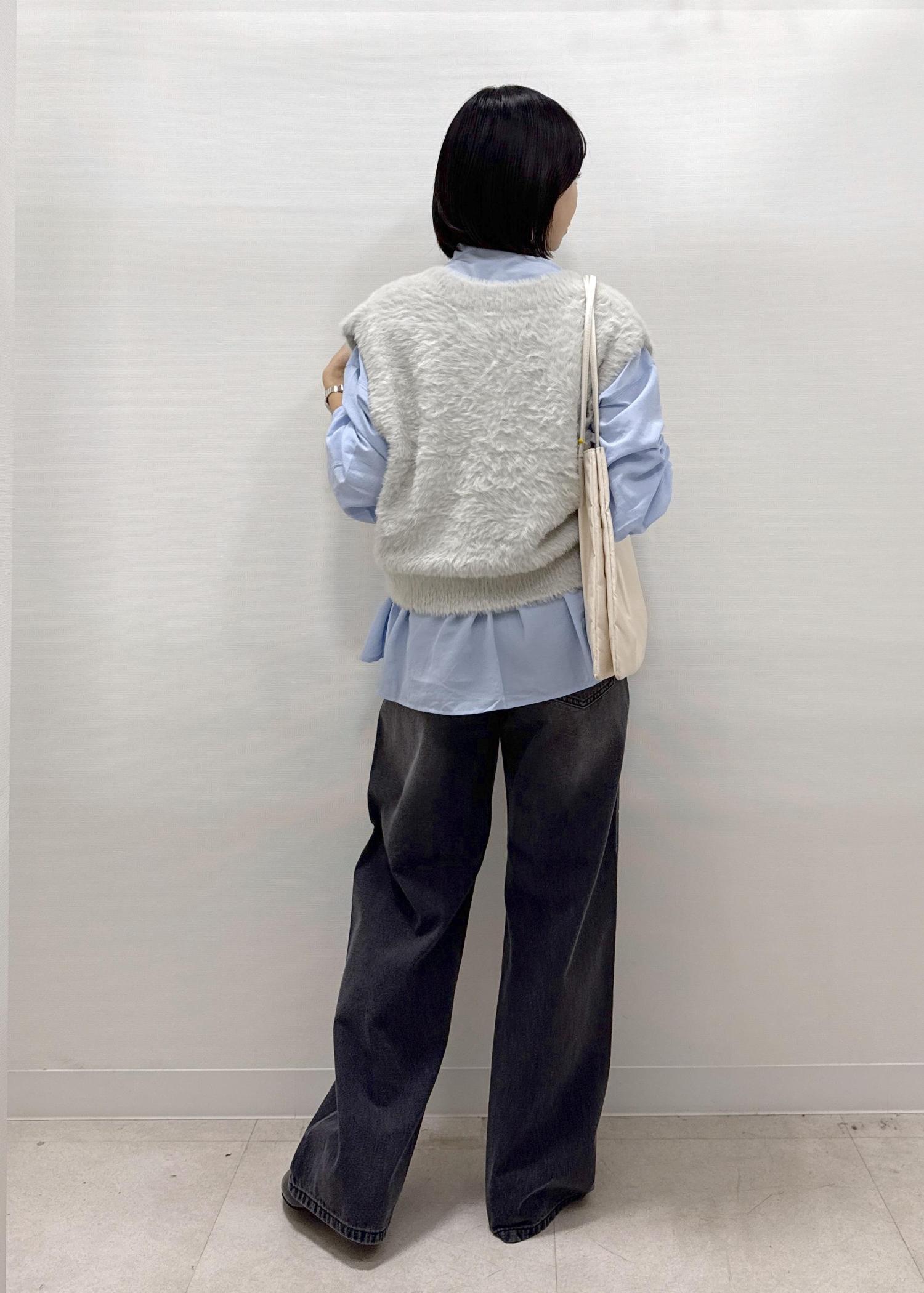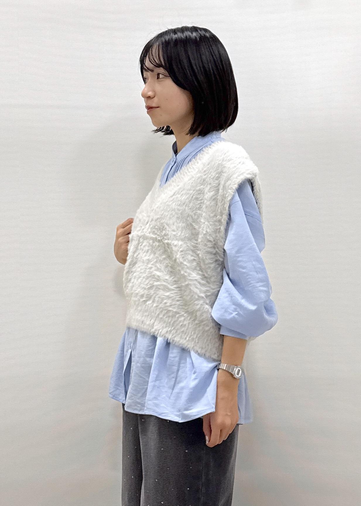 ペプラムシャツにフェザーのベストをレイヤードしたコーデ☺︎