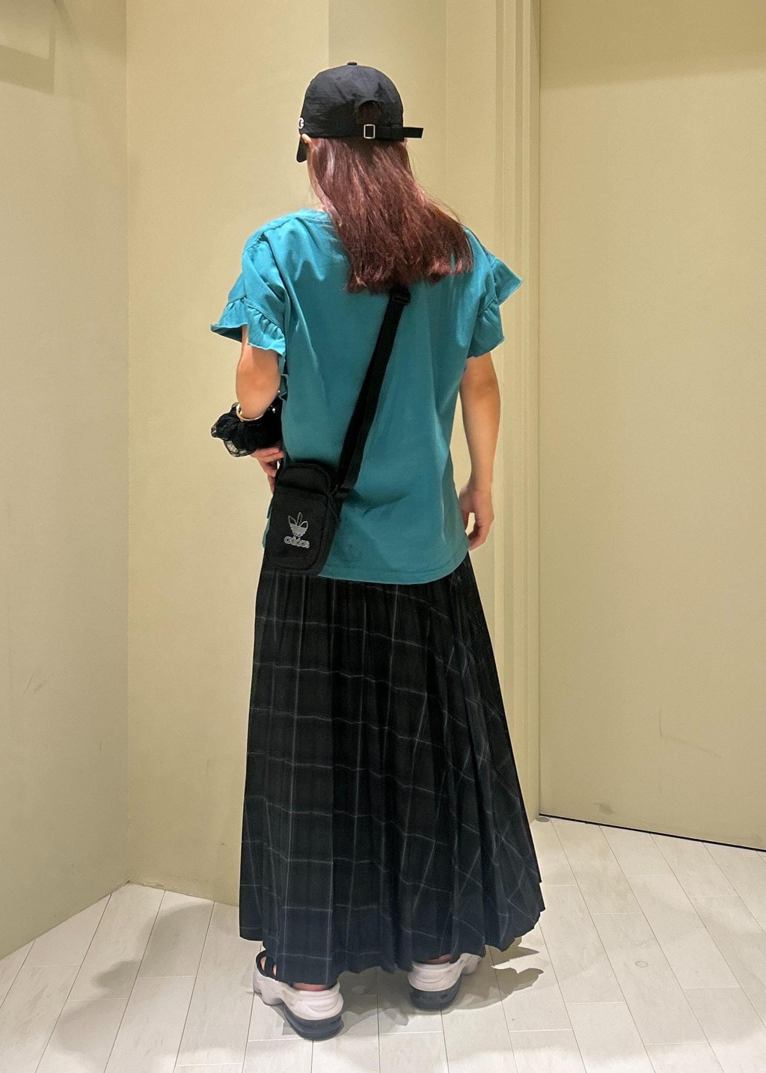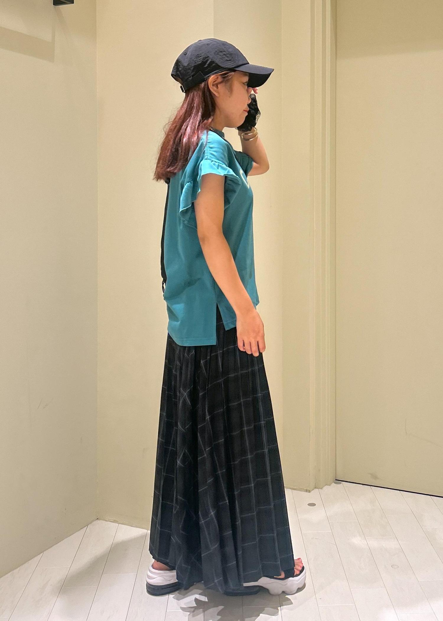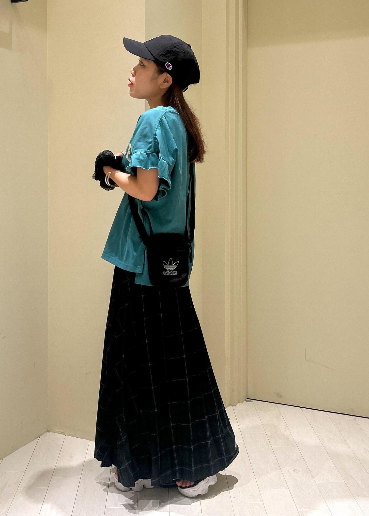 グリーンのTシャツにチェックスカートを合わせた秋先取りコーデです。