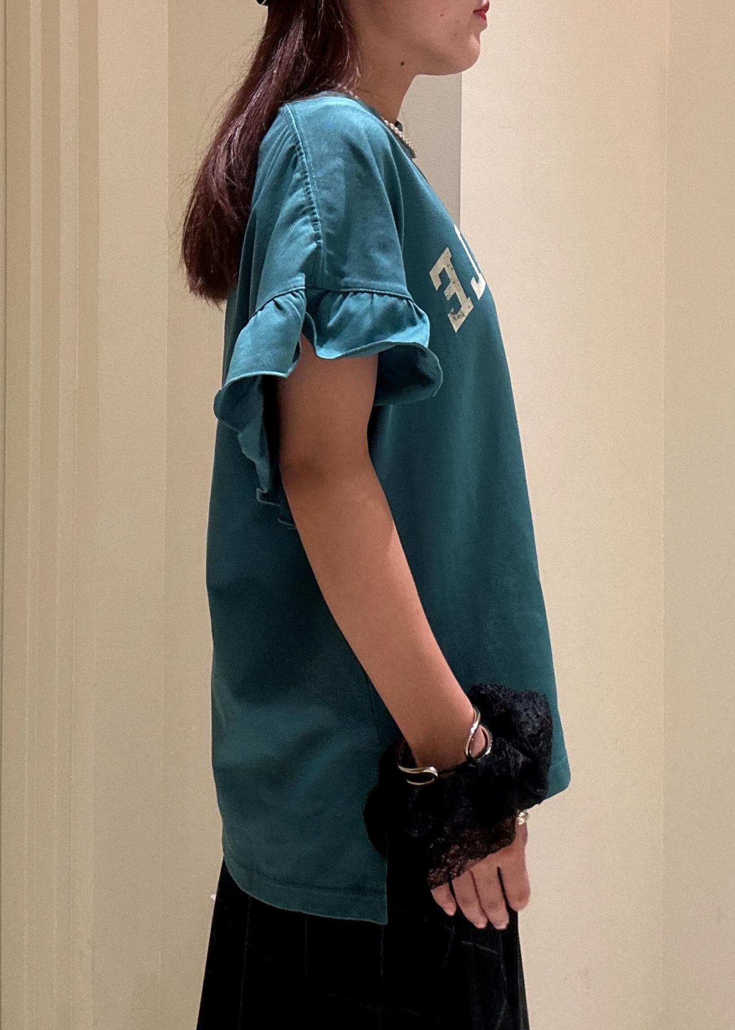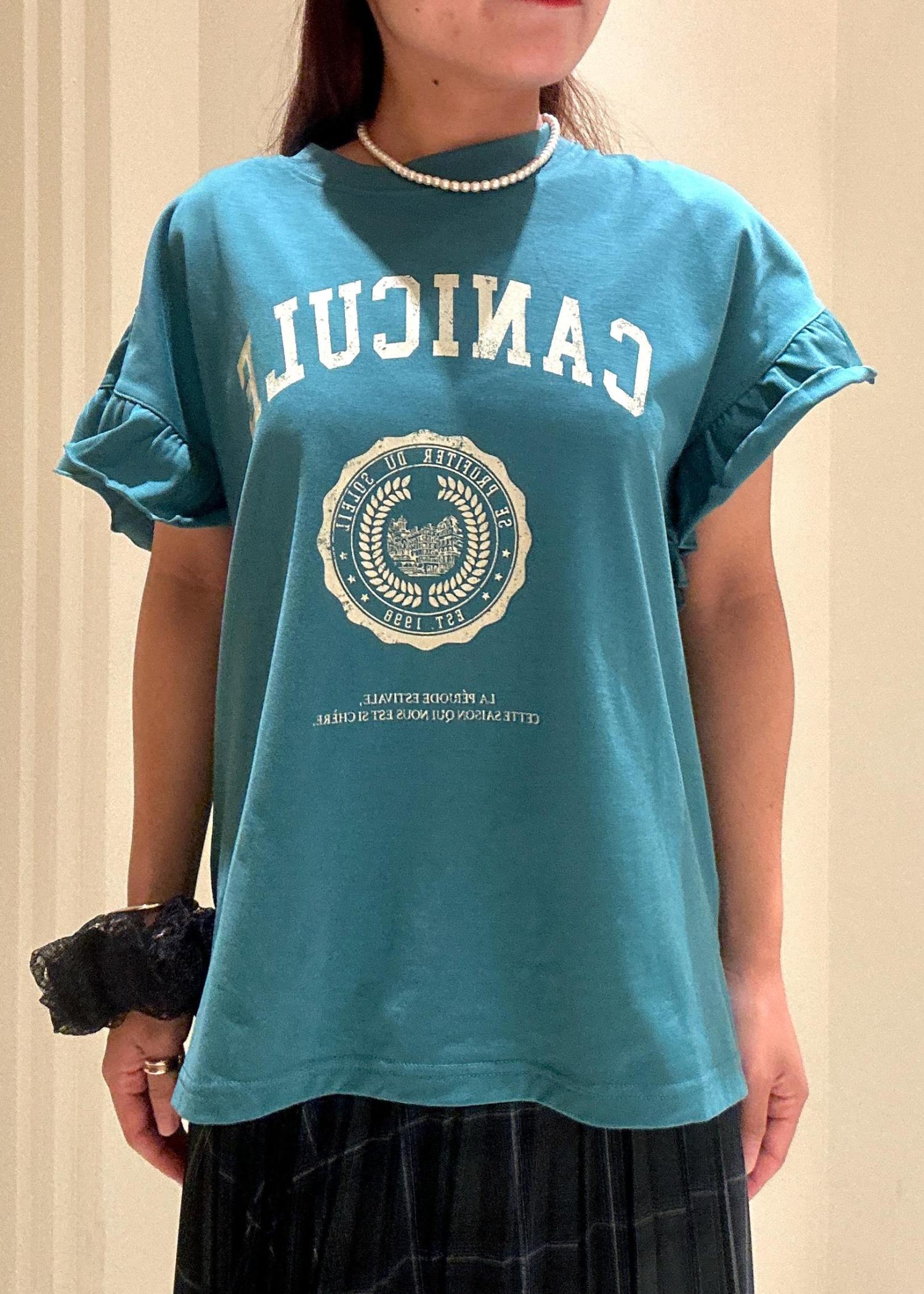 袖フリルカレッジロゴTシャツ