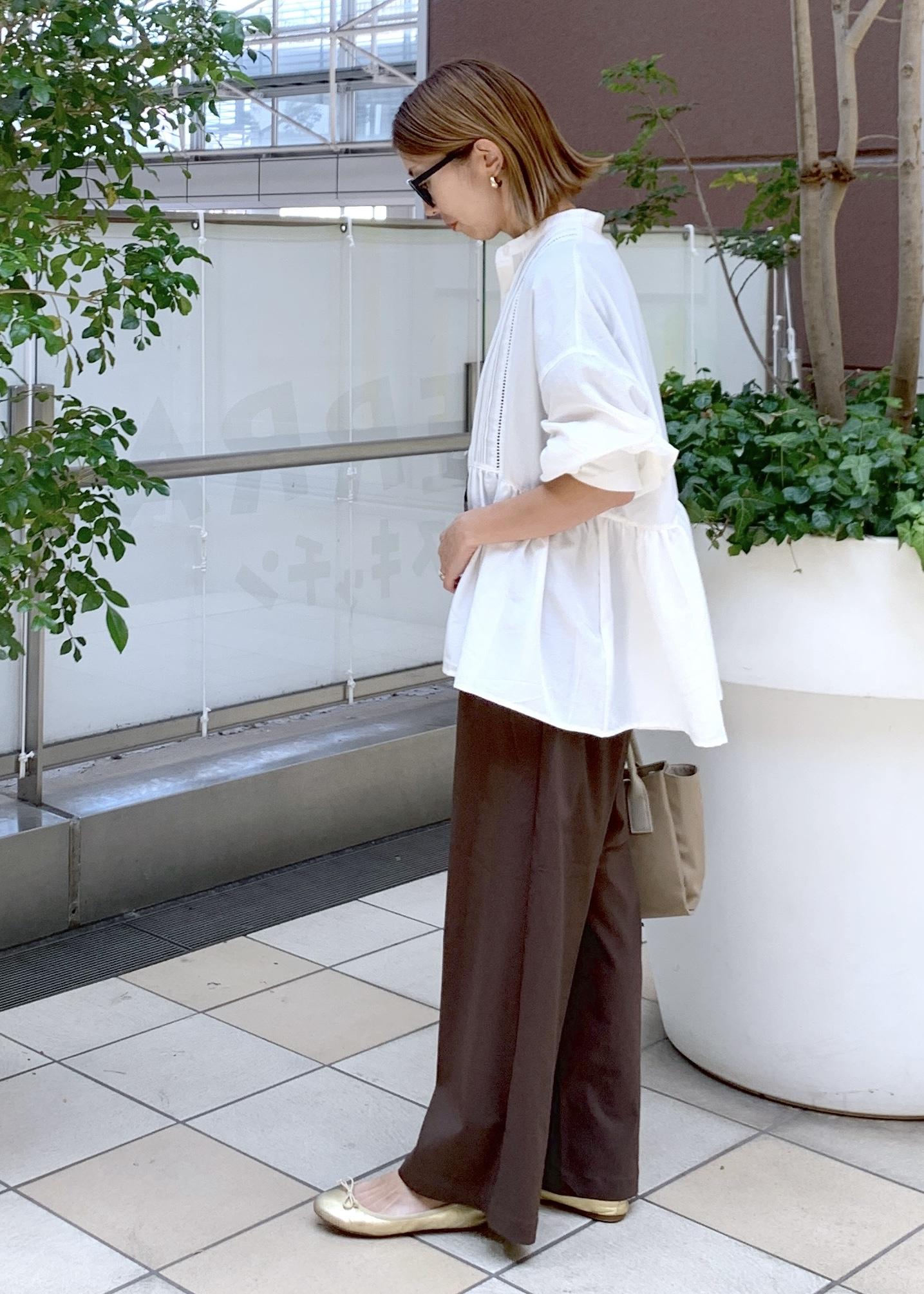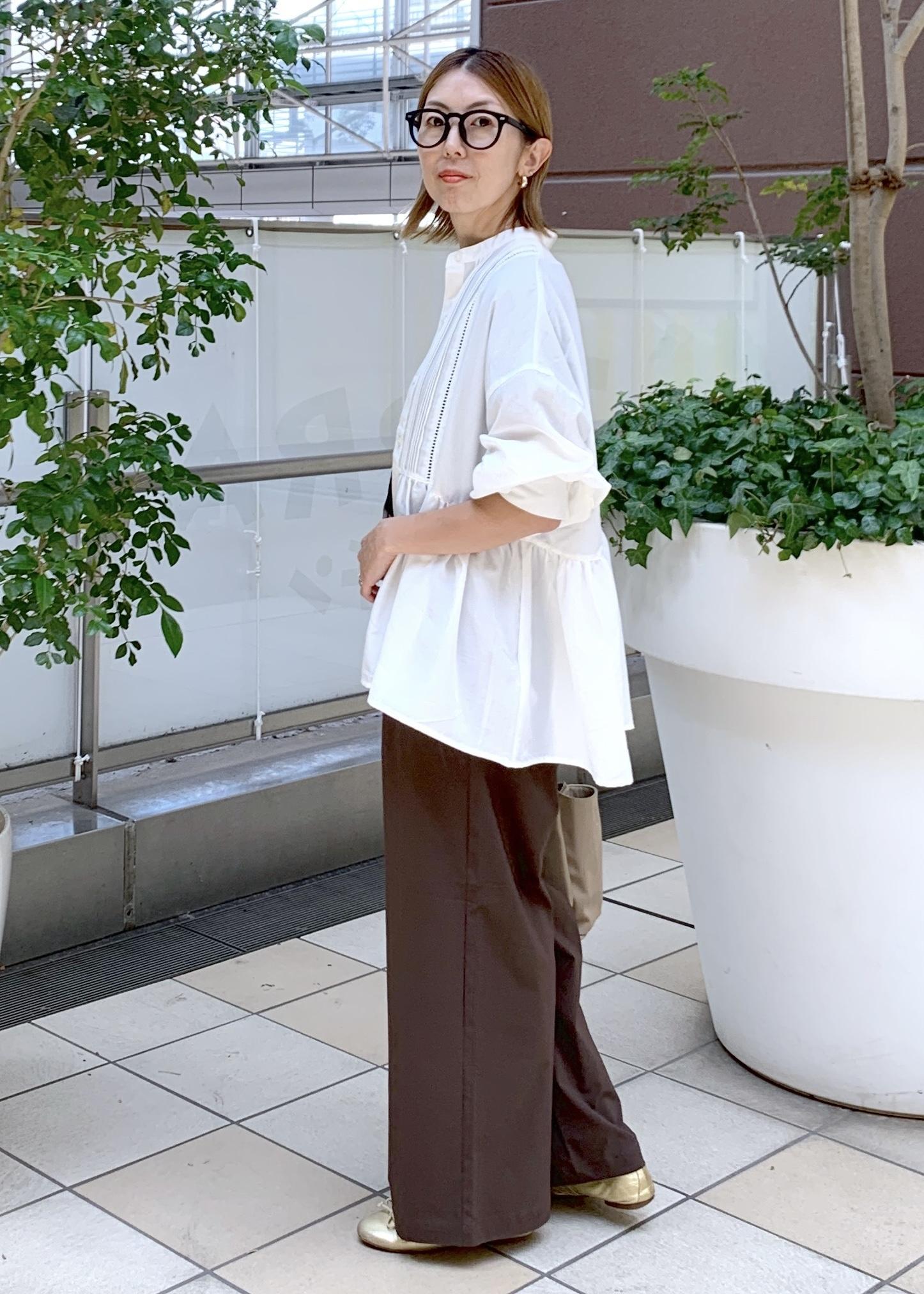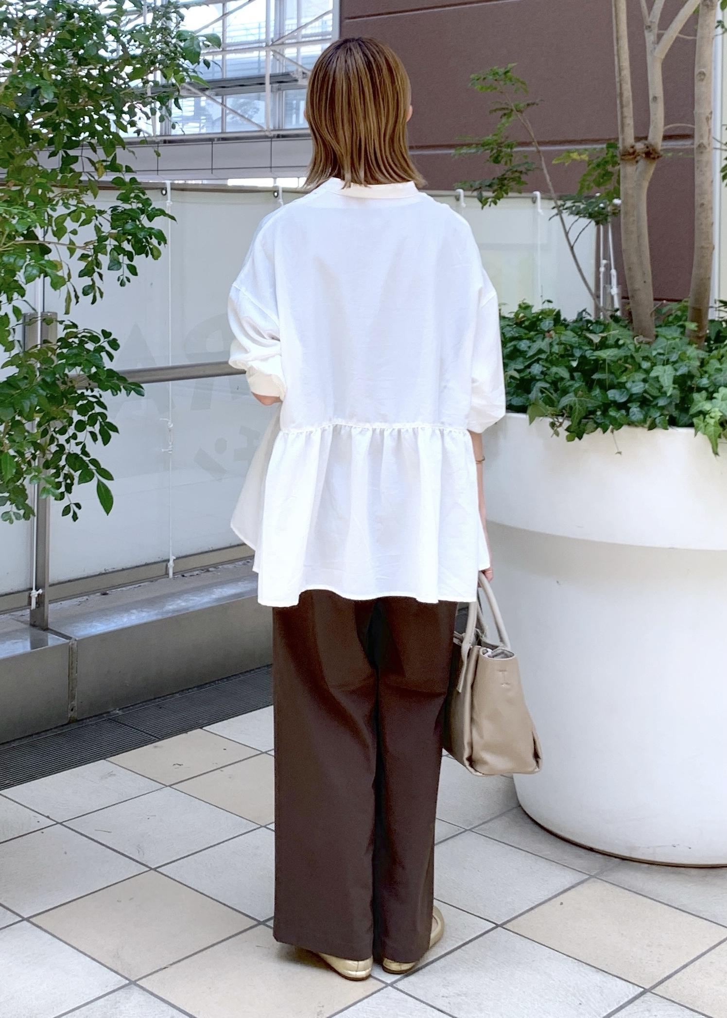 春も人気だったペプラムシャツの秋素材、秋カラーを使ったシンプルな大人スタイリング