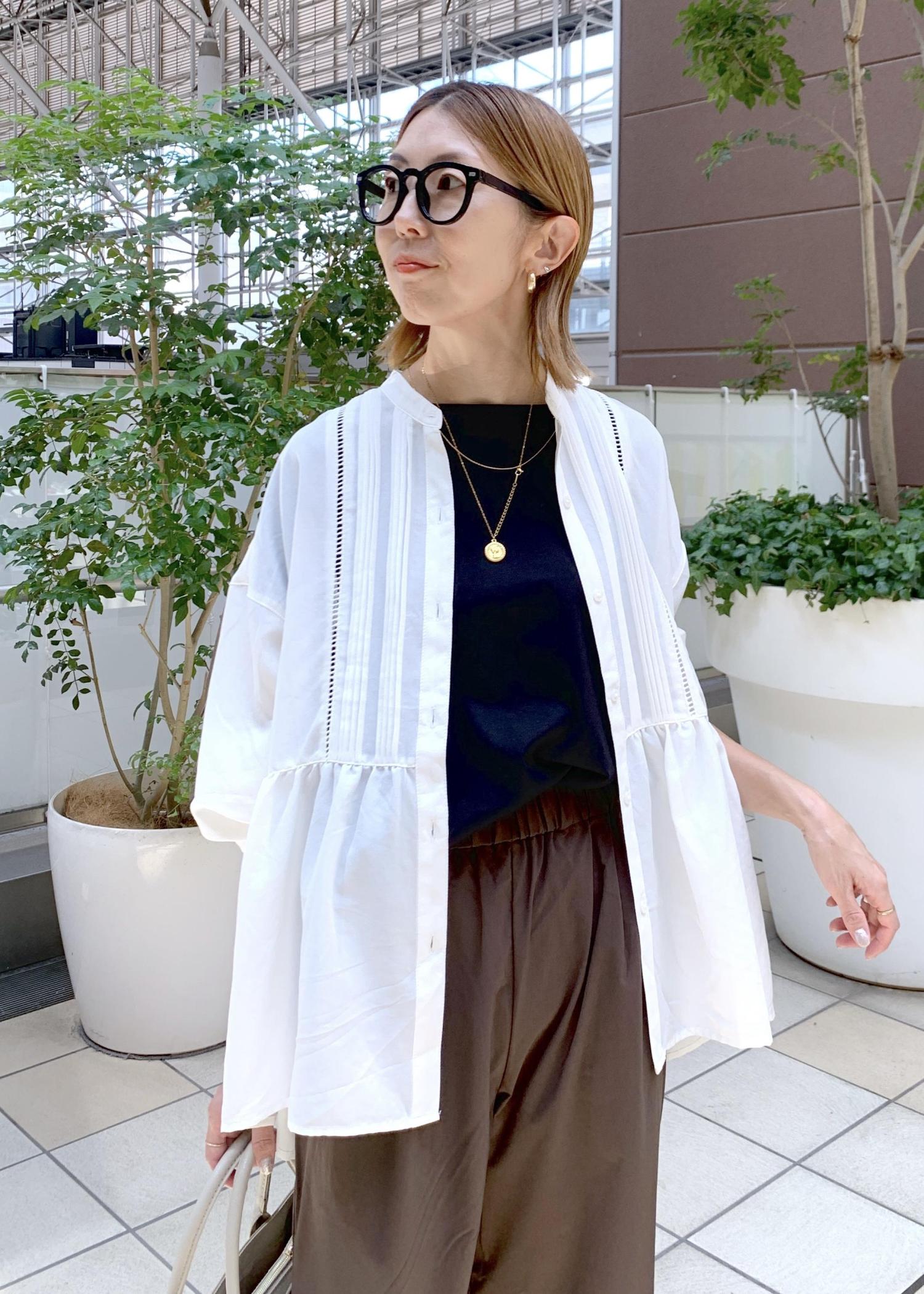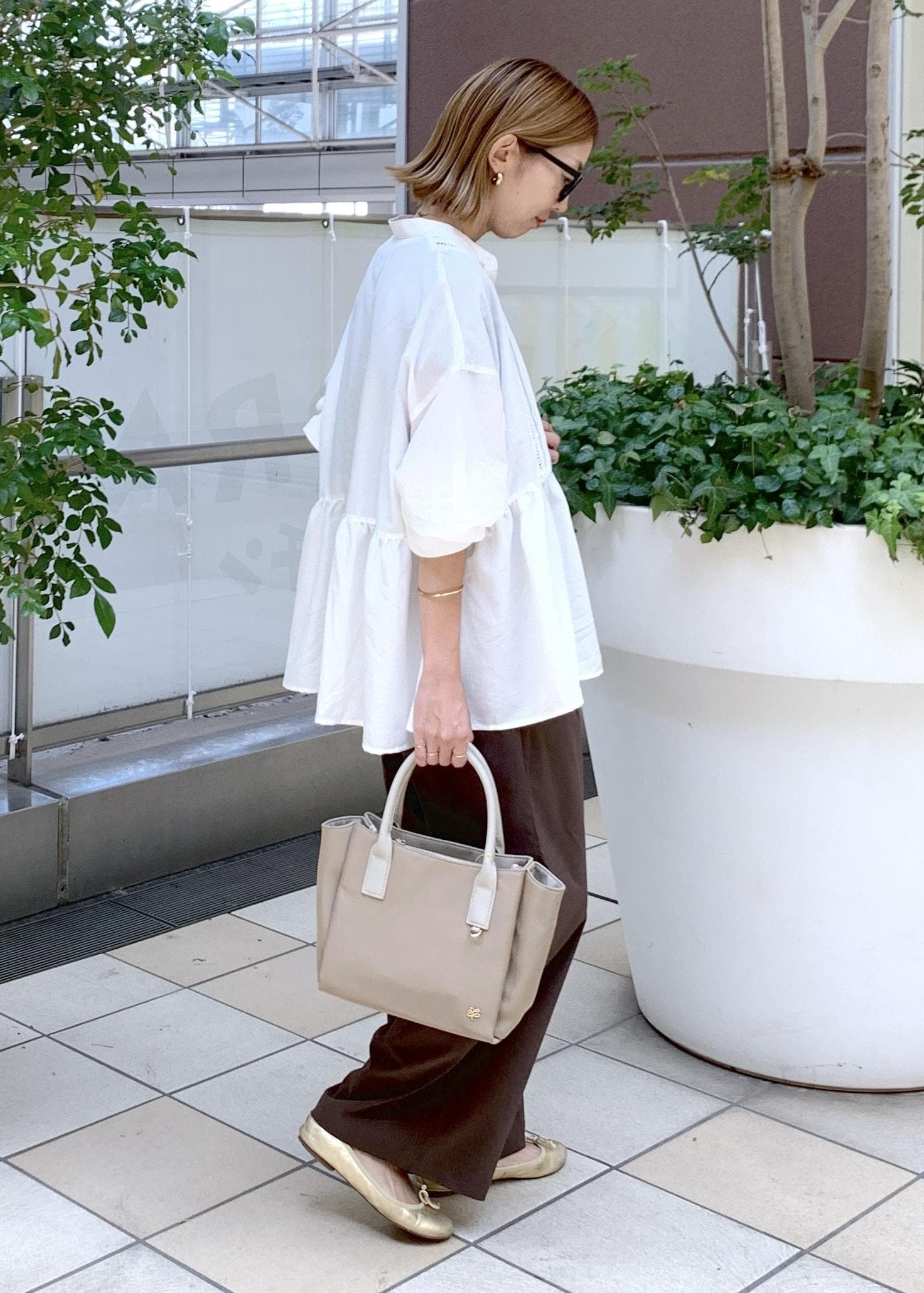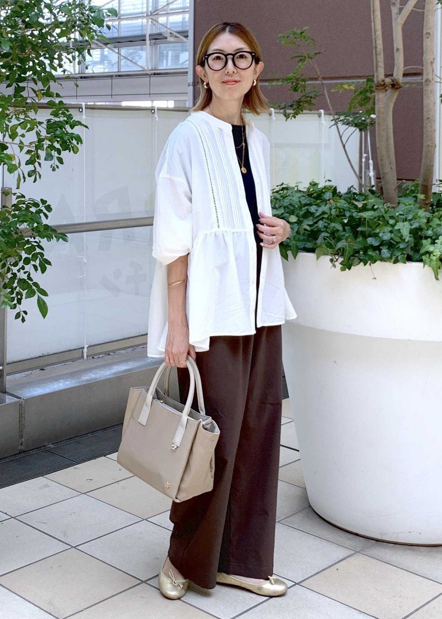 春も人気だったペプラムシャツの秋素材、秋カラーを使ったシンプルな大人スタイリング