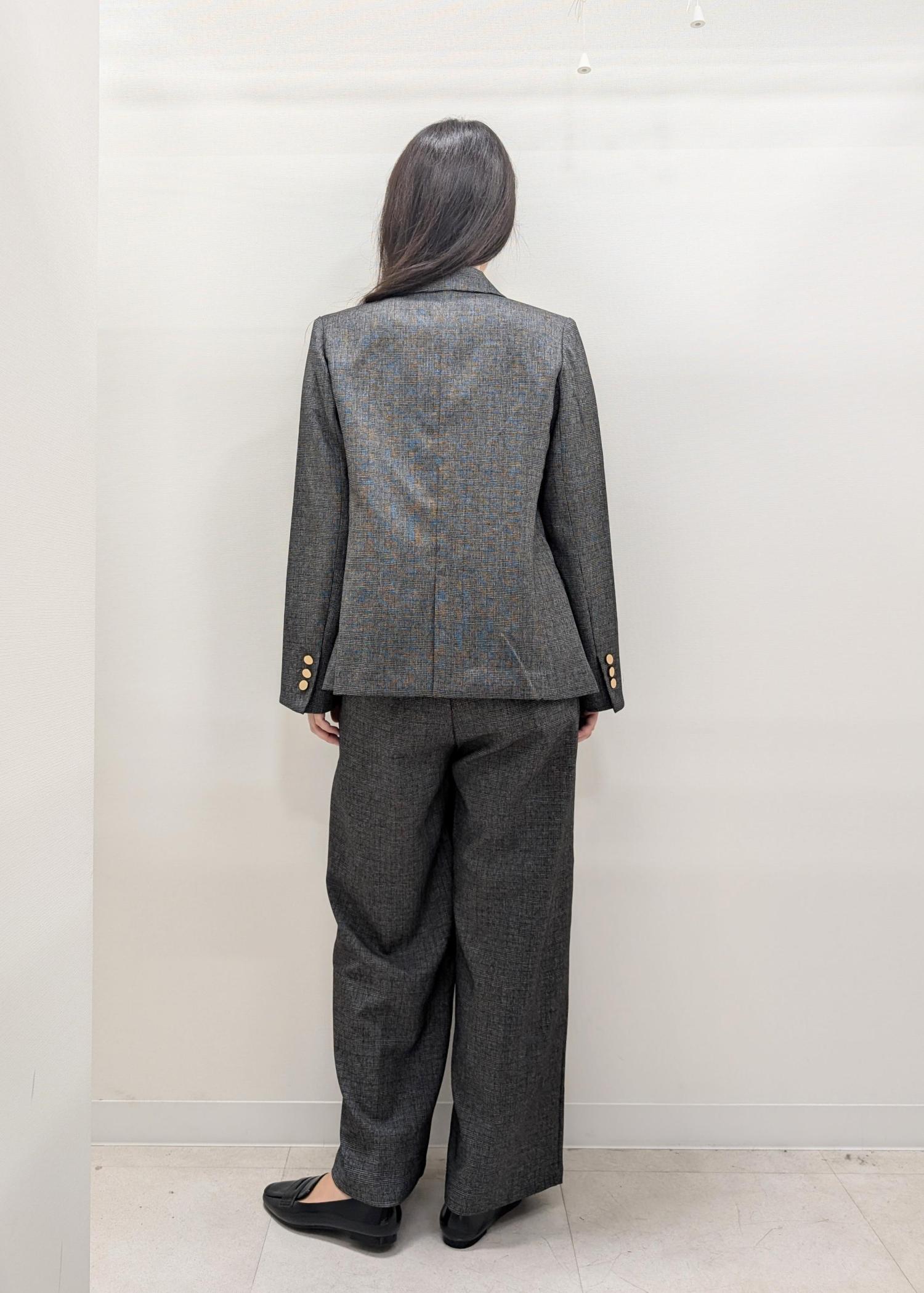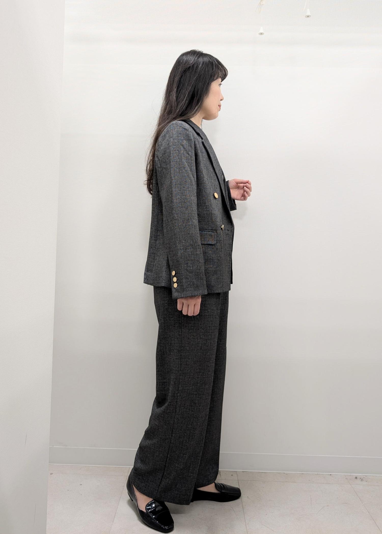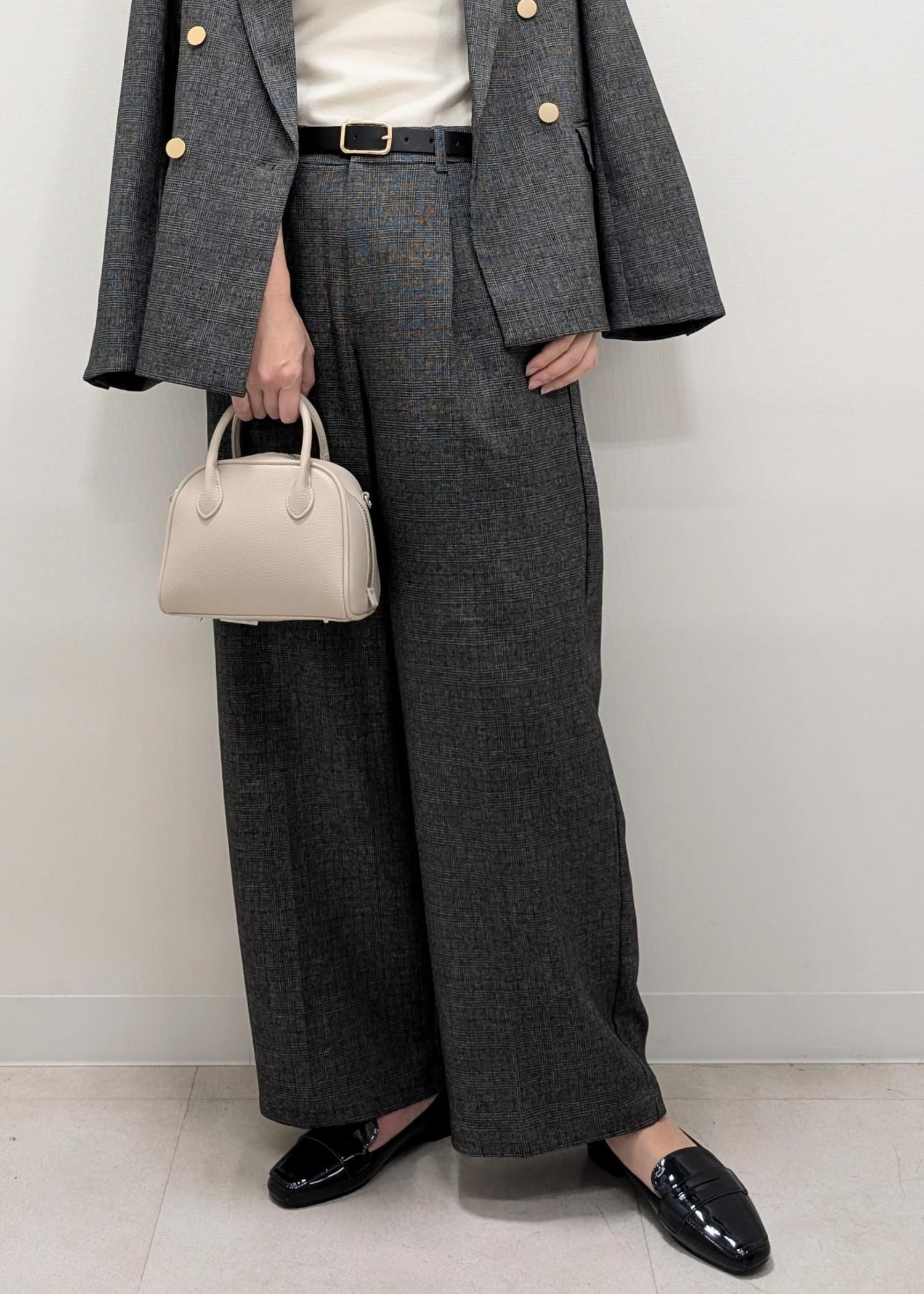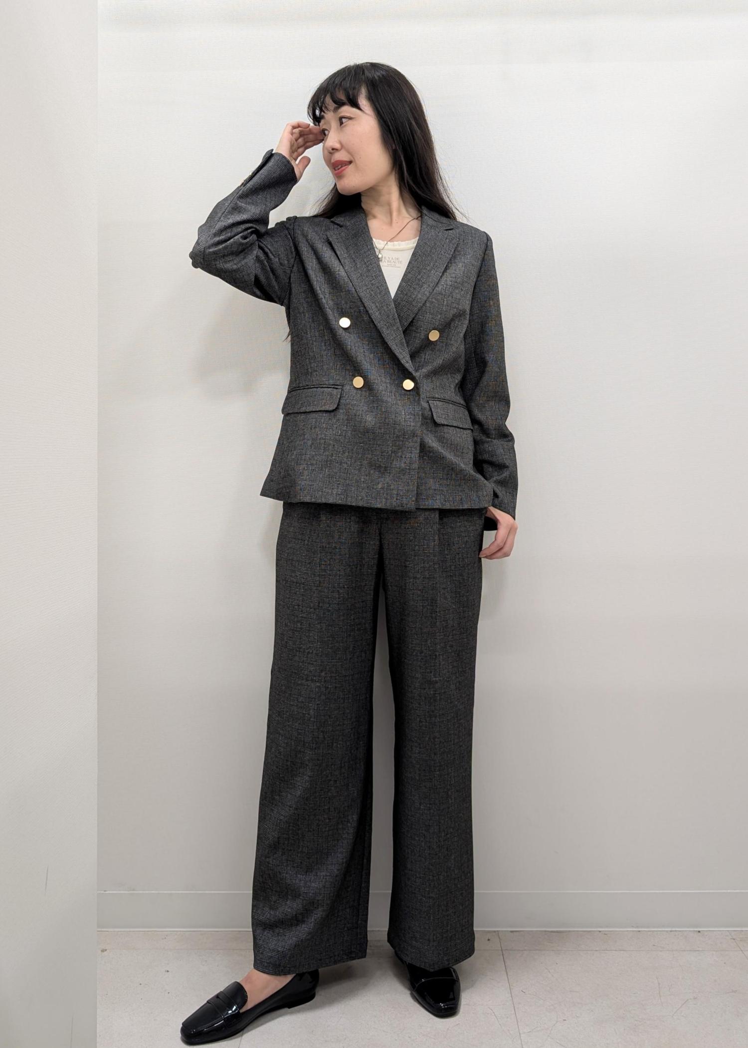 格好良さのあるセットアップのインナーをタンクトップにすることで、女っぽさもあるコーディネートにしました。