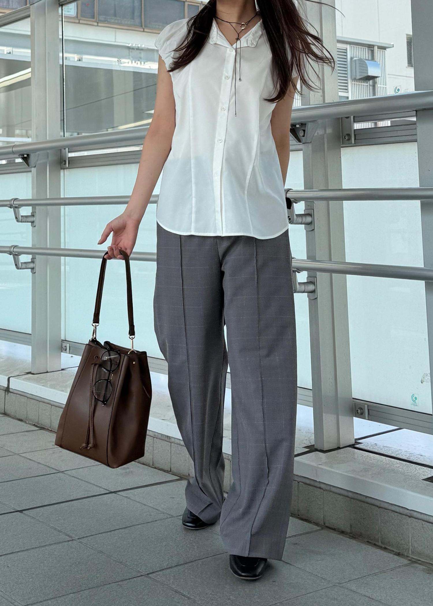 白ブラウスとチェックのパンツにローファーミュールを合わせたマニッシュなコーディネートです。