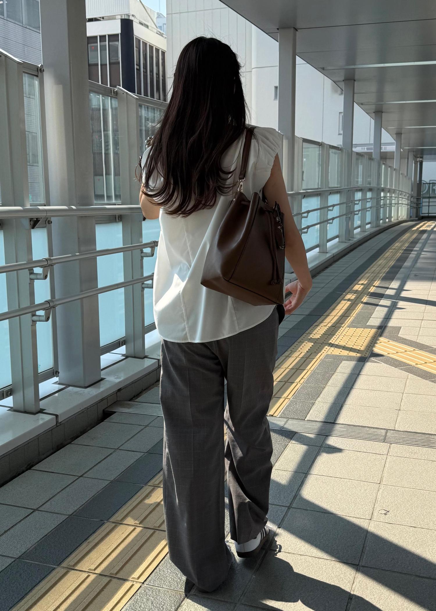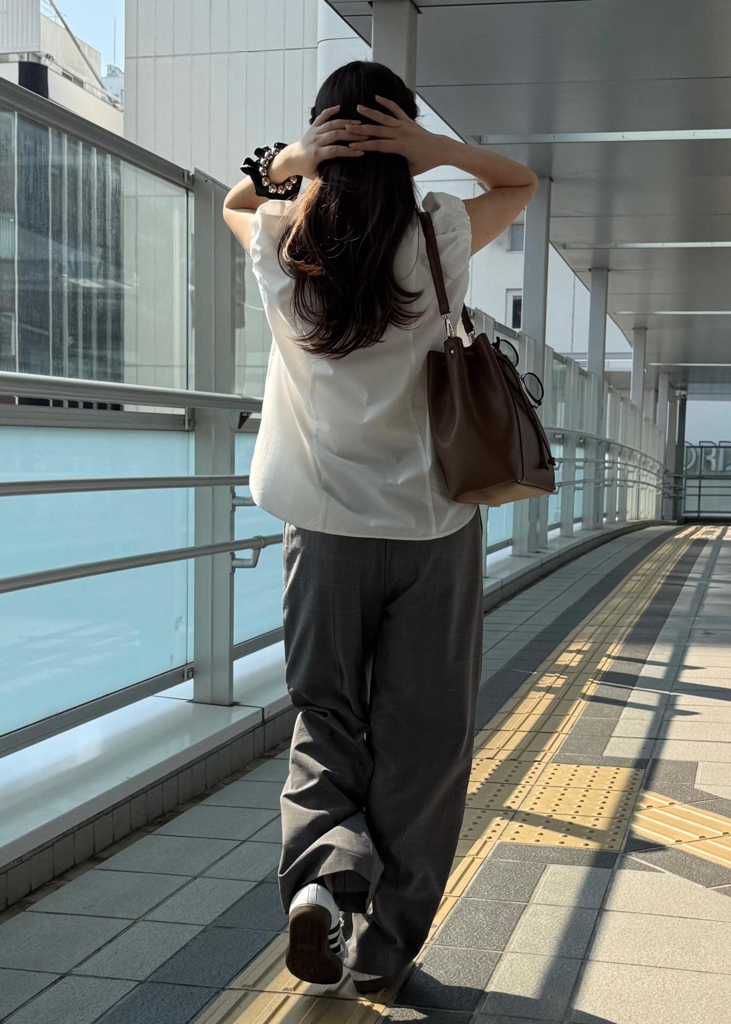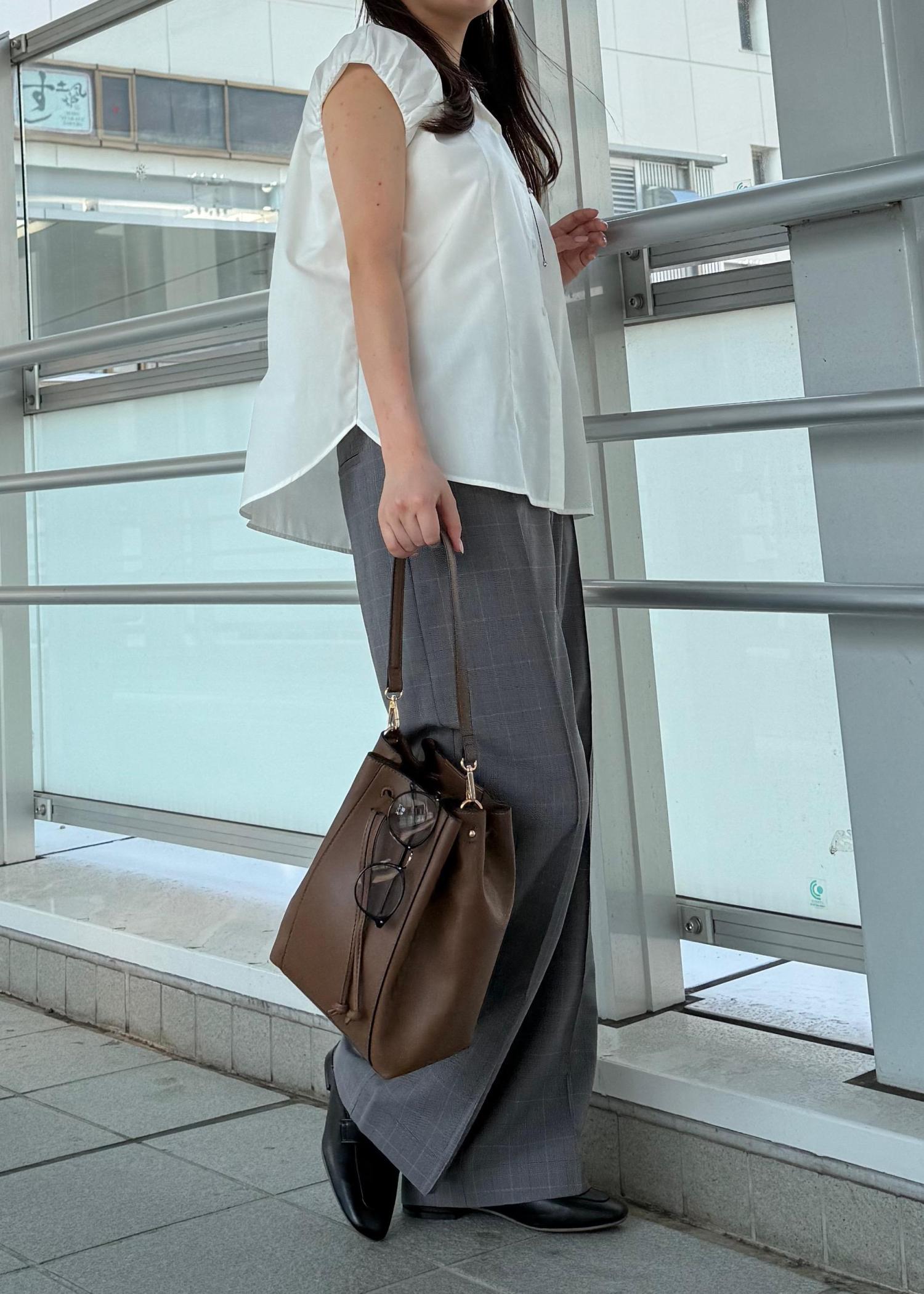 バッグとシューズの色味を合わせ、統一感を出しています。