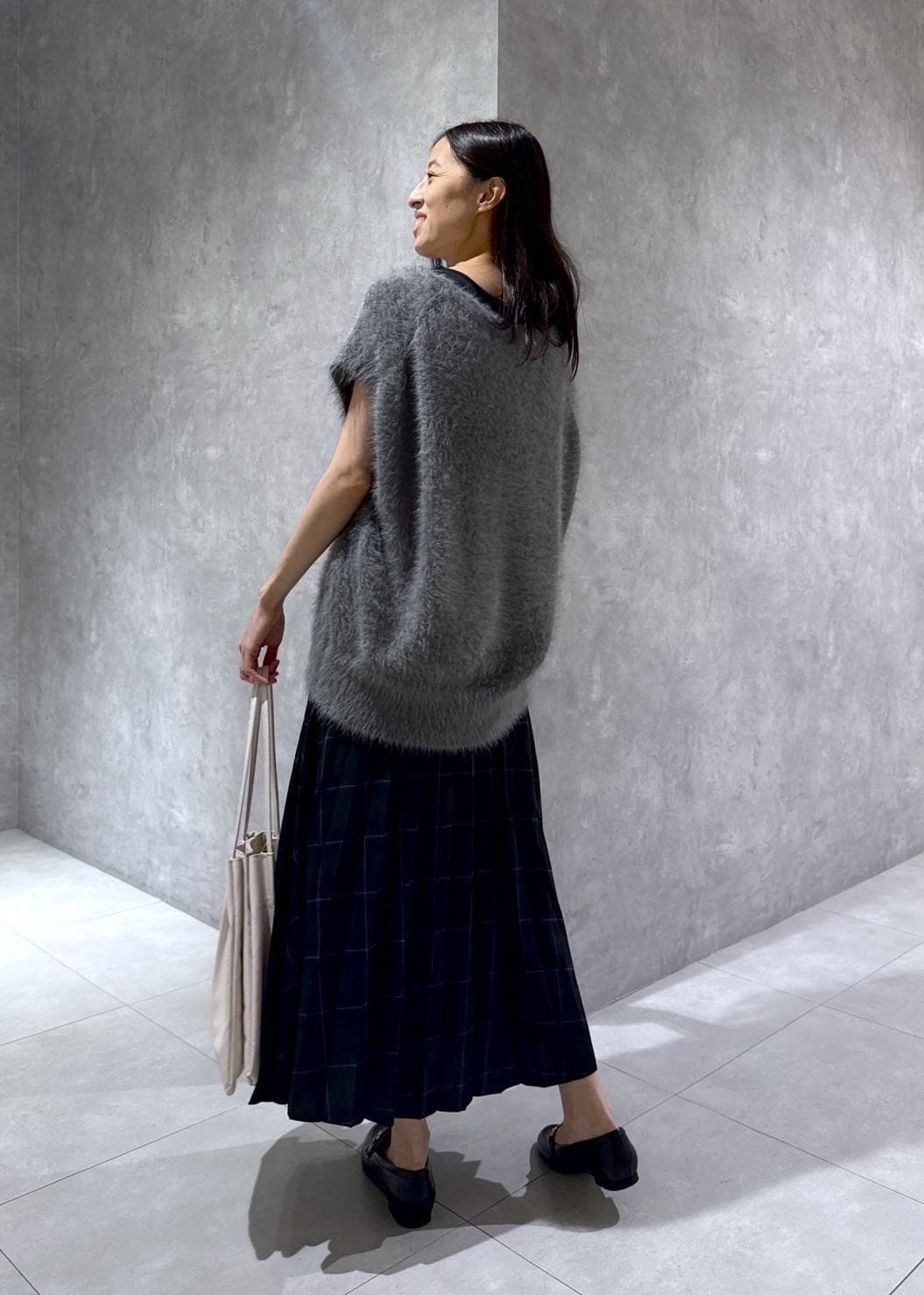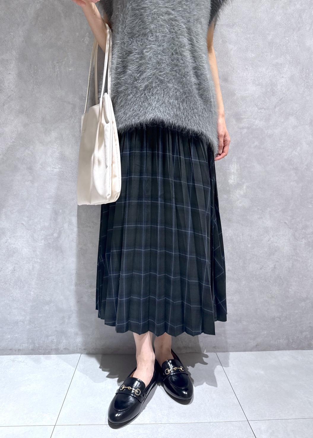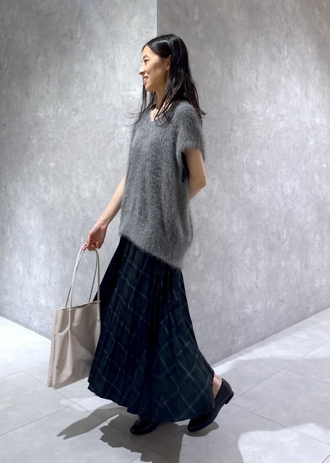 ふんわりしたフェザーニットに、チェック柄のスカートを取り入れた秋のお出かけコーデづくり。