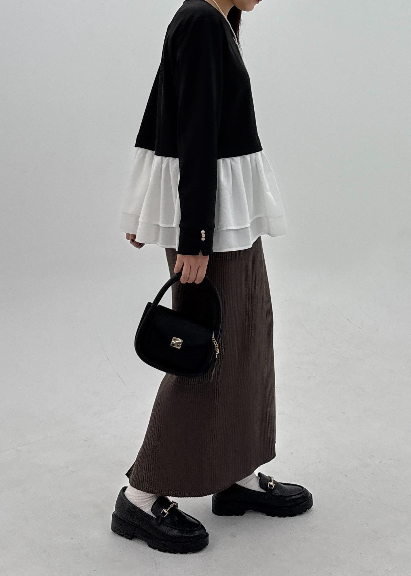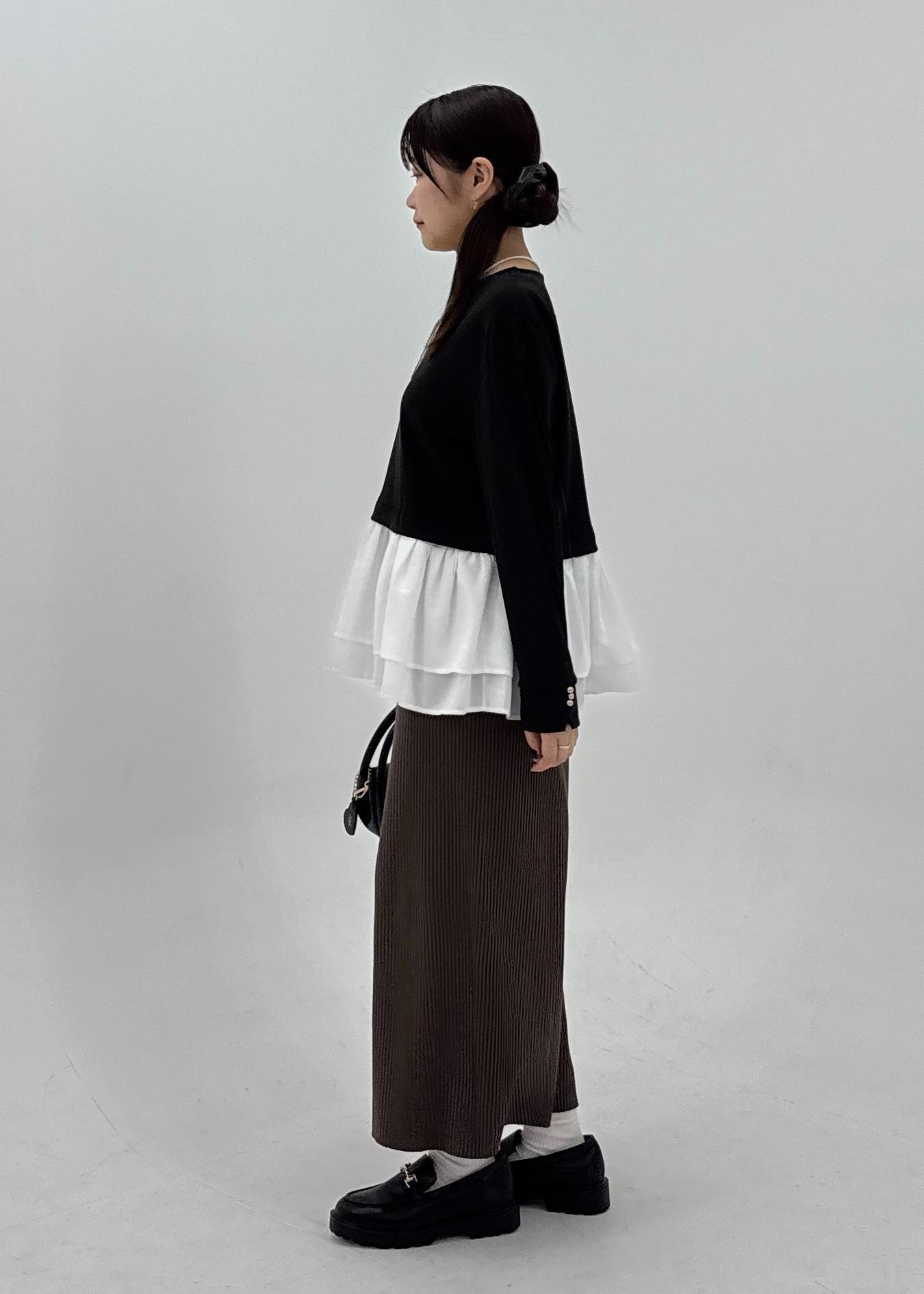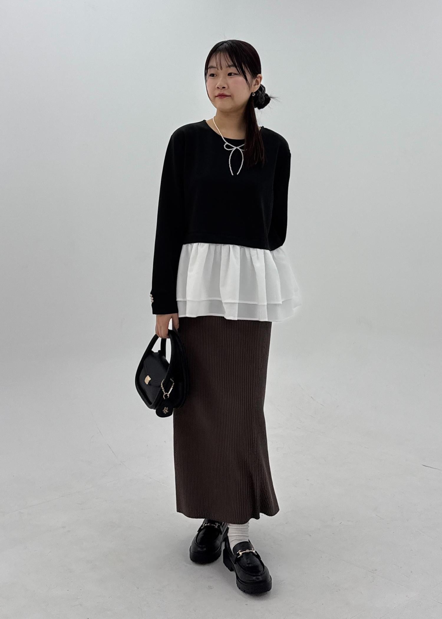 1枚で着映えるトップスを主役に、暗めのカラーで合わせたシックなコーディネートです。