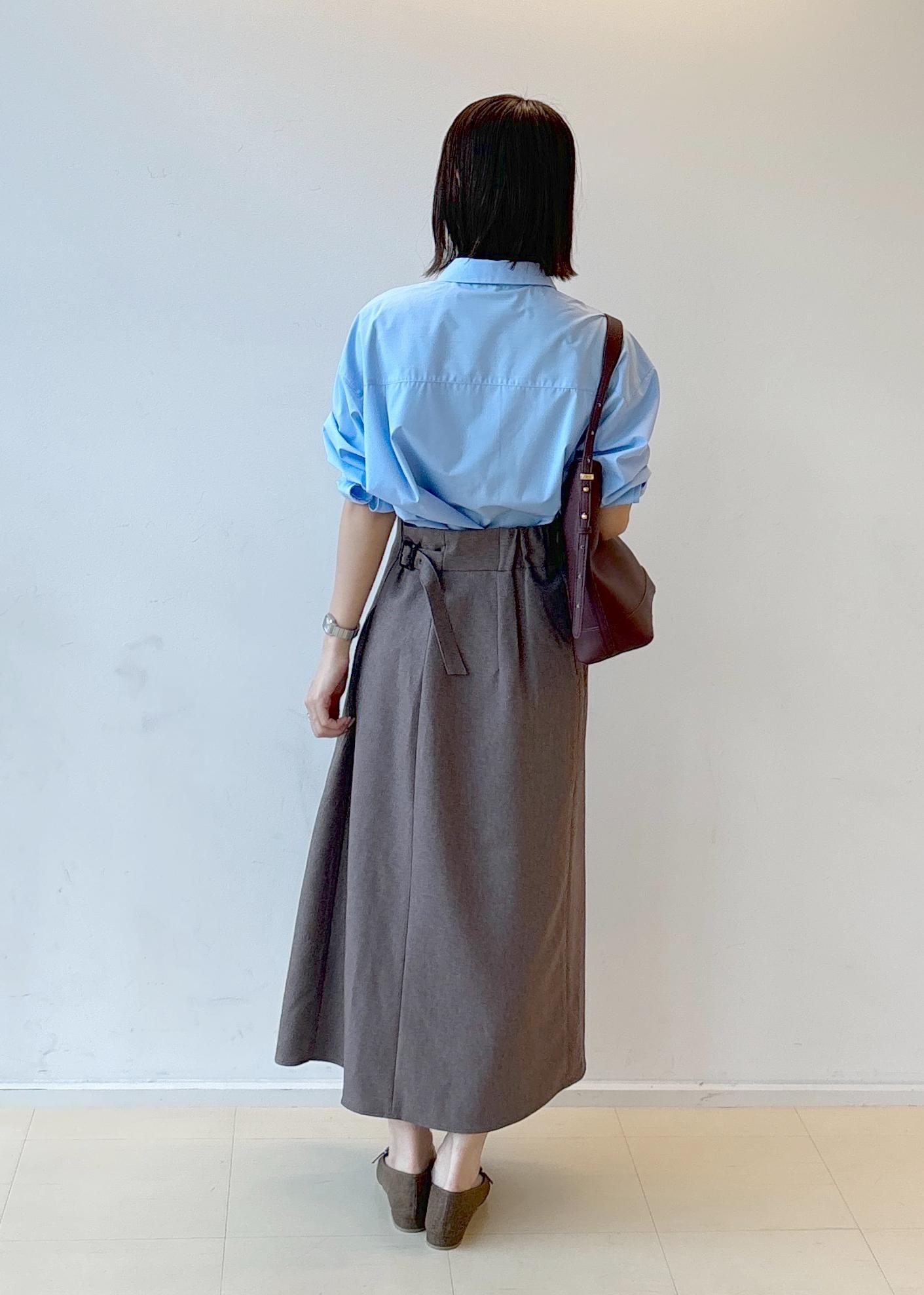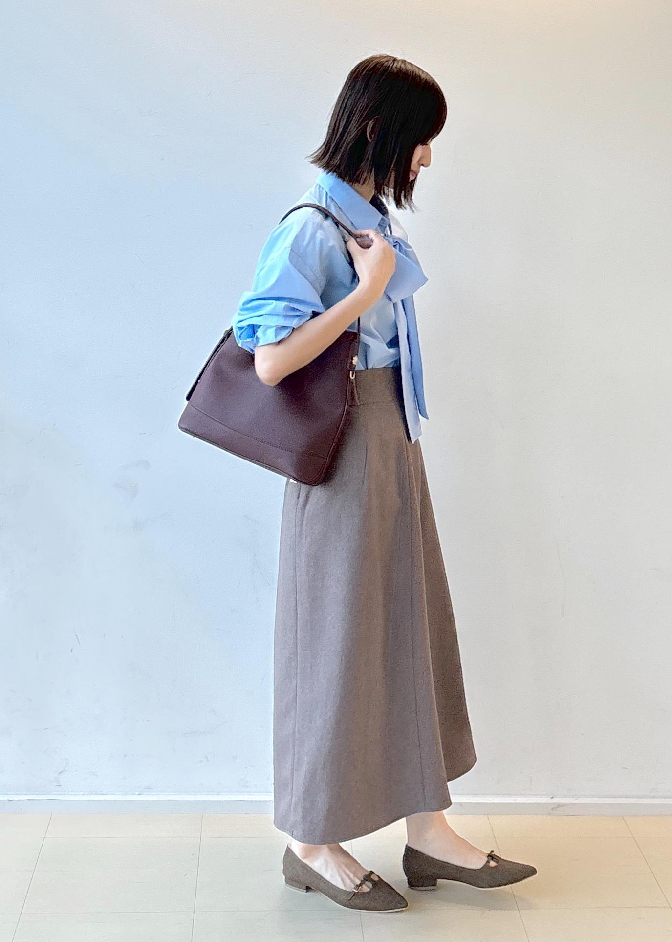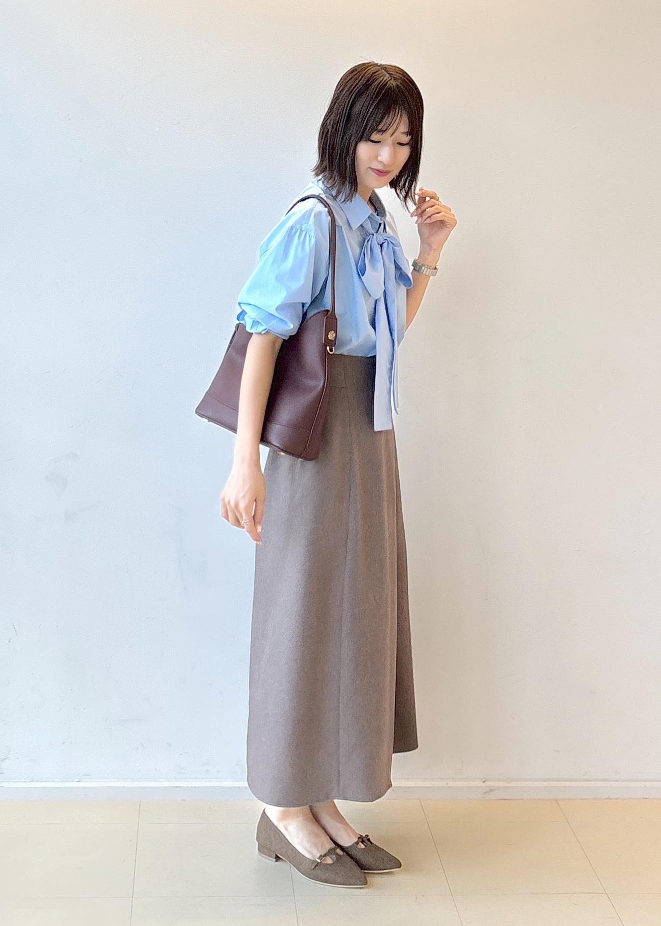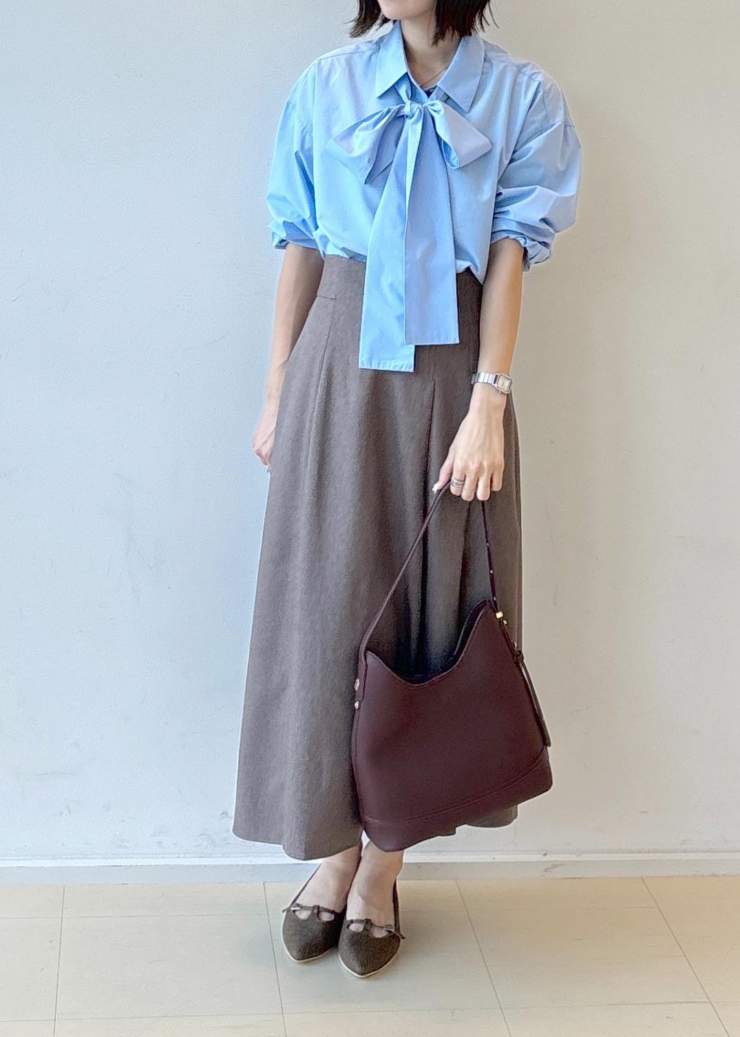 水色のブラウスを合わせて秋だけど爽やかな綺麗めスタイルにまとめました。