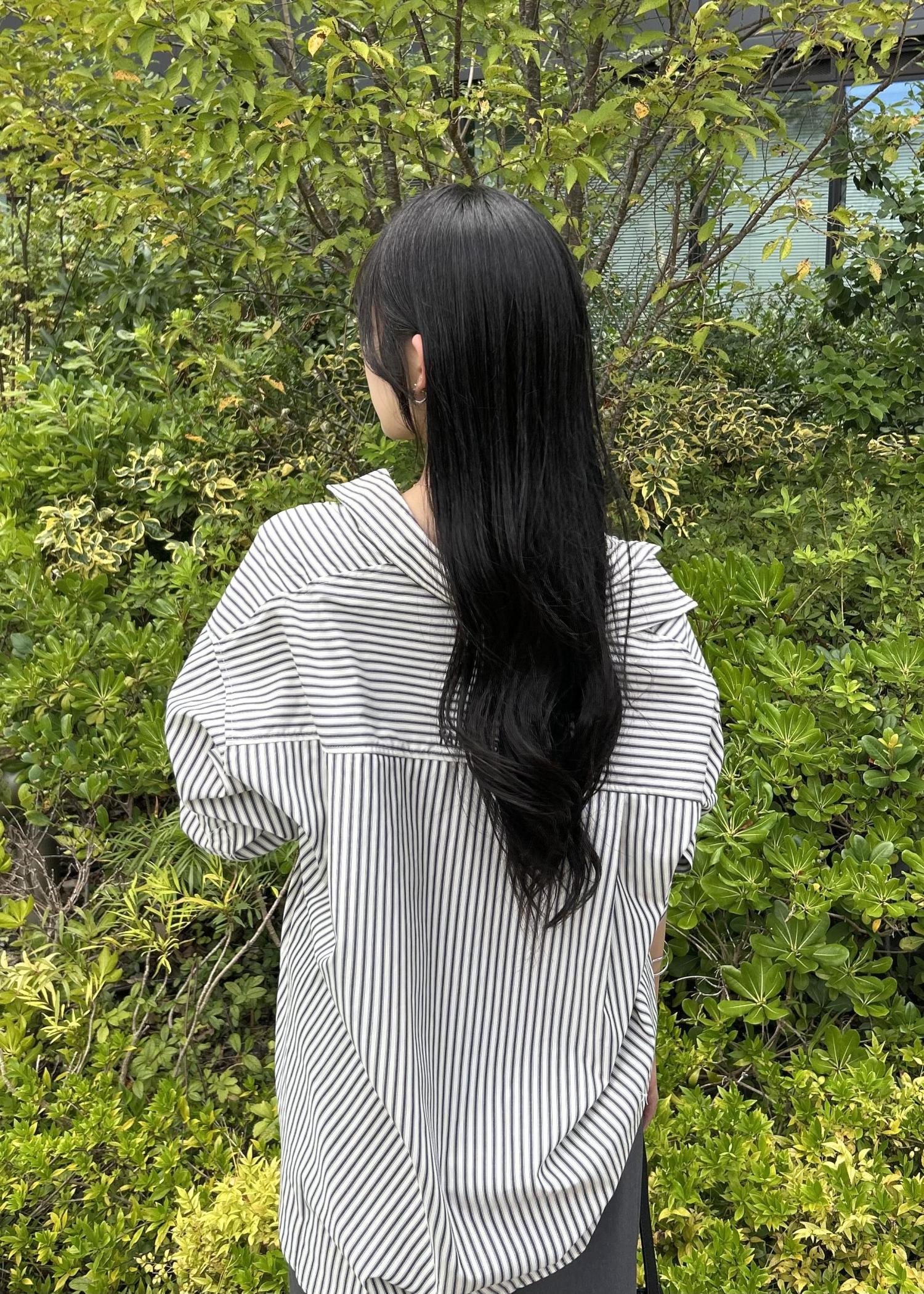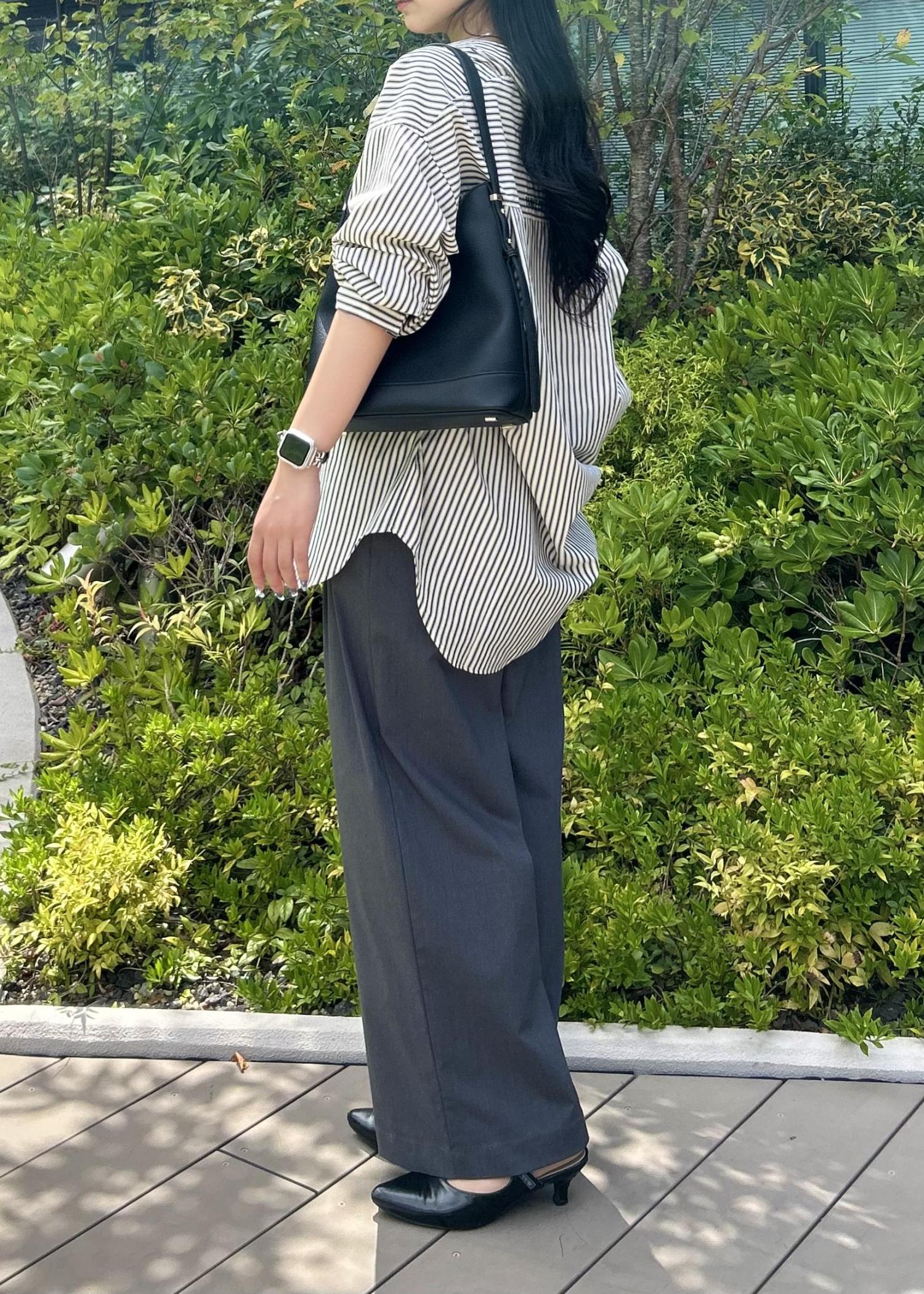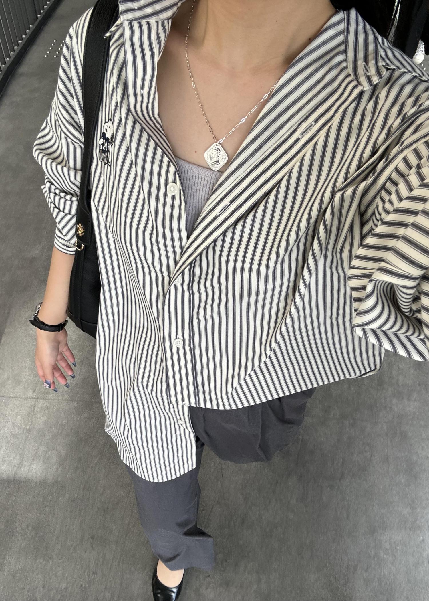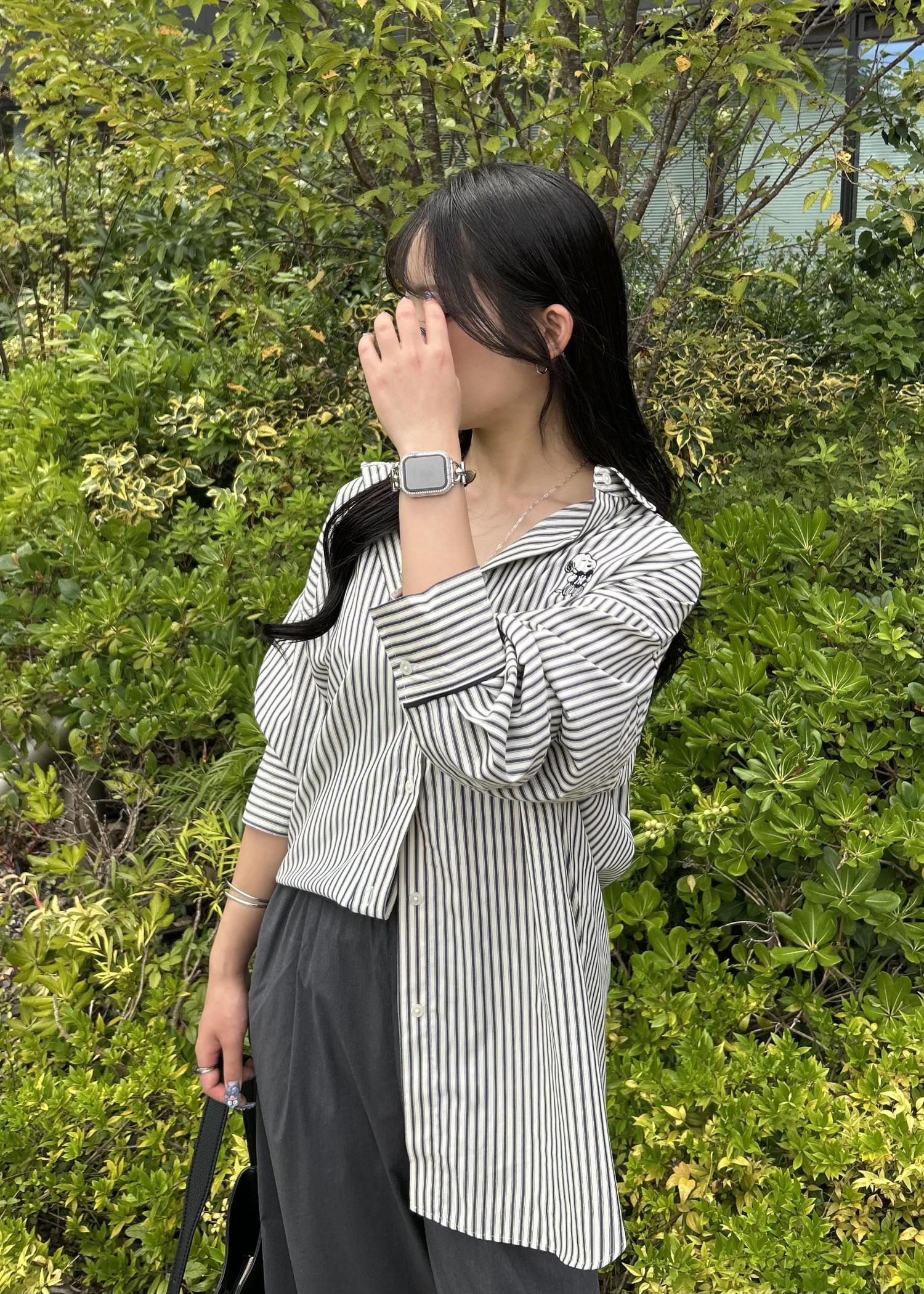 ストライプのシャツは肩の力を抜いて羽織っただけなのに、