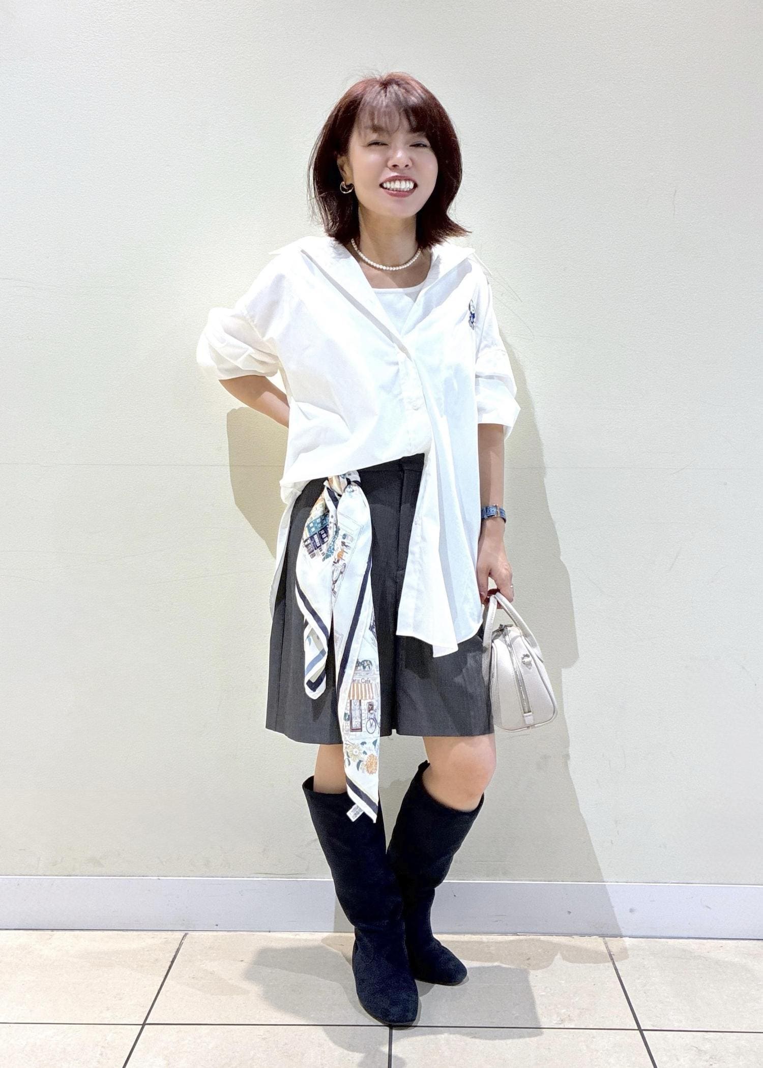 メンズライクなゆったりしたシャツをキュロット合わせでオトナかわいく。小物もチームカラーに合わせて統一感を出しました。ロングブーツで肌見せバランスを調整しました。ブーツは私物です。