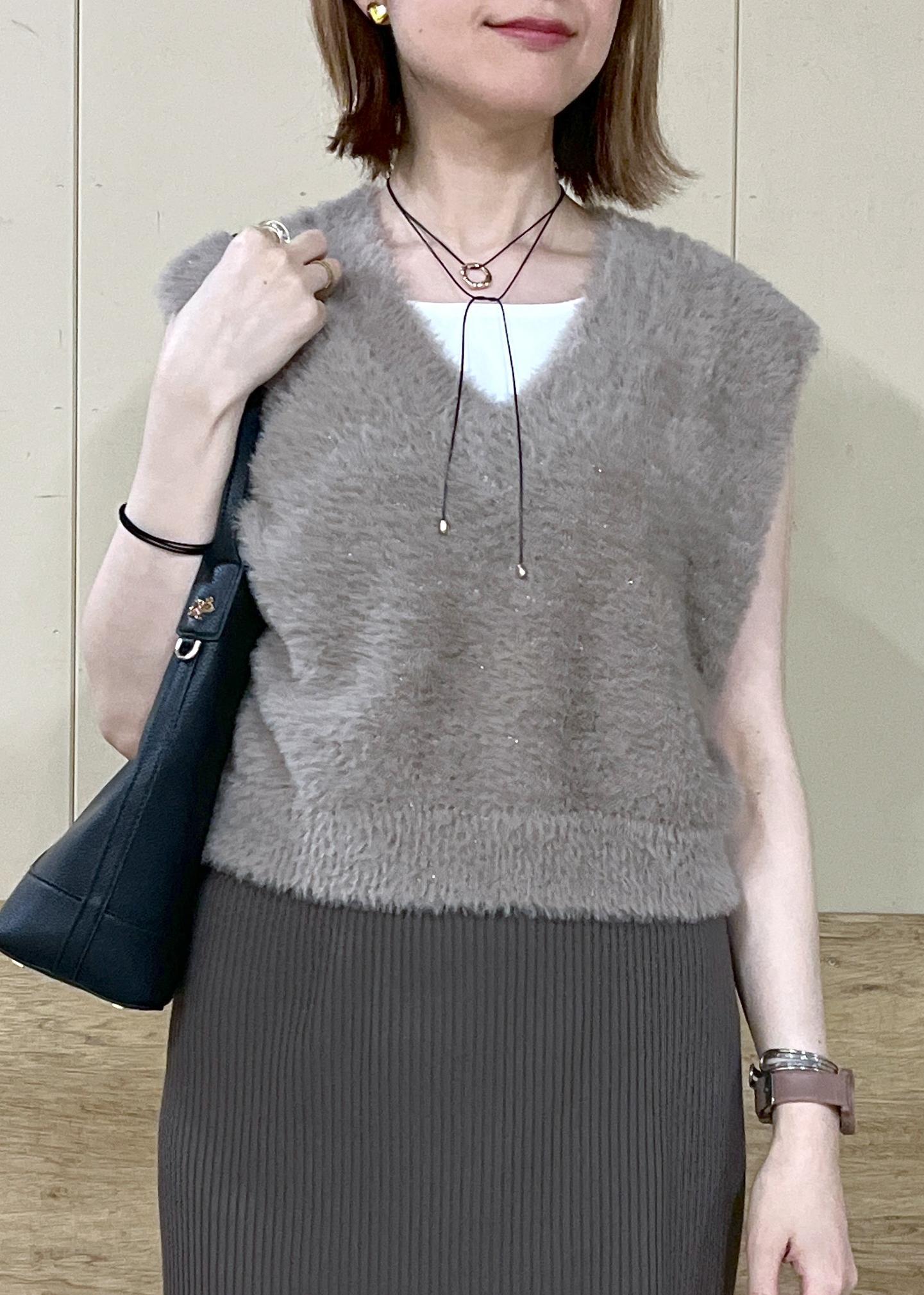 ROPÉ PICNICショートフェザーニットベストベージュ / F¥3,993レビューふわふわな素材感が女性らしさを引き立ててくれるフェザーニットベスト。